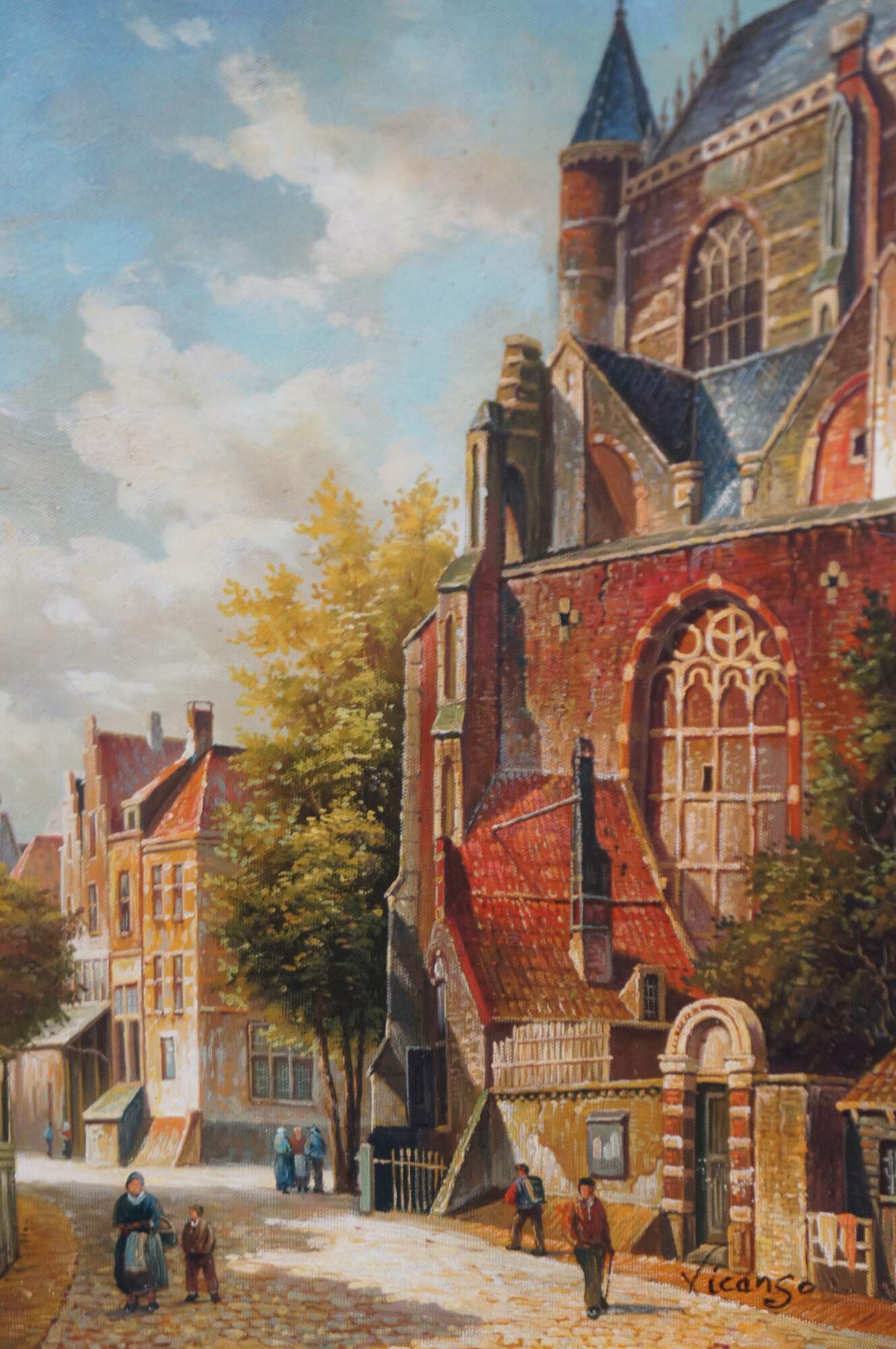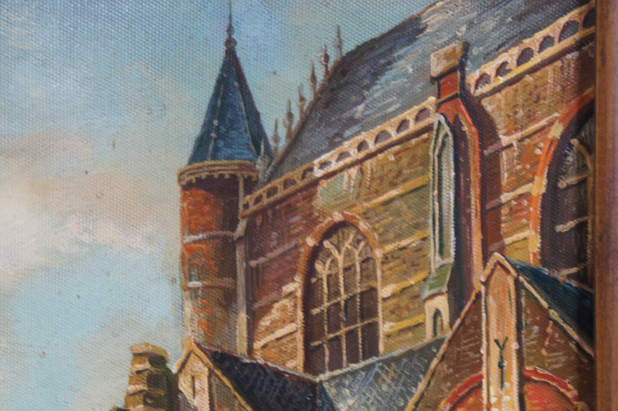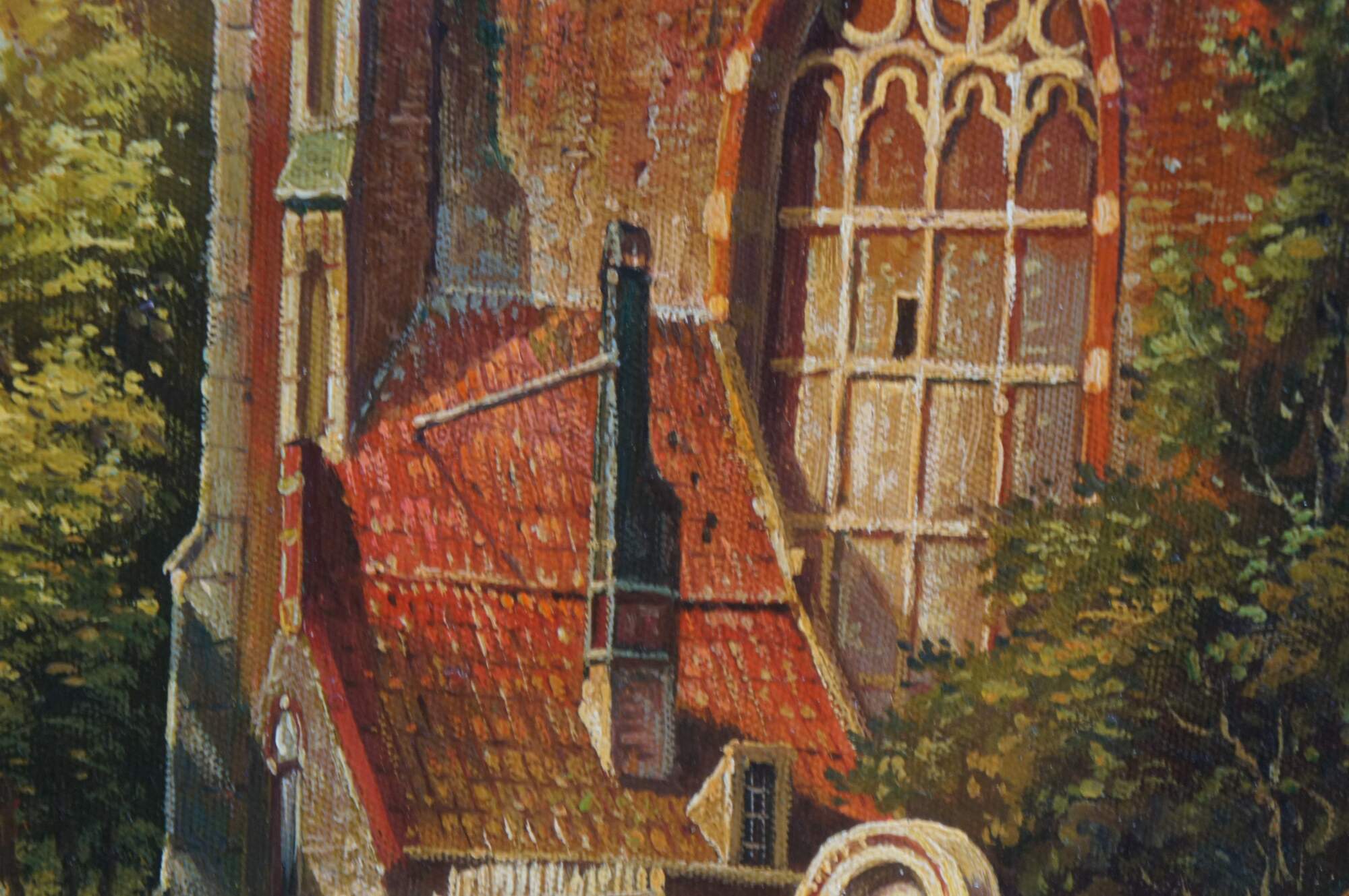 Late 20th Century Timeless Treasures European oil painting on canvas, signed lower right. The painting showcases a village with a large cathedral next to a cobblestone road with figures and houses in the background.