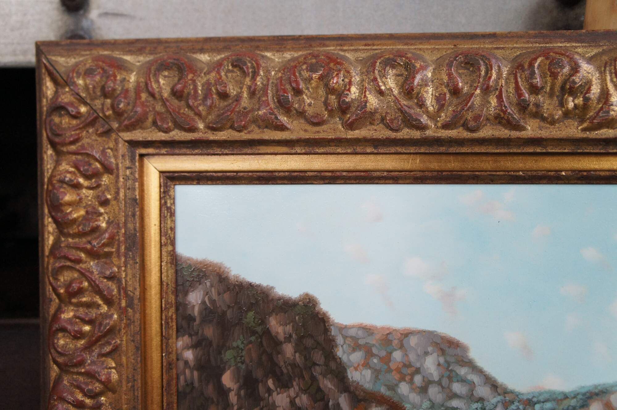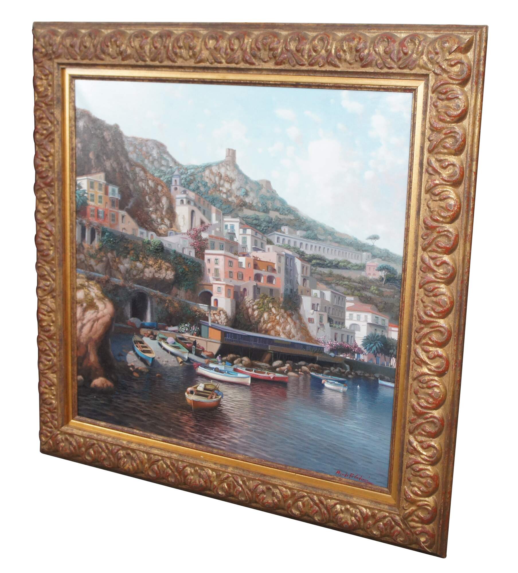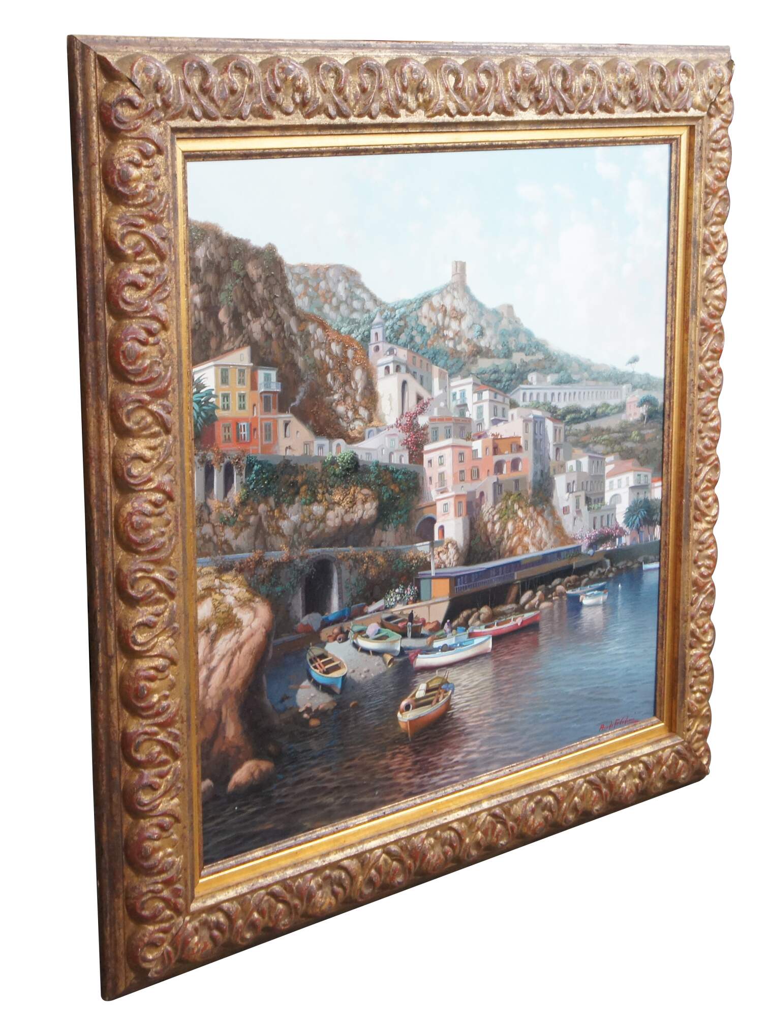 This large beautiful oil painting showcases a view of the stunning Almafi Coastline with colorful architecture along the cliffside overlooking the ocean full of boats below. The canvas is signed lower right and framed in wood with a raised baroque relief finished in gold.
