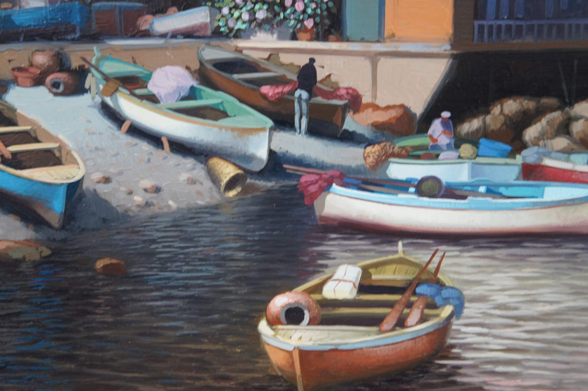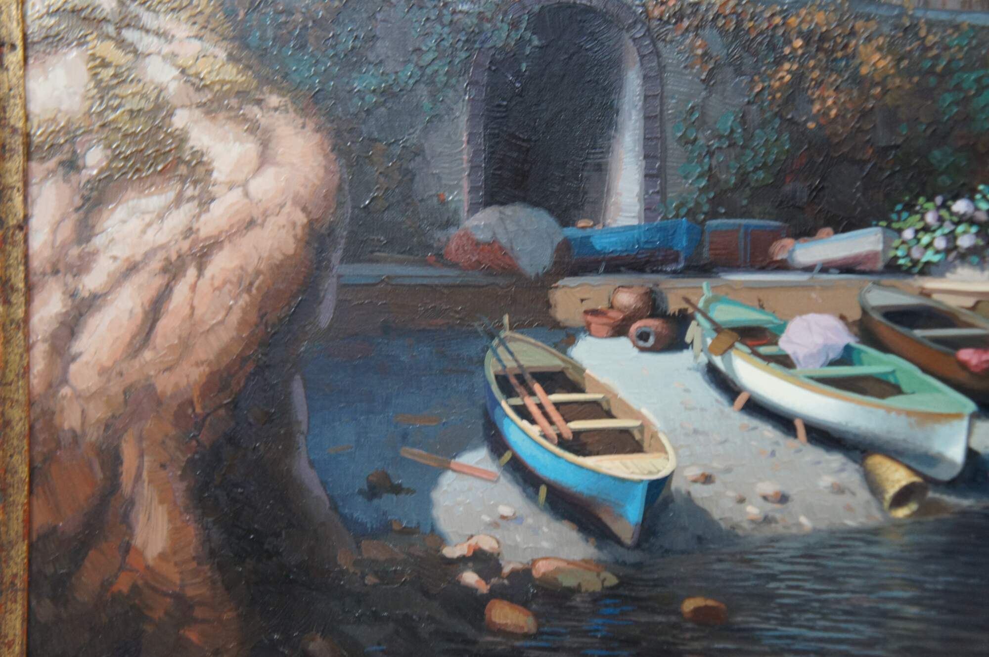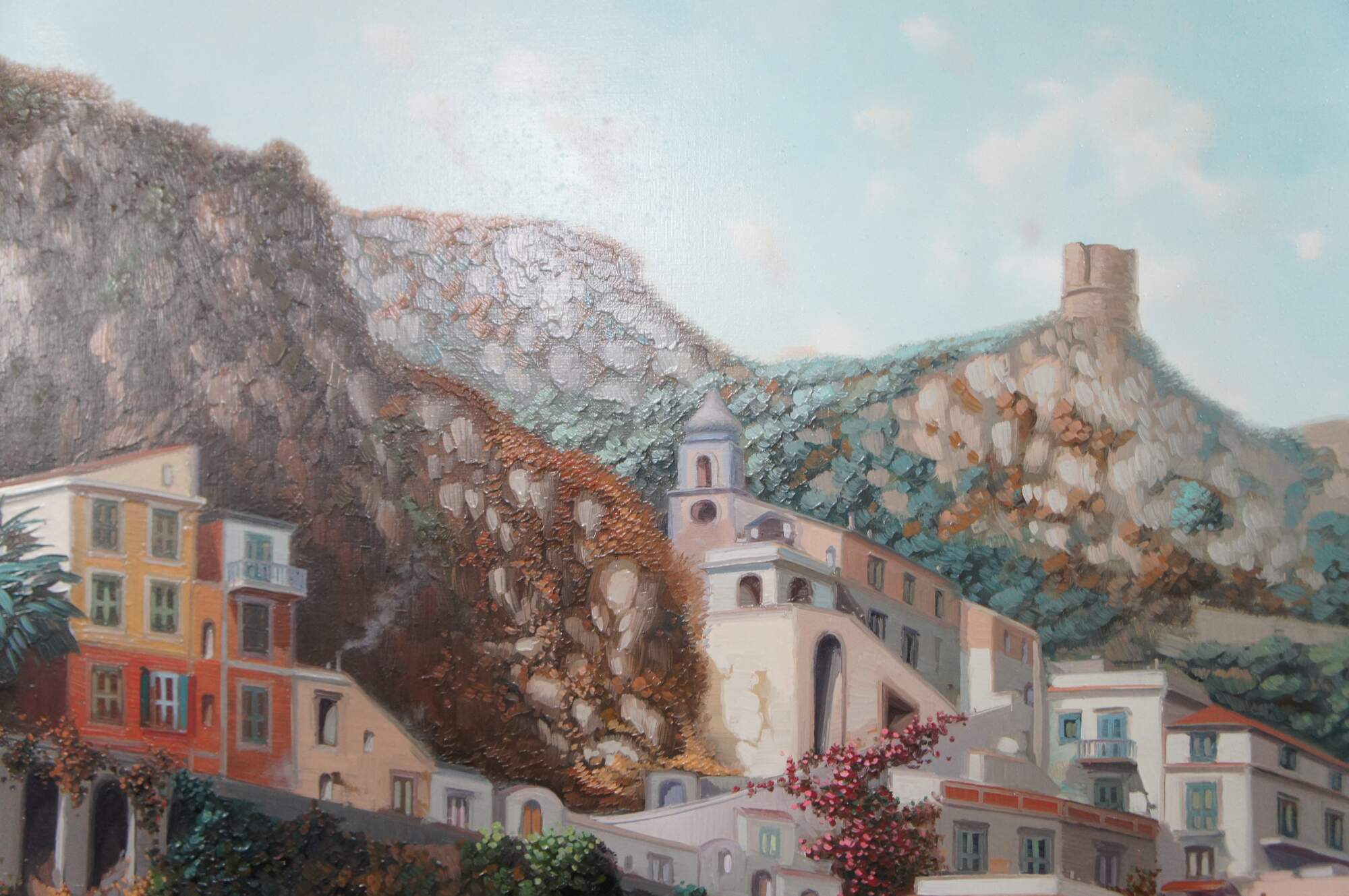 This large beautiful oil painting showcases a view of the stunning Almafi Coastline with colorful architecture along the cliffside overlooking the ocean full of boats below. The canvas is signed lower right and framed in wood with a raised baroque relief finished in gold.