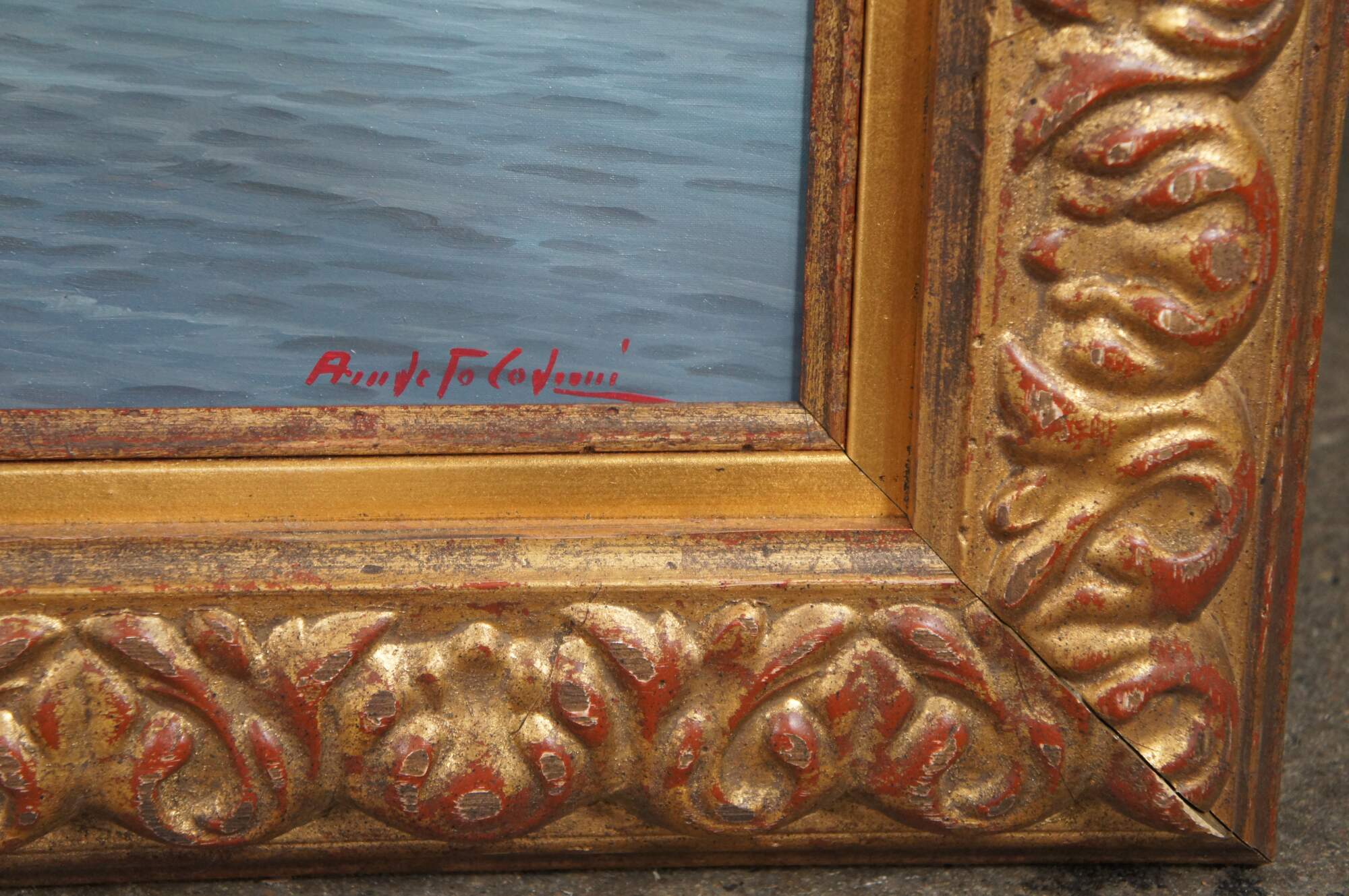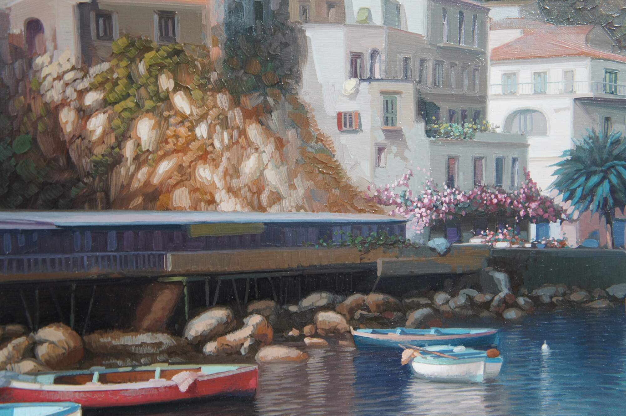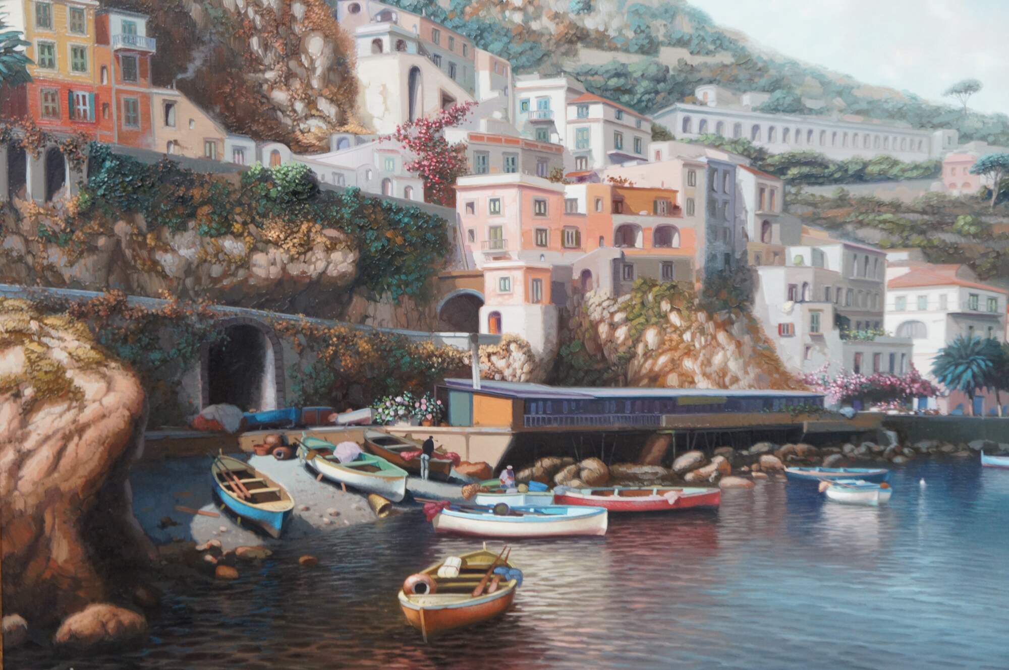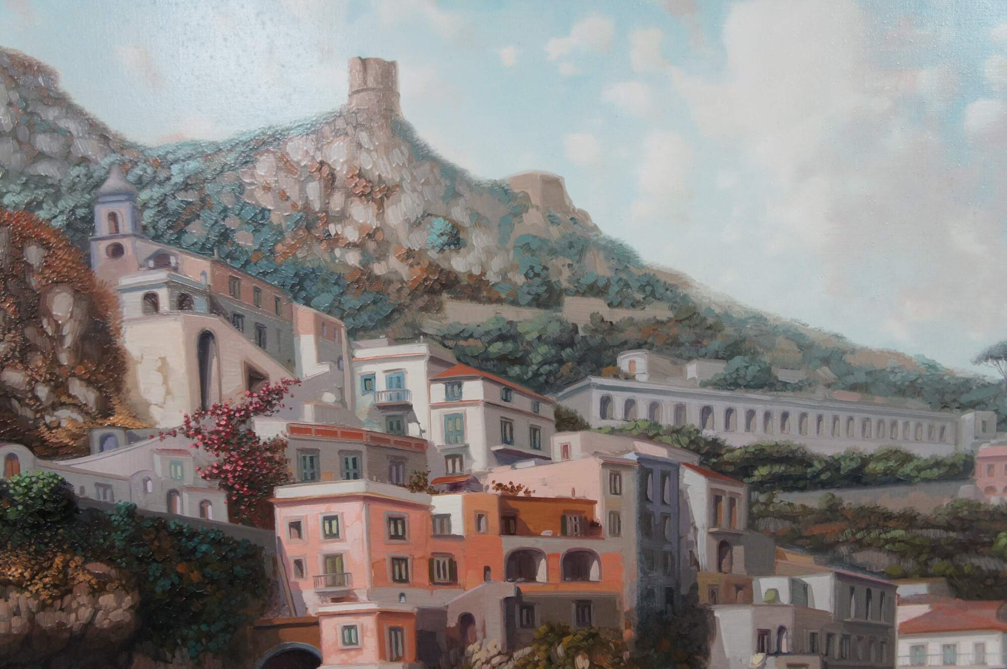 A breathtaking seascape/cityscape by the Italian Artist Amleto Colucci, born in 1953. Amleto was born in Naples Italy where he still lives and paints. He attended art school but attributes his style and influence to his painter father and his friends.