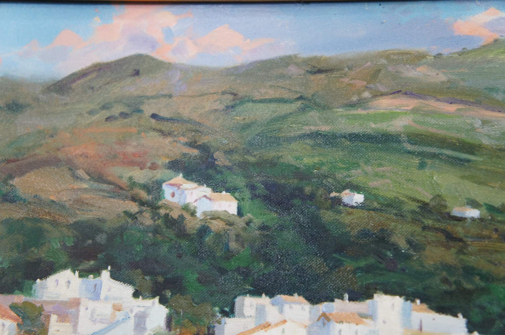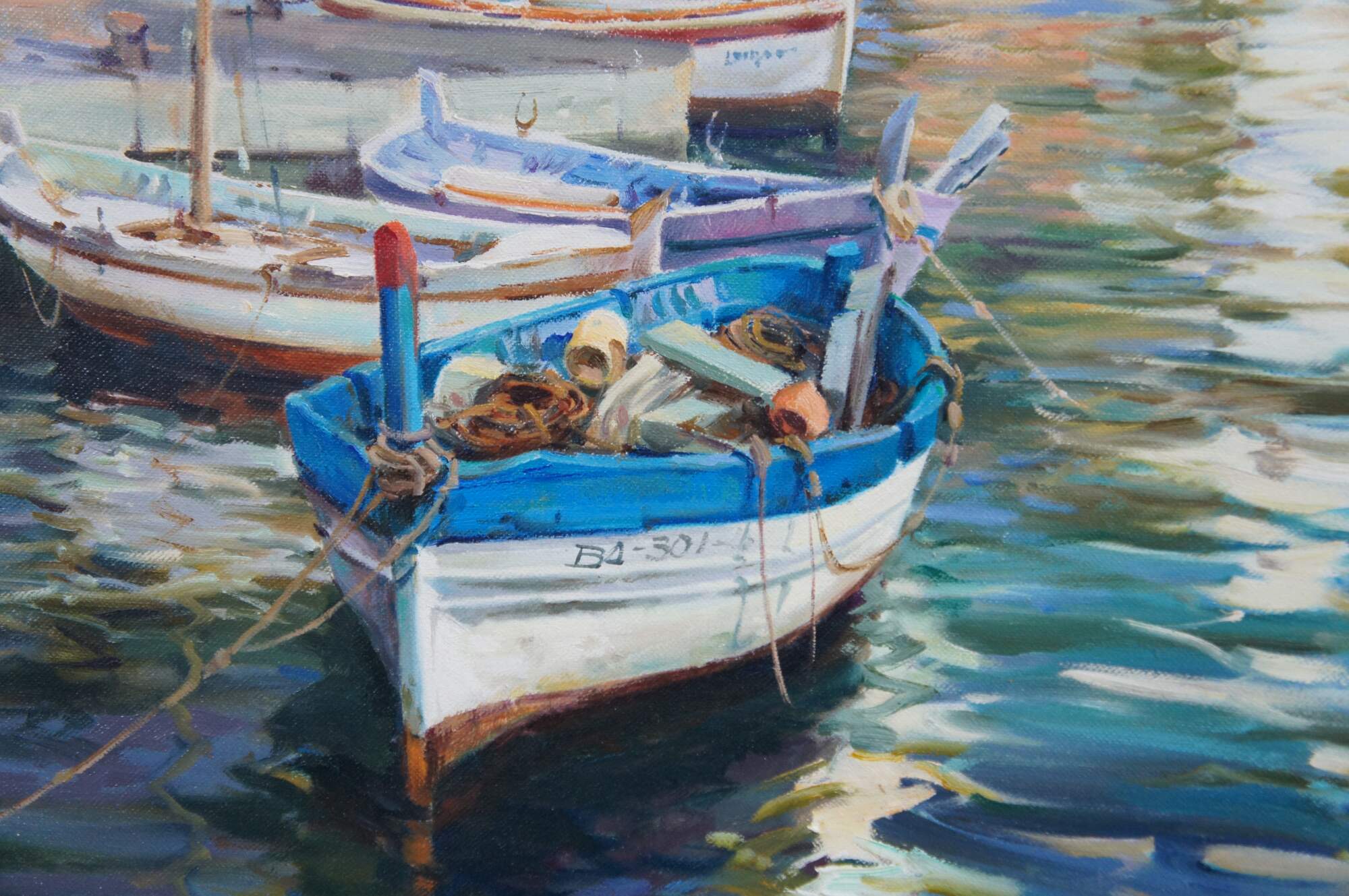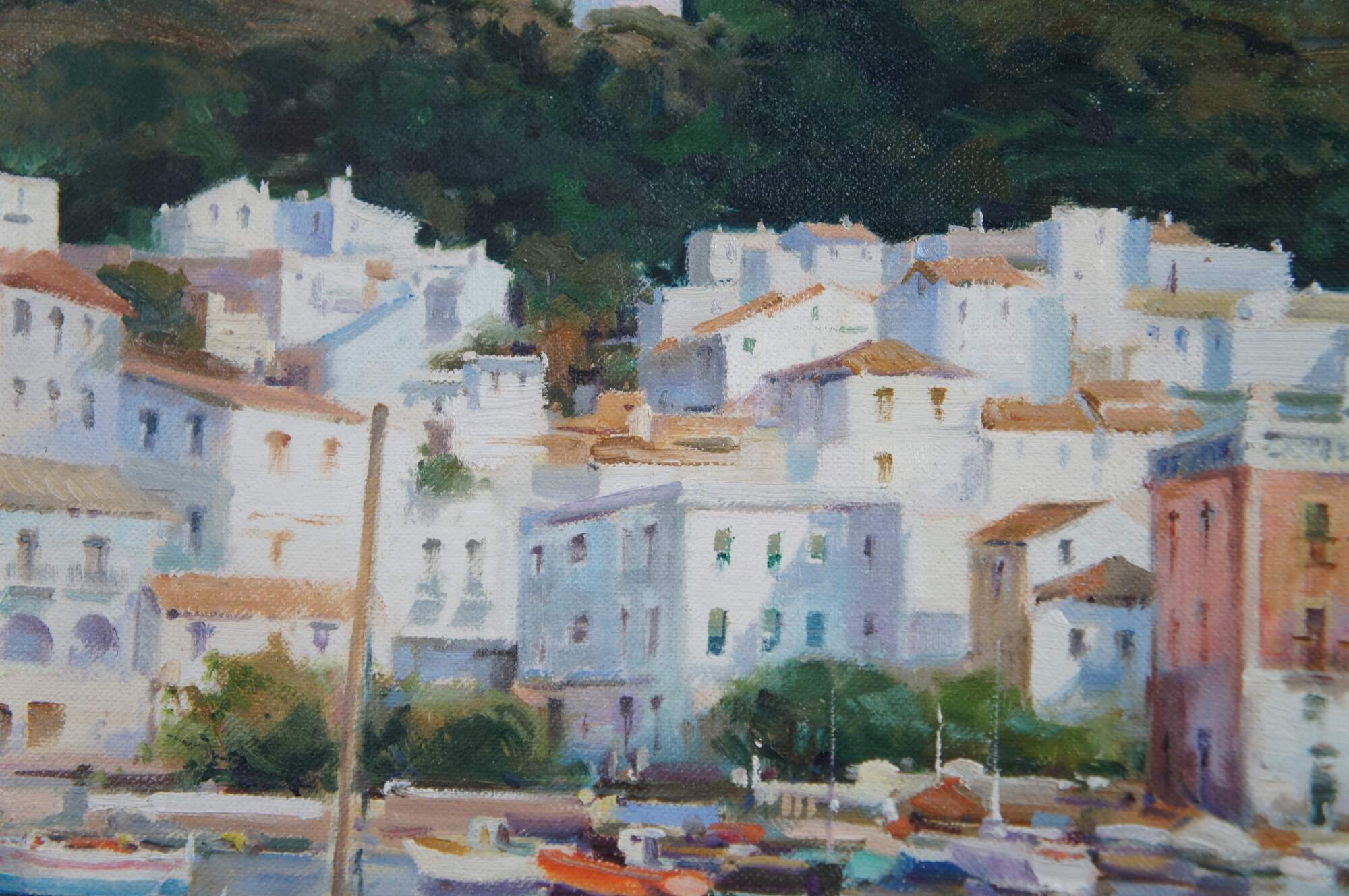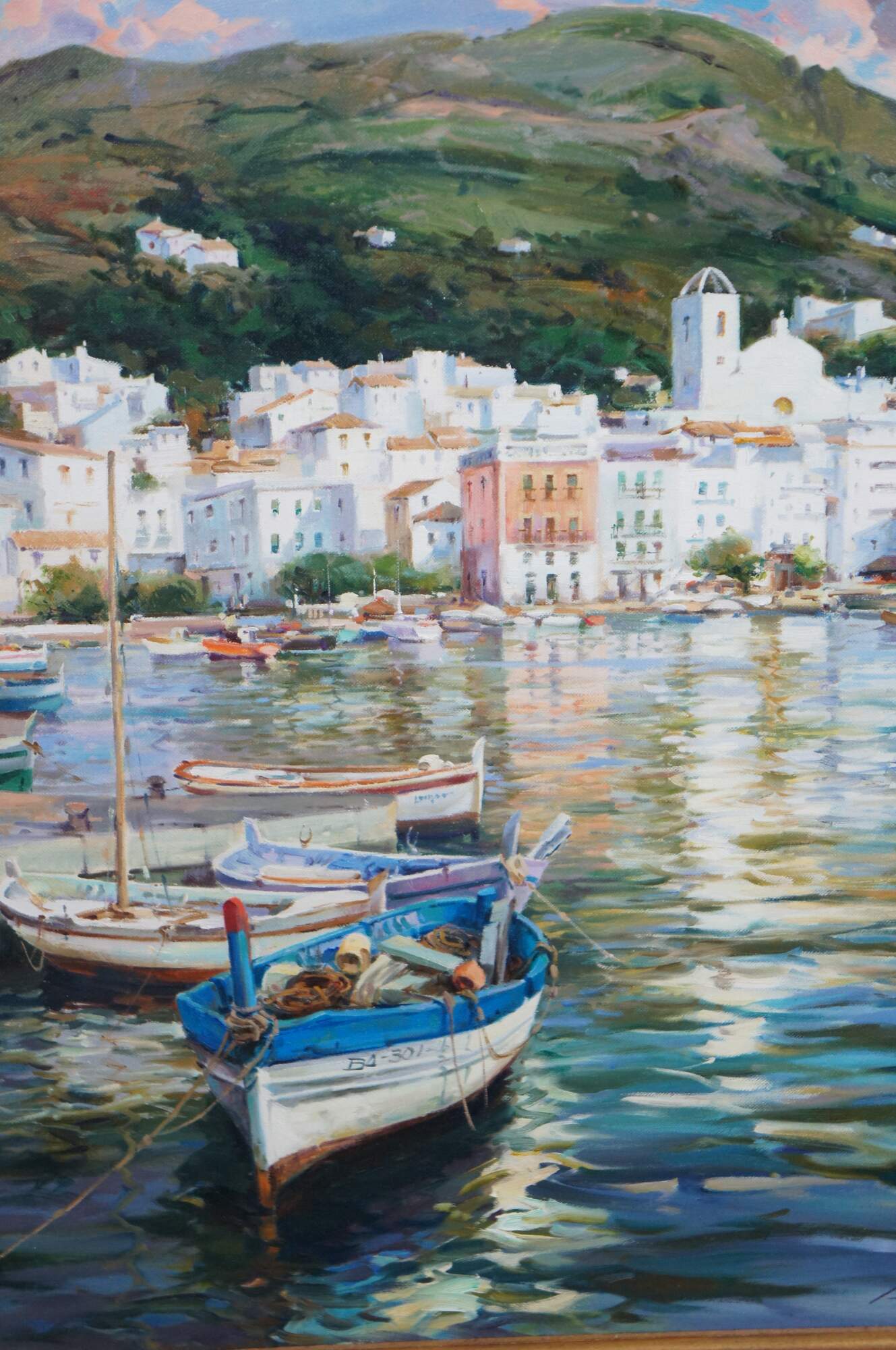 This exquisite oil painting by Salvador Caballero (1944-2006), a Spanish artist, captures the essence of Port De La Selva, a coastal gem in the Costa Brava region of northeastern Spain. The painting presents a panoramic coastal view from a dock or boat, with a vibrant architectural landscape adorning a prominent hillside. Fishing vessels and sailboats are elegantly docked within the harbour.