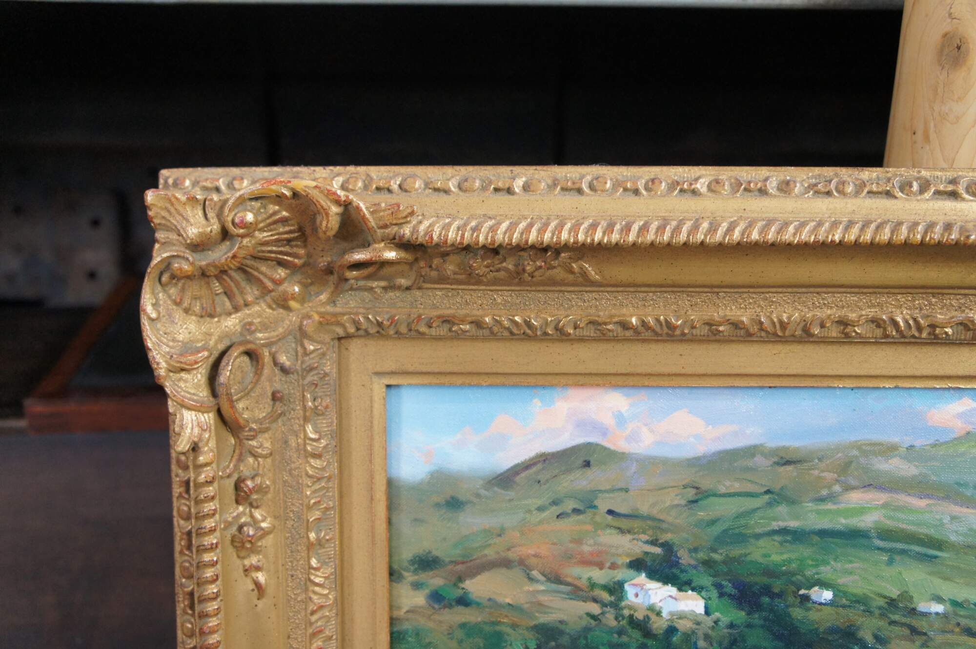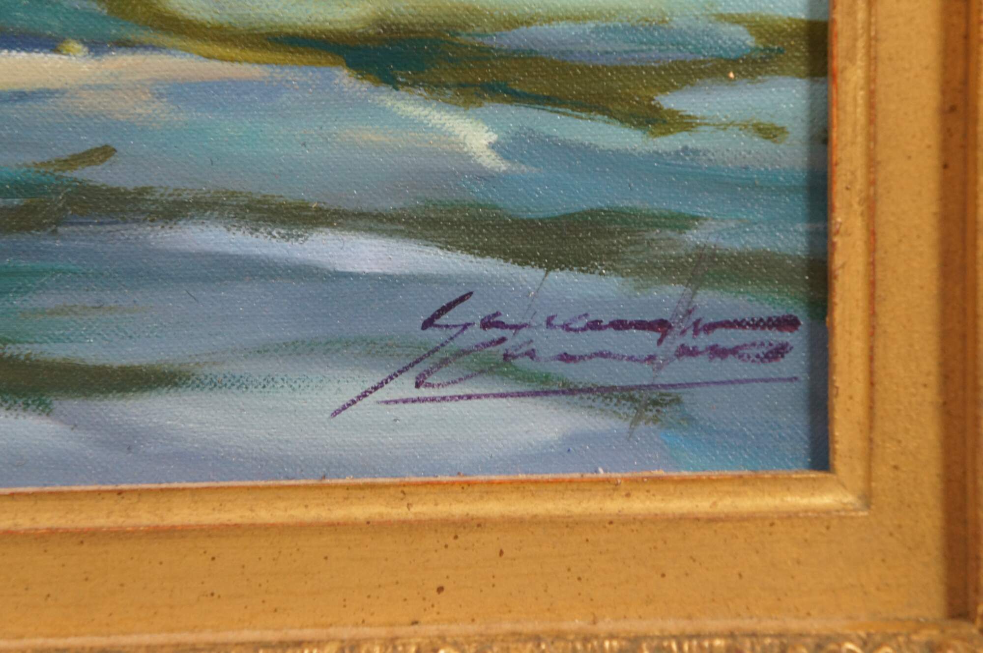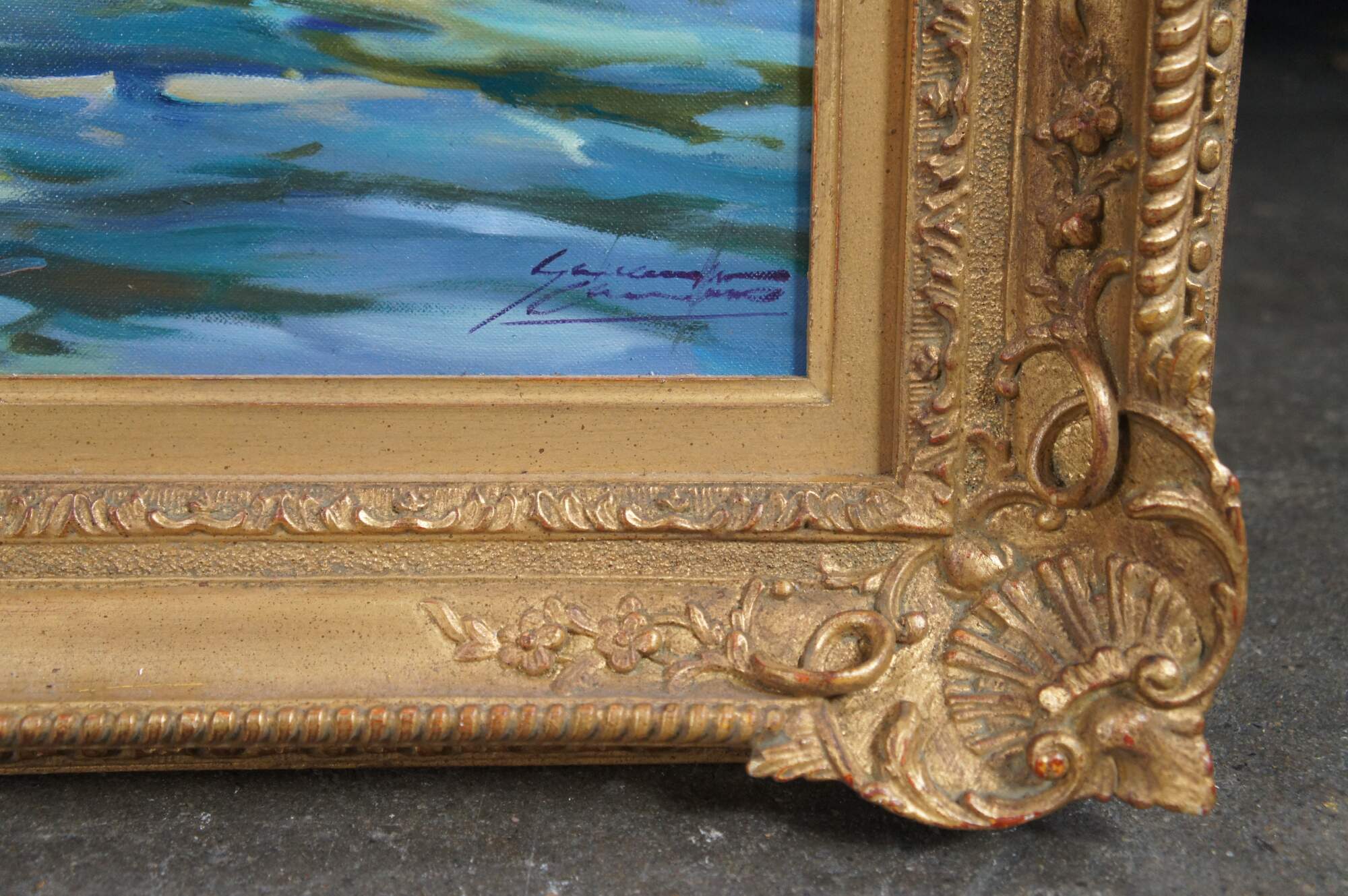 The signed lower right and verso markings indicate the artist’s authorship. The painting is encased in a baroque frame adorned with scalloped corners, executed in gold.