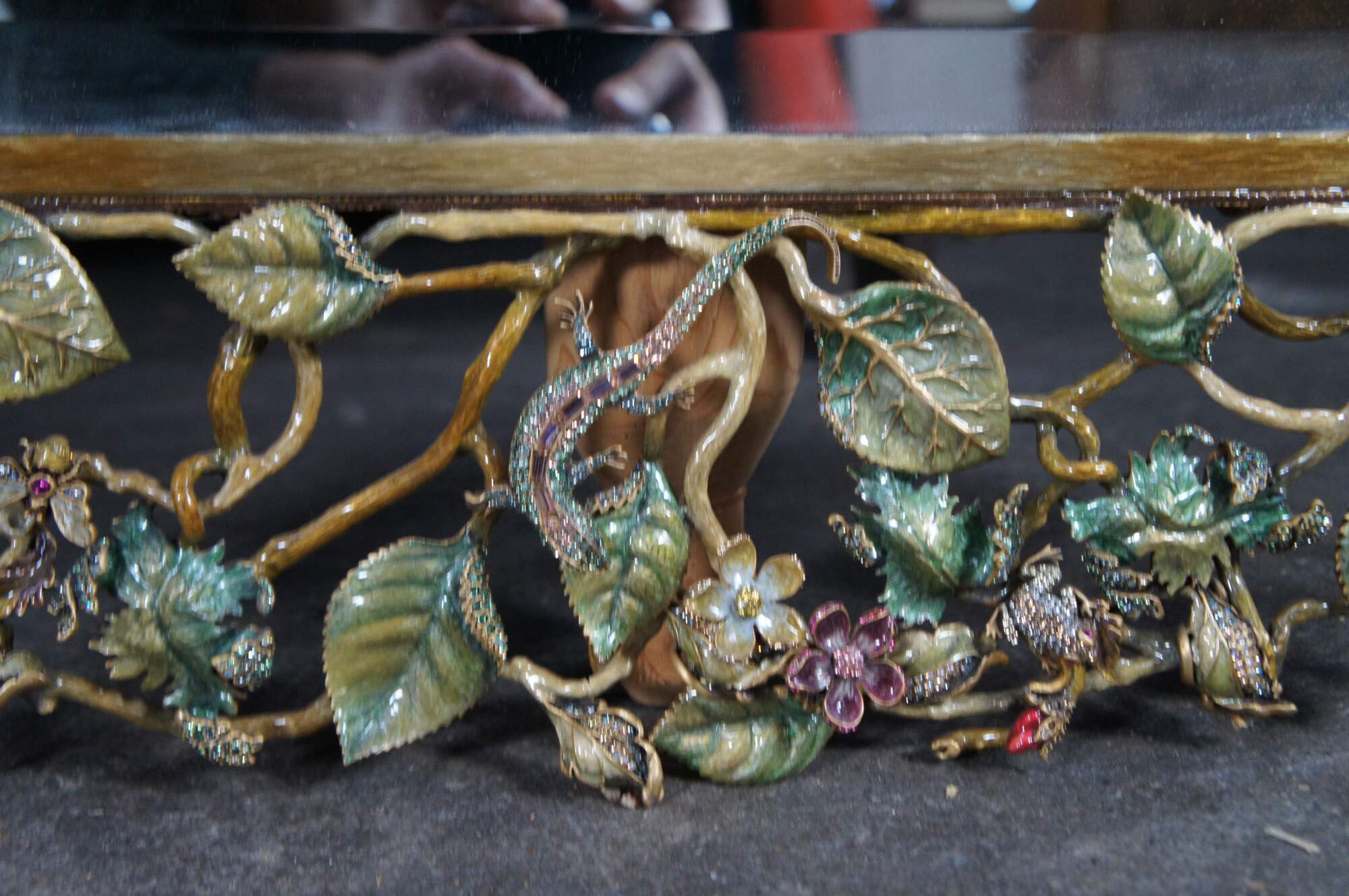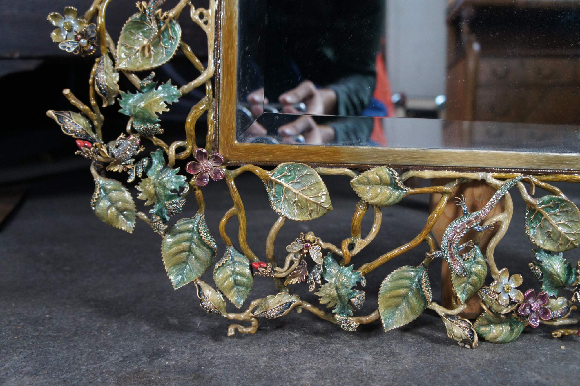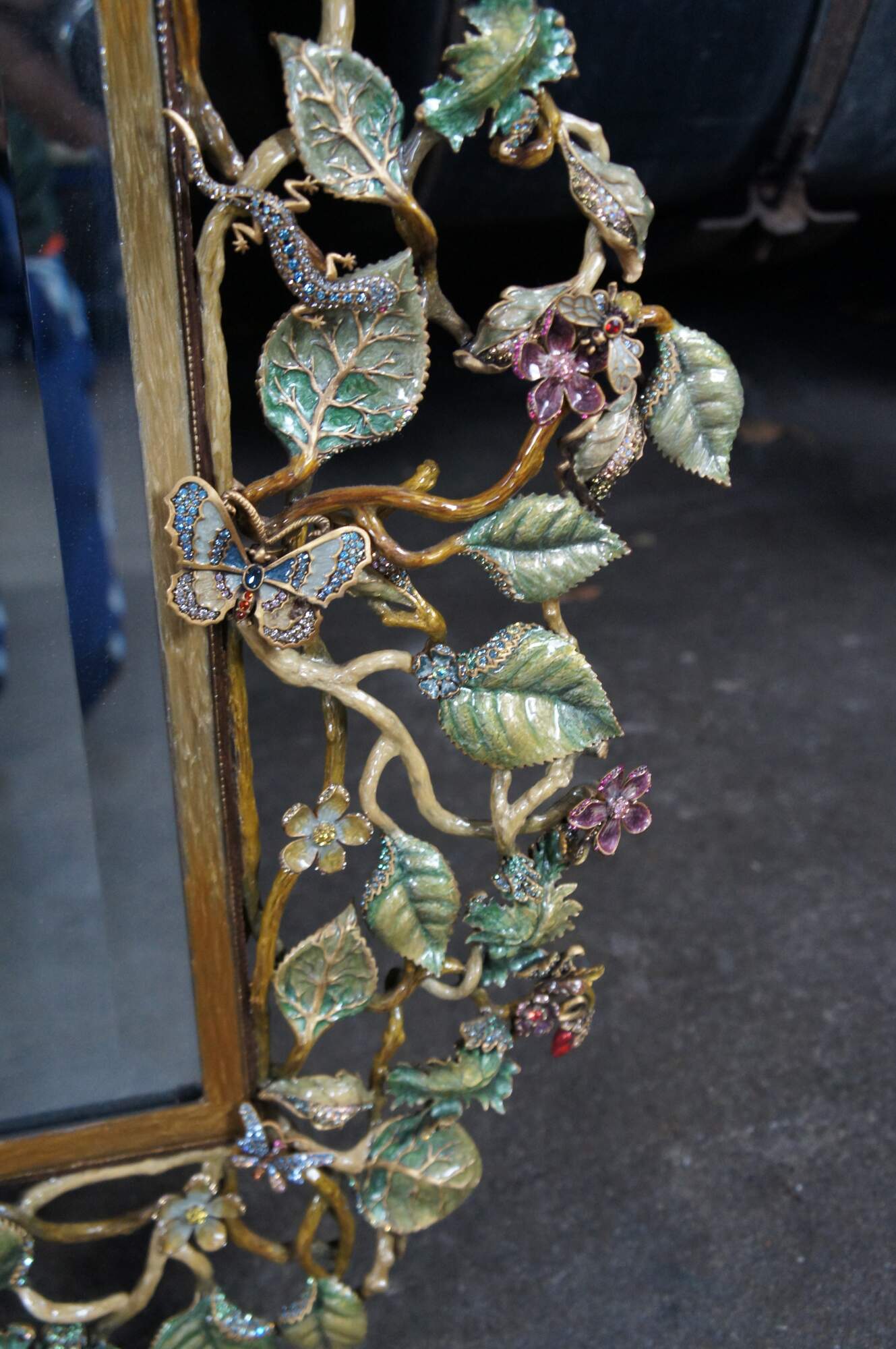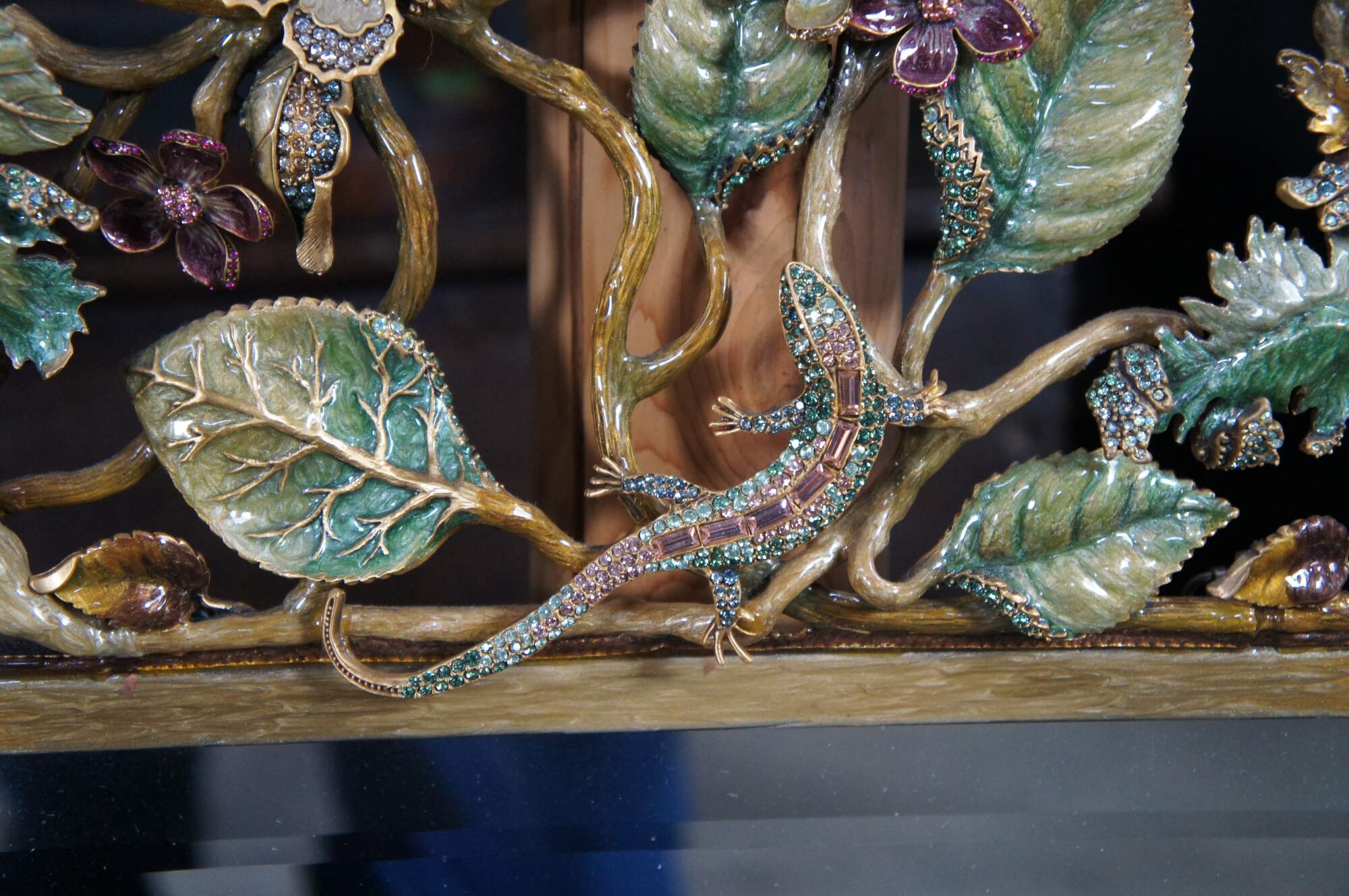 A rare exquisite mirror by Jay Strongwater, circa late 1990s. Aptly Titled 'Flora and Fauna'. Features a heavy ornamental bronze frame with beveled mirror at the center. The mirror is surrounded by flowing flora with an interlaced vine motif and fauna (insects and amphibians) throughout. The frame is crafted in bronze with polychrome enamel and stunning Swarovski crystals. This breathtaking masterpiece showcases frogs, salamanders, butterflies and bees. Retailed for $26,000
