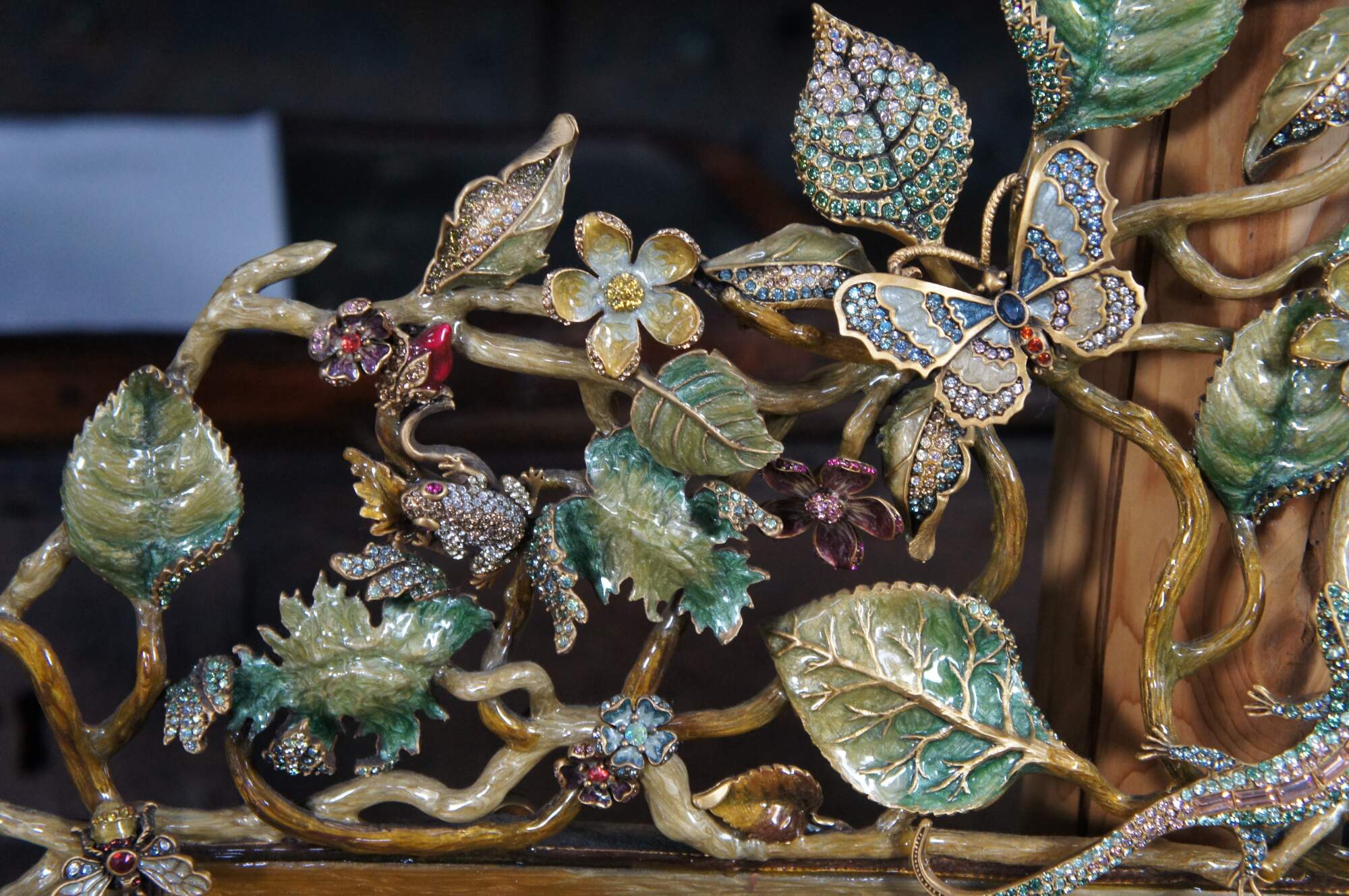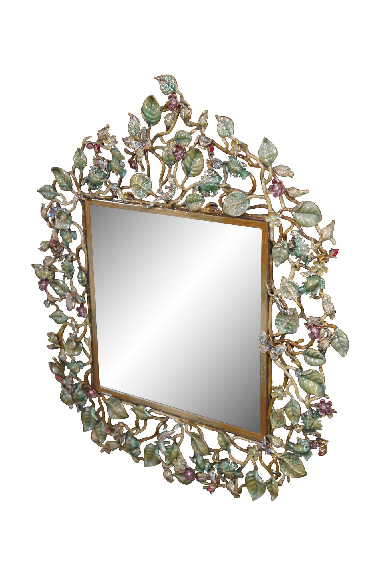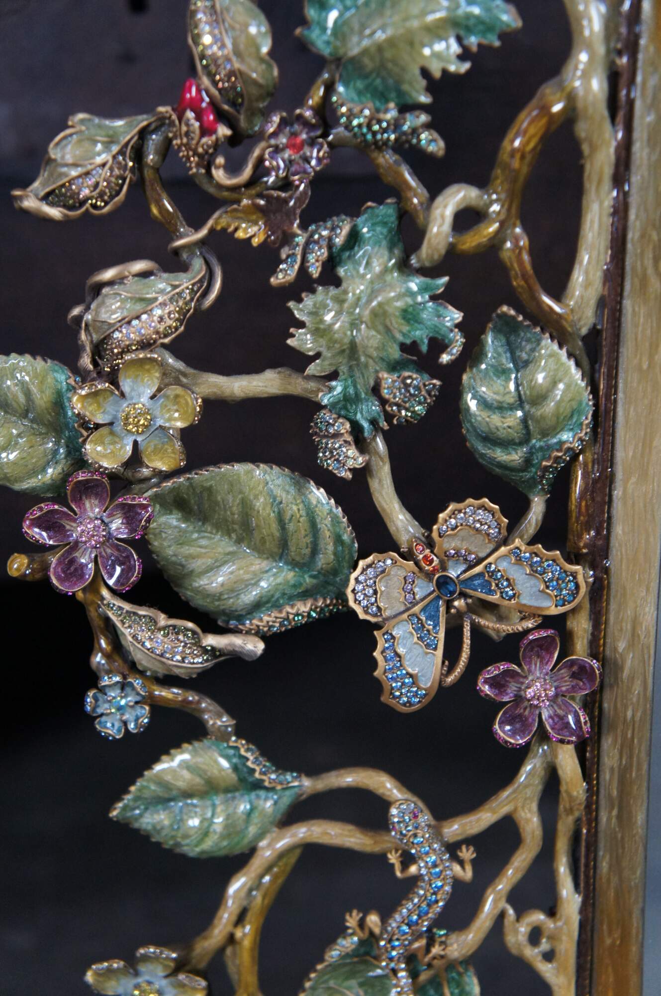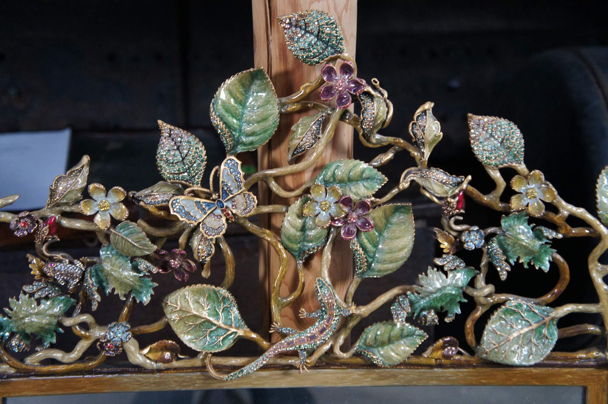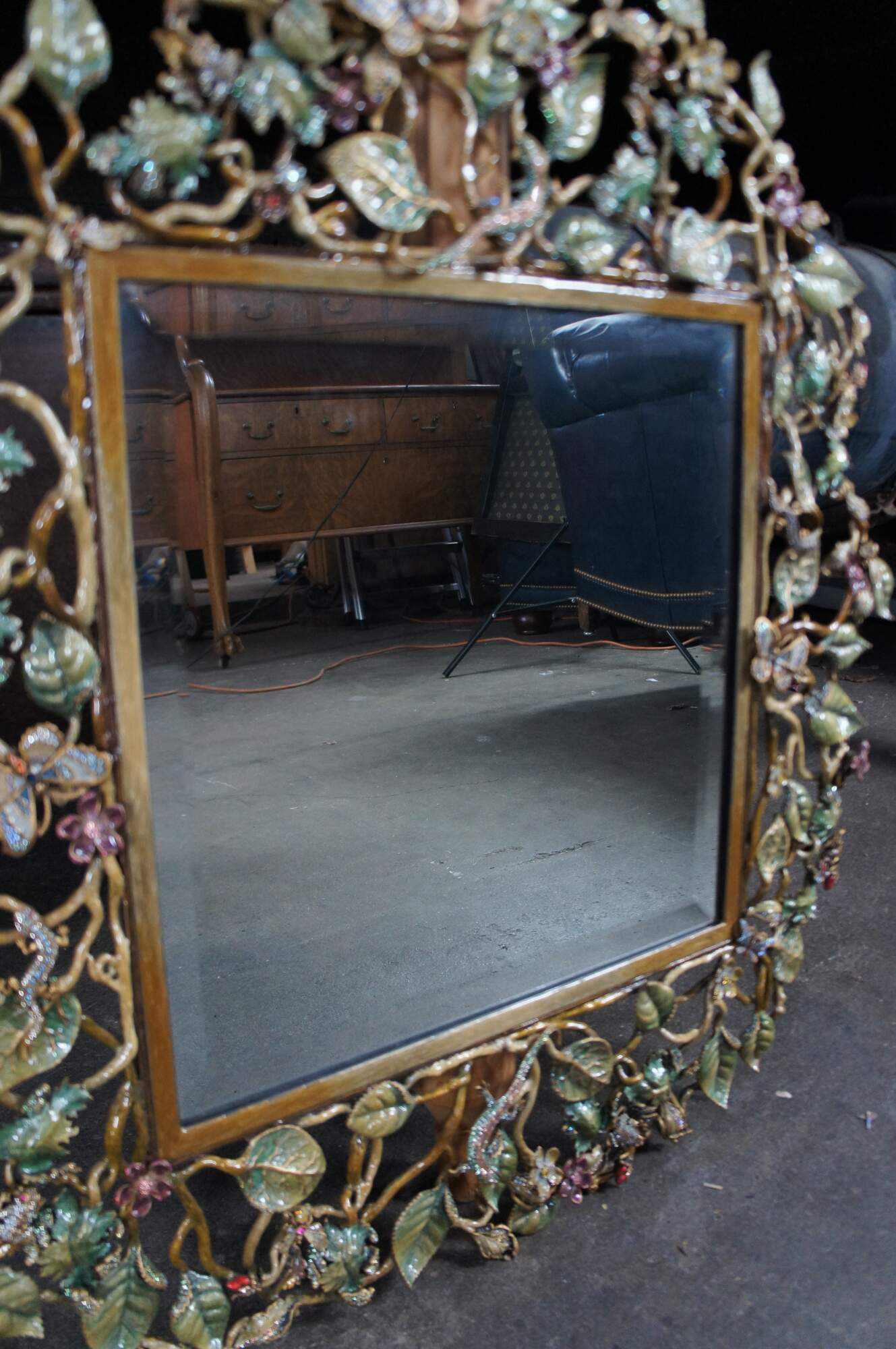 A rare exquisite mirror by Jay Strongwater, circa late 1990s. Aptly Titled 'Flora and Fauna'. Features a heavy ornamental bronze frame with beveled mirror at the center. The mirror is surrounded by flowing flora with an interlaced vine motif and fauna (insects and amphibians) throughout. The frame is crafted in bronze with polychrome enamel and stunning Swarovski crystals. This breathtaking masterpiece showcases frogs, salamanders, butterflies and bees. Retailed for $26,000