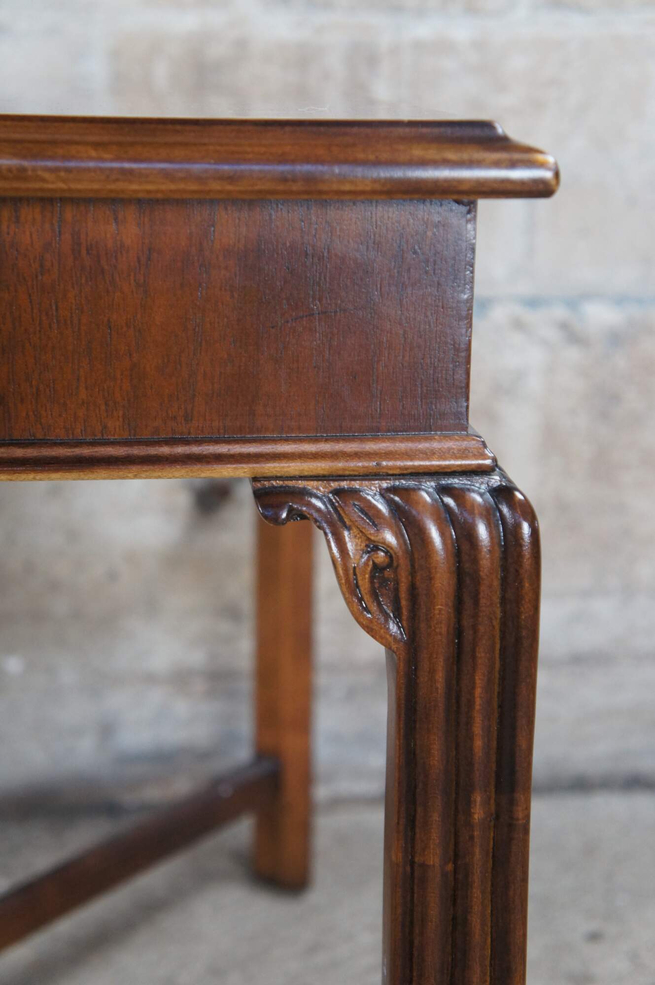 Henredon Georgian Style mahogany side table, circa 1980s. Features a matchbook banded top over shapely fluted legs connected by an X stretcher. Marked on underside.