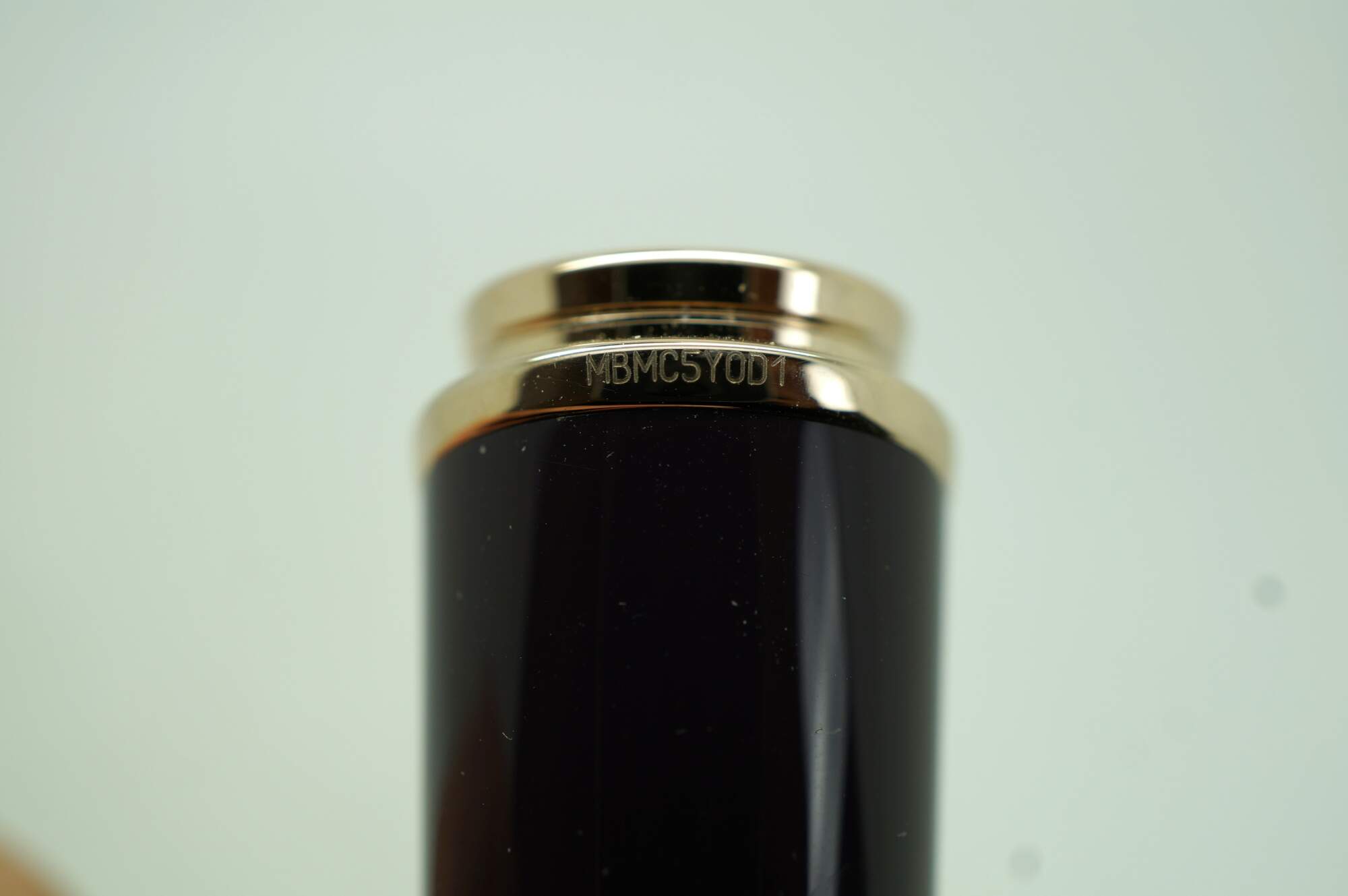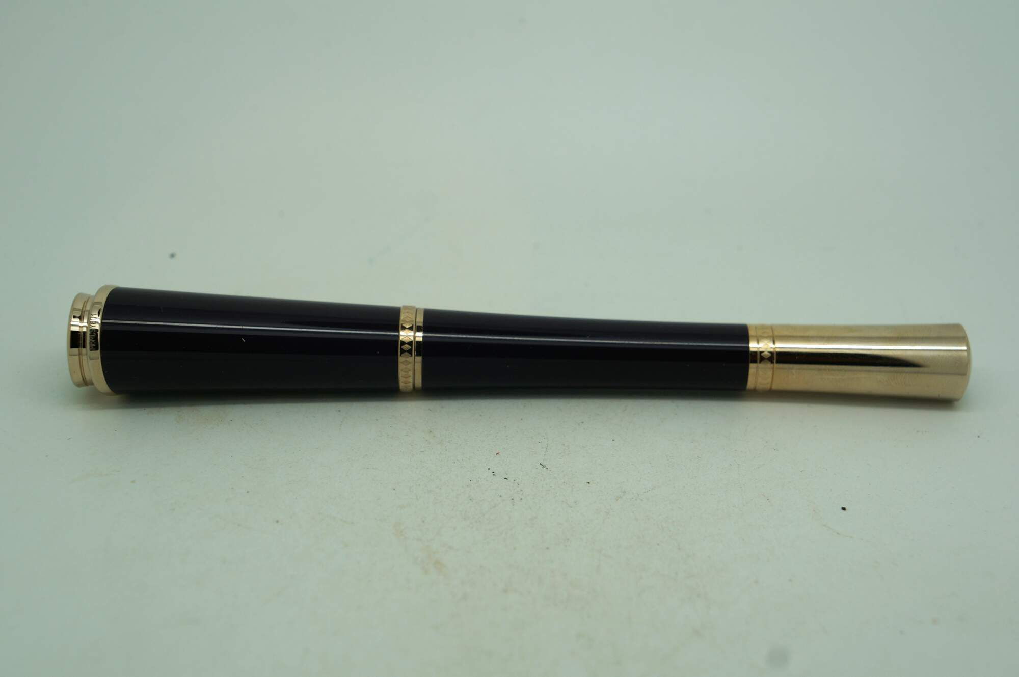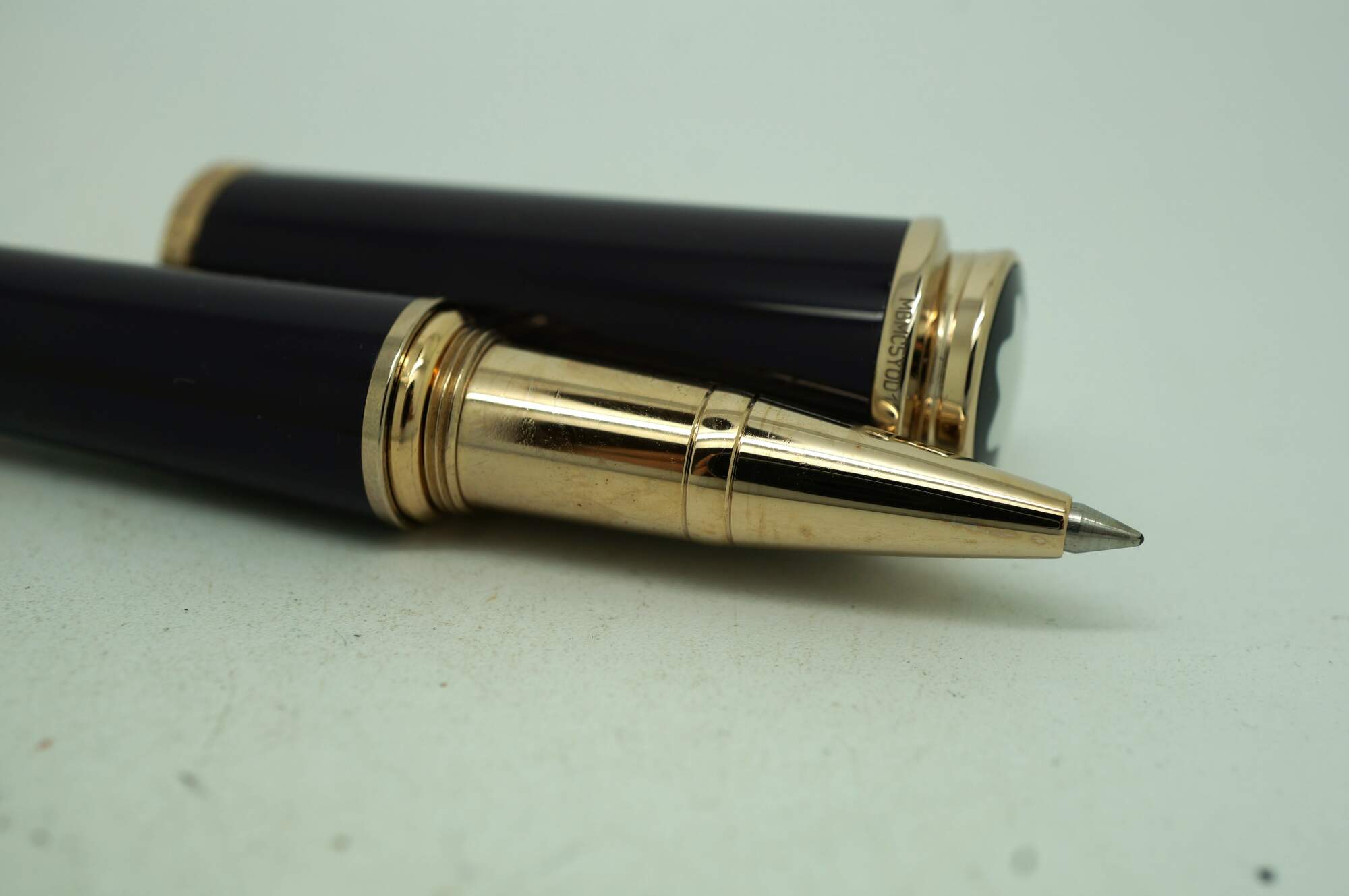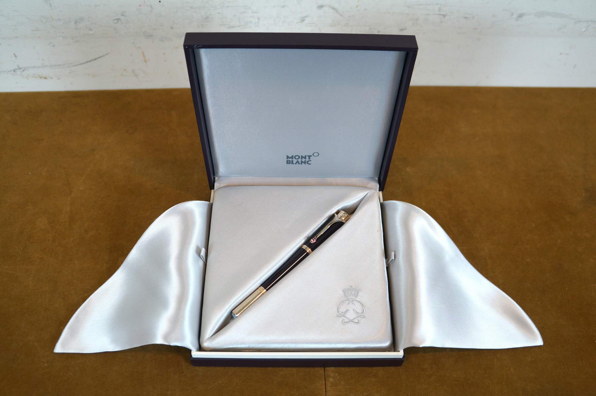 Montblanc Princesse Grace de Monaco Collection special edition ballpoint pen. Style Number: 106633 - Barrel: Royal purple precious resin - Cap, Trim, & Clip: Champagne-tone gold-plated, set with a petal-cut pink topaz (heat-treated) of approx. 0.39 ct. Serial Number: MBMC5Y0D1. Personalized by the previous owner. Includes the original box.
