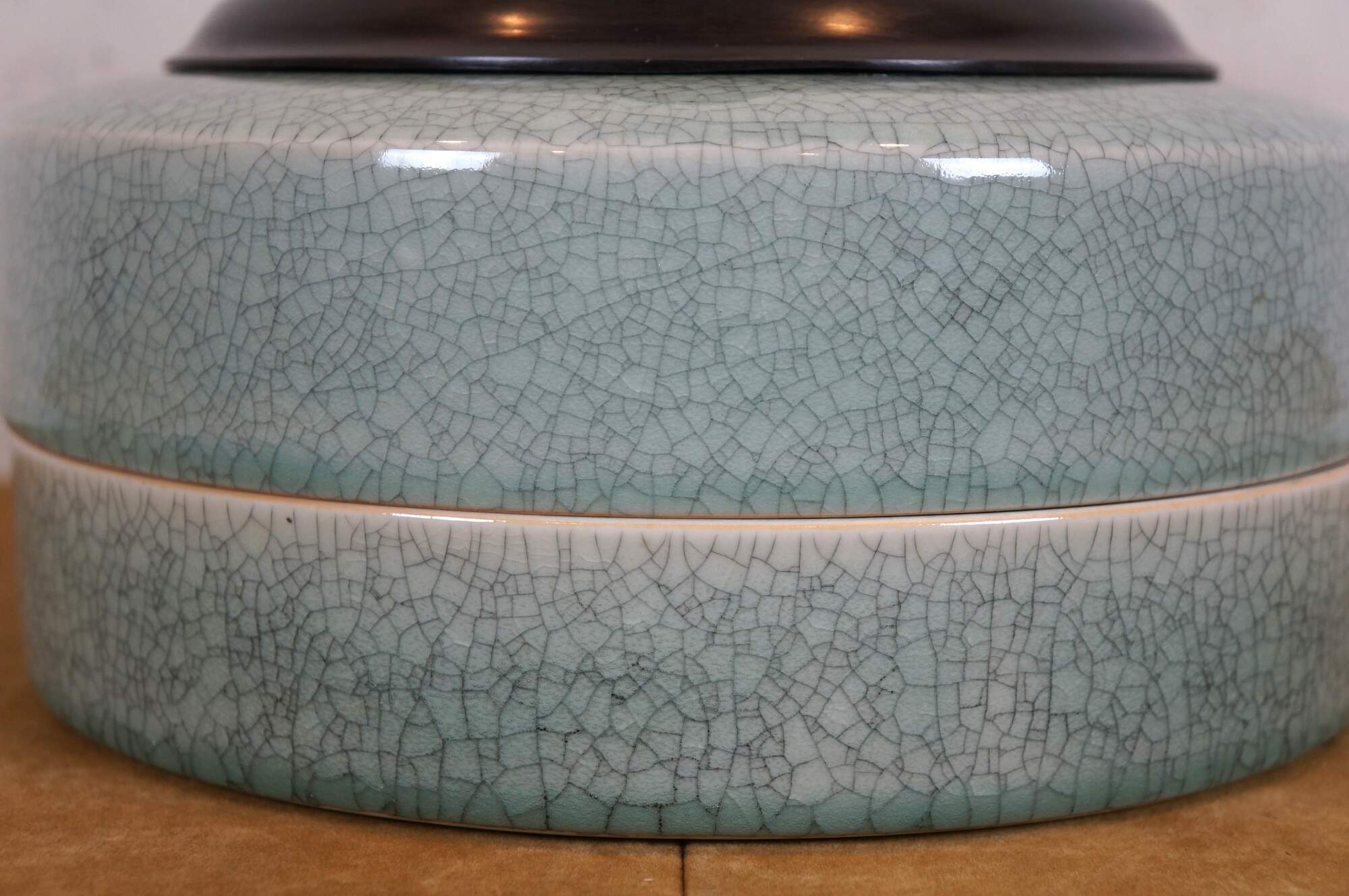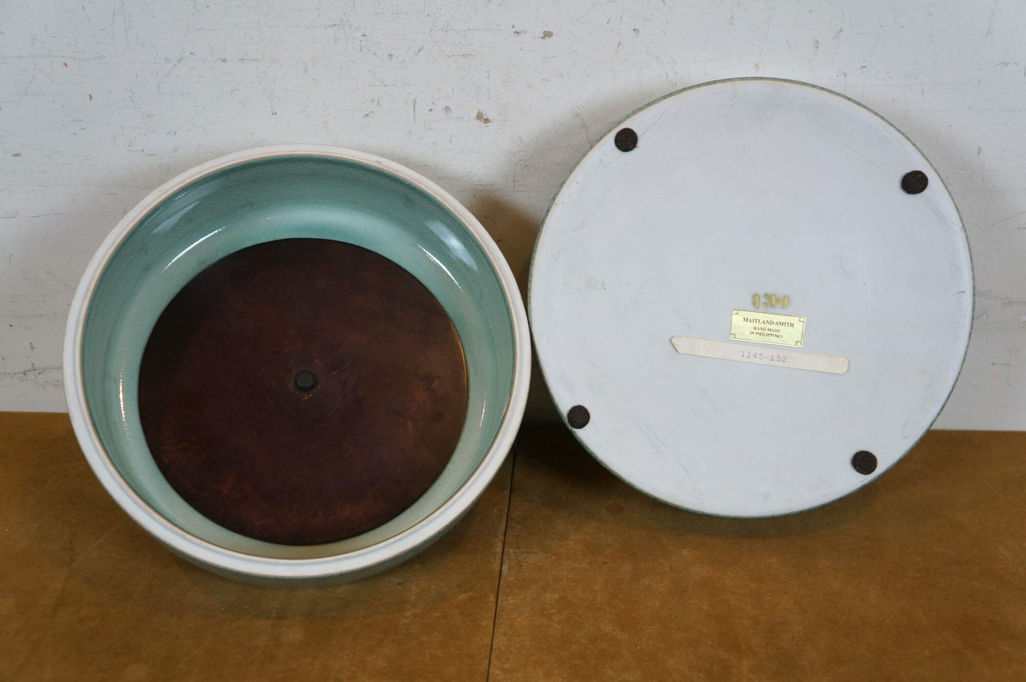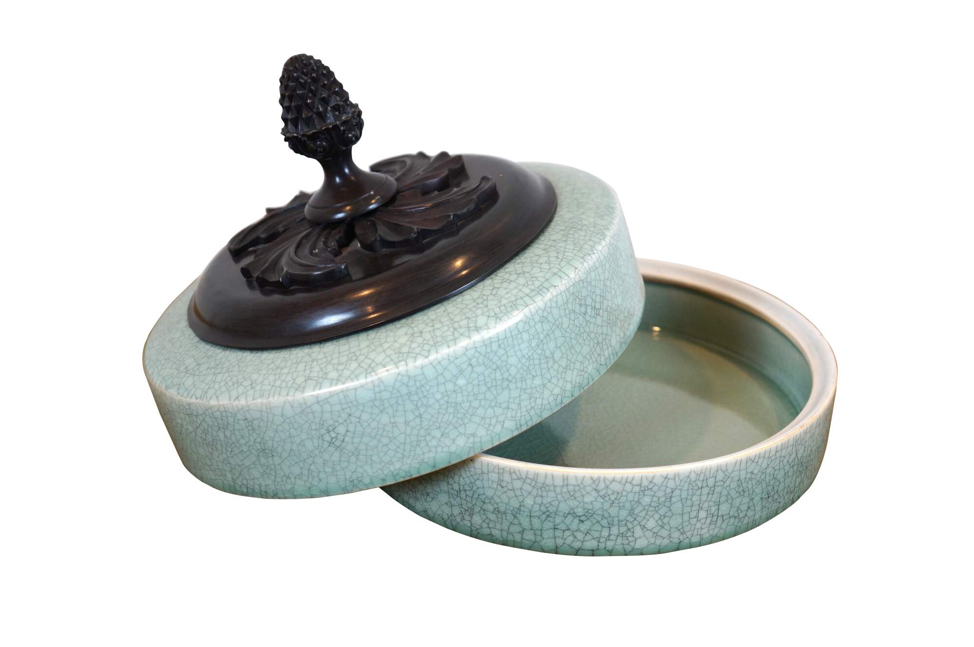 Maitland Smith round lidded trinket dish/box with a factory distressed pale celadon green glaze, topped with a bronze pineapple shaped finial.