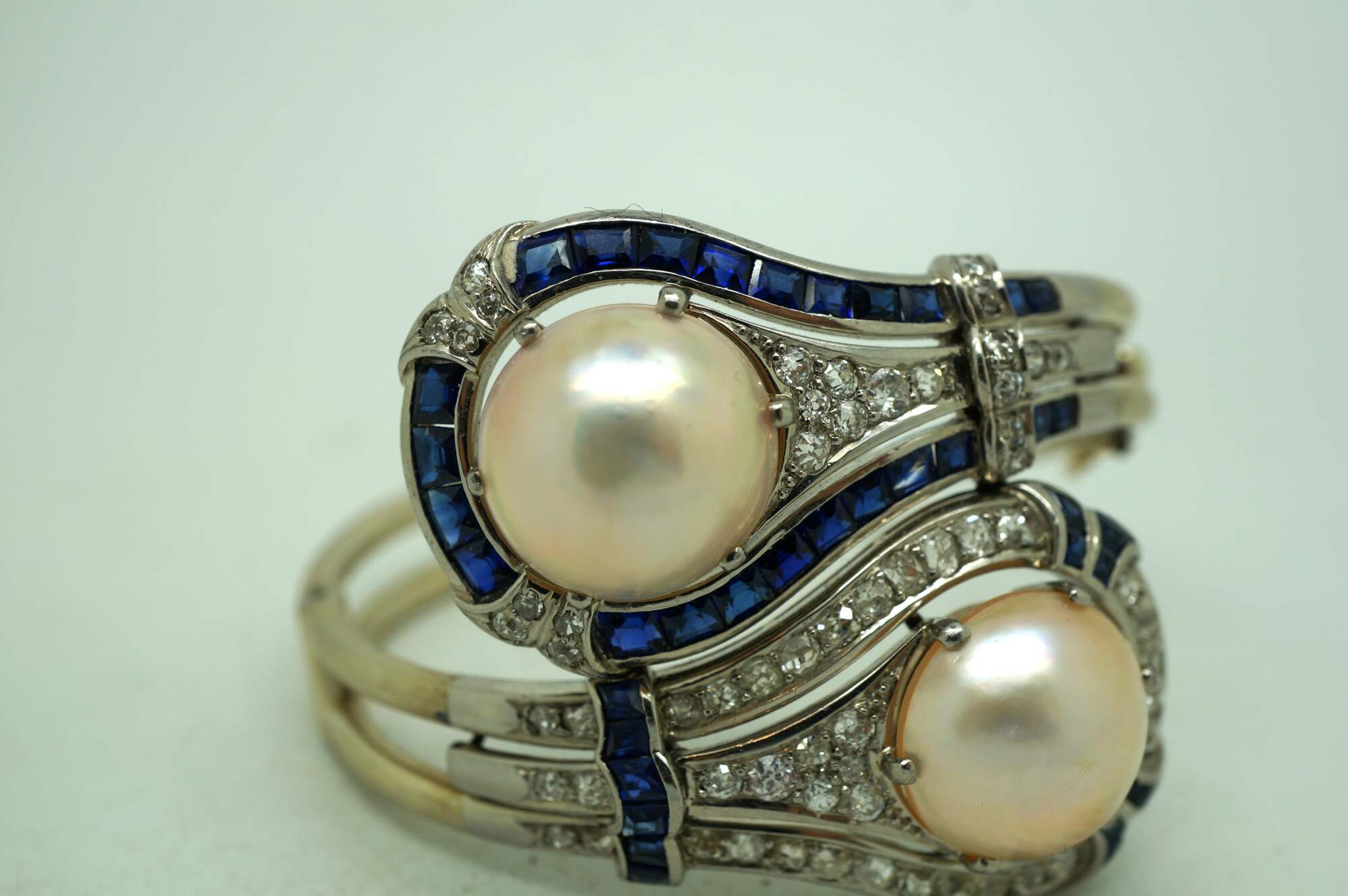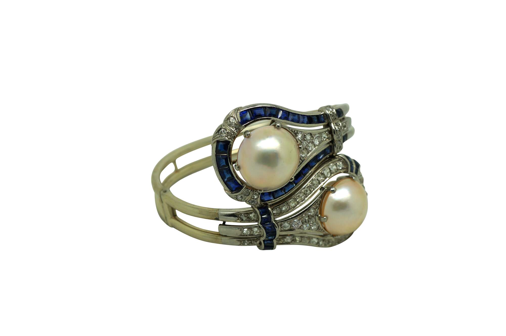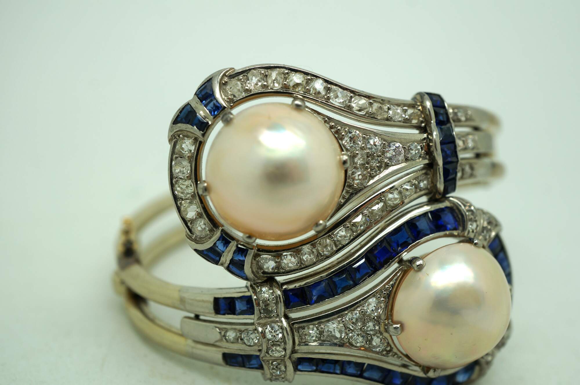 1970s Vintage 14K white gold crossover bracelet. Features two large pearls surrounded by overlapped bands of deep blue sapphires and white diamonds.