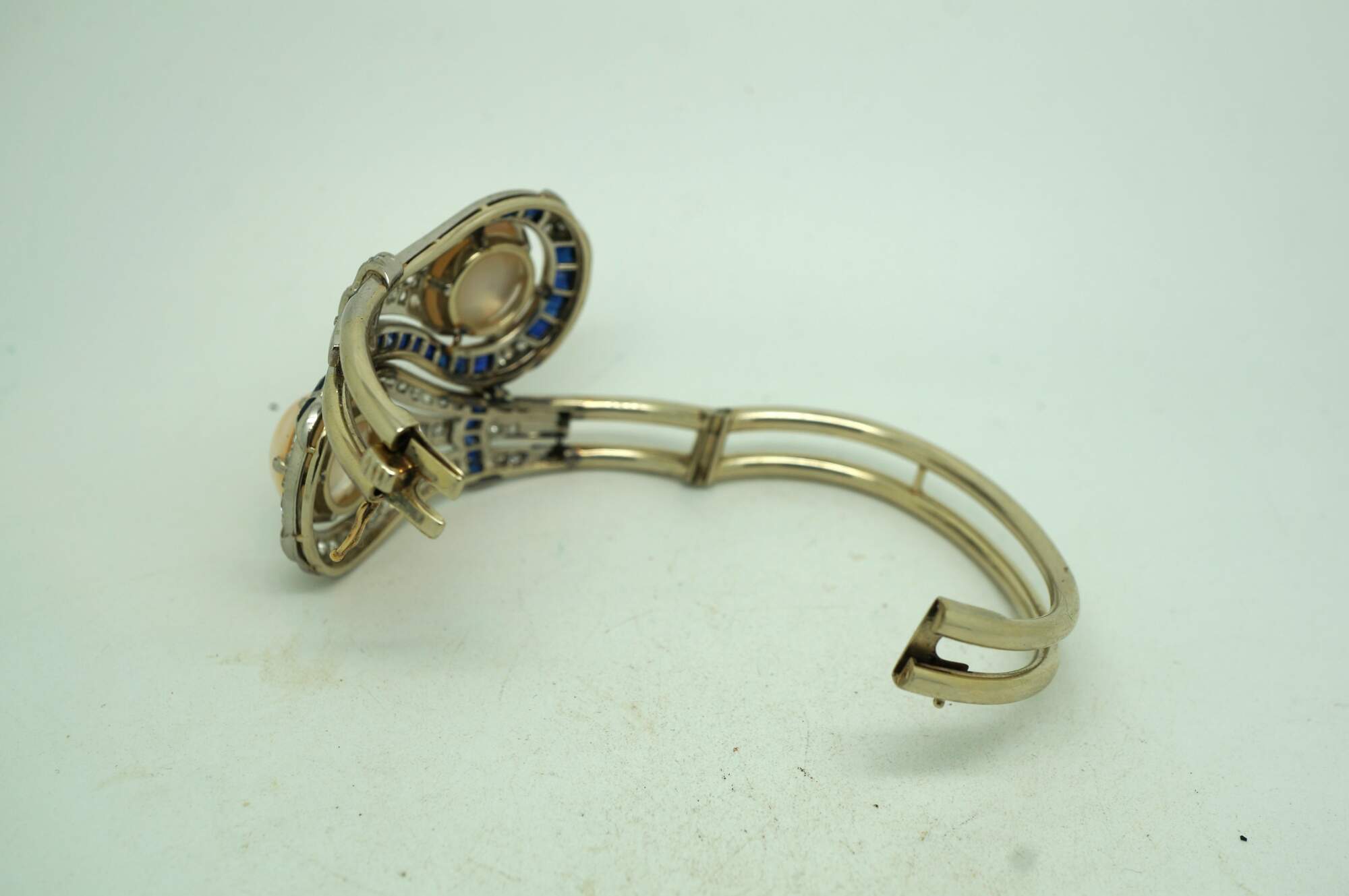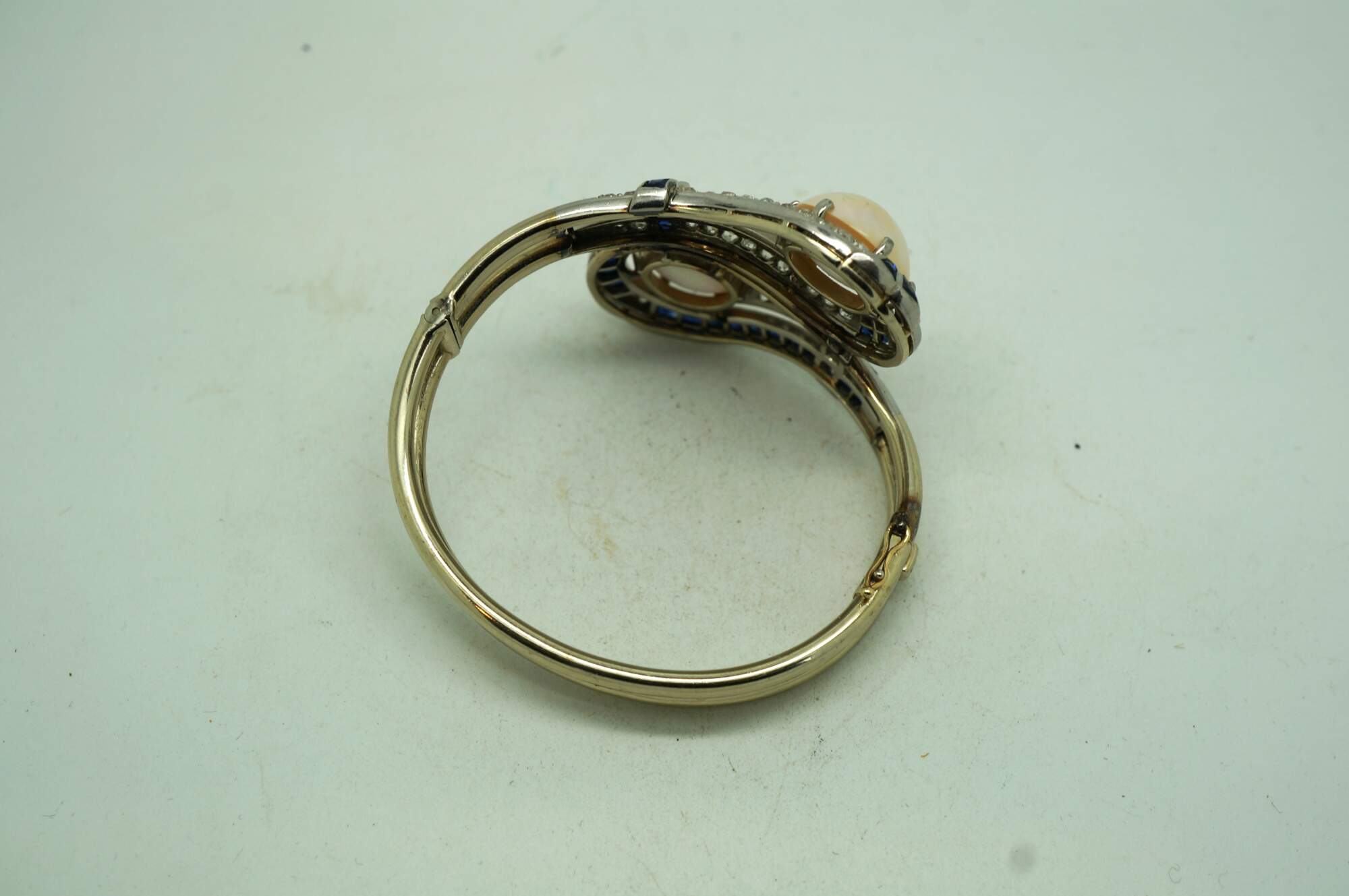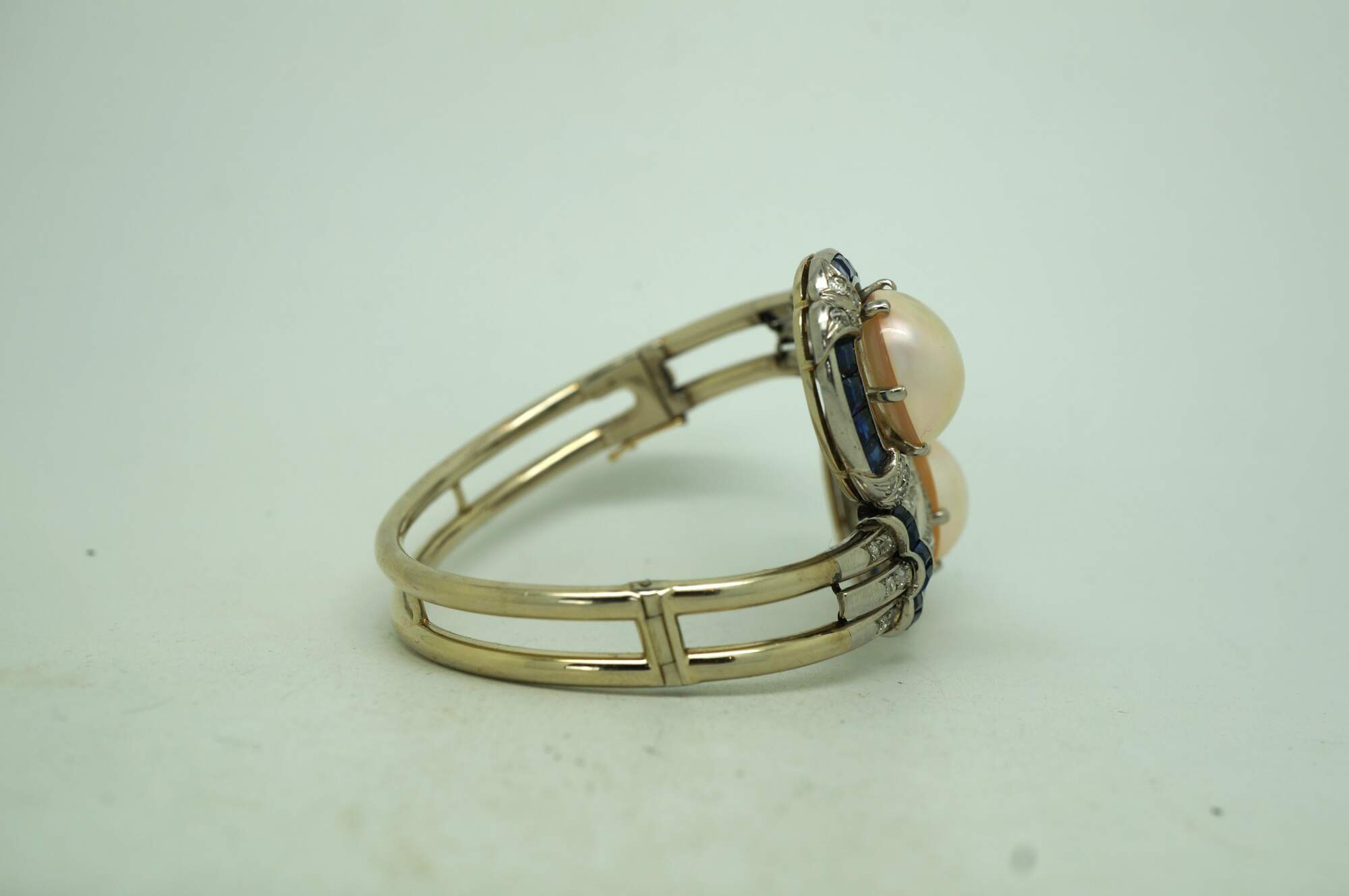 1970s Vintage 14K white gold crossover bracelet. Features two large pearls surrounded by overlapped bands of deep blue sapphires and white diamonds.