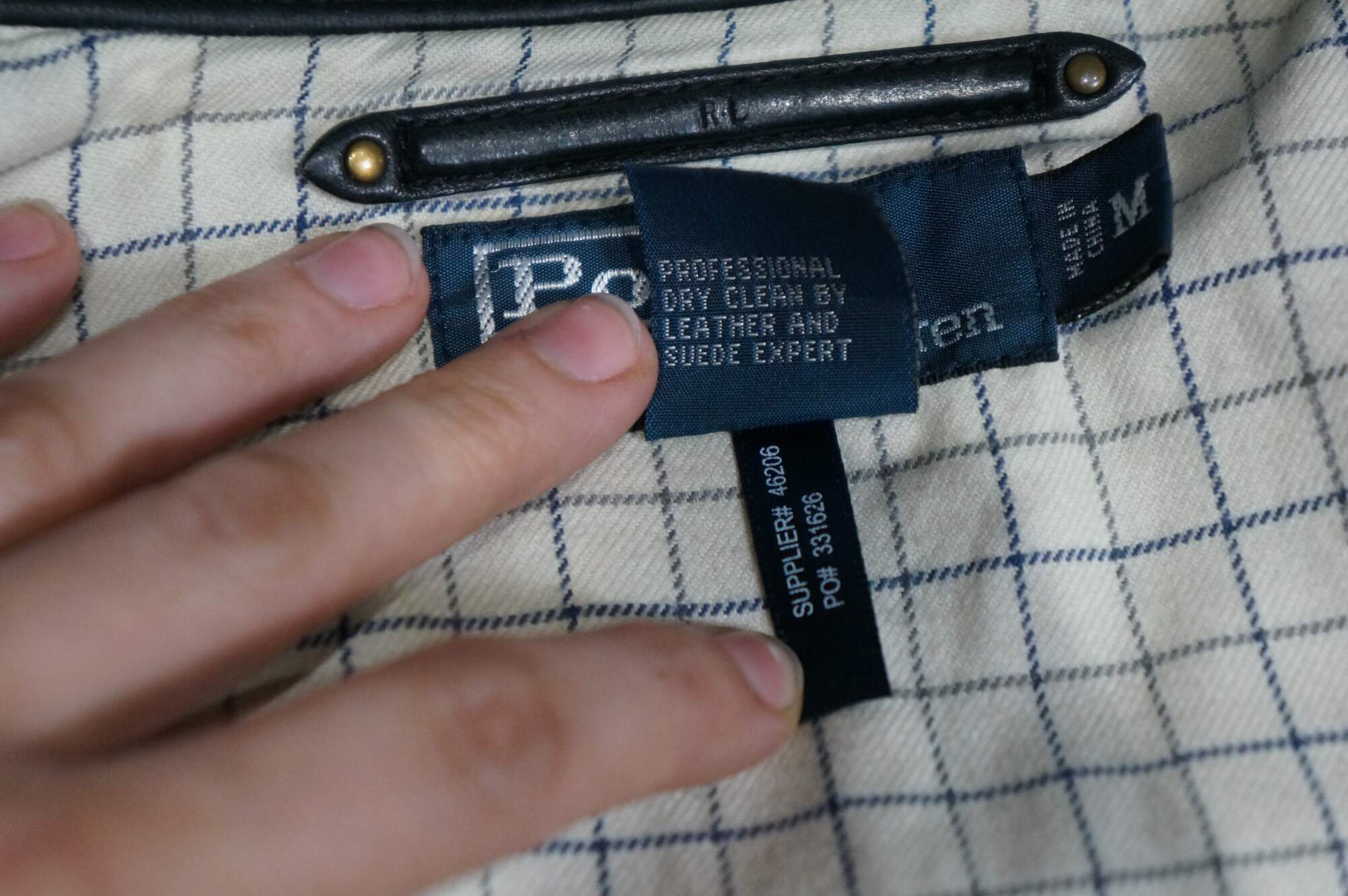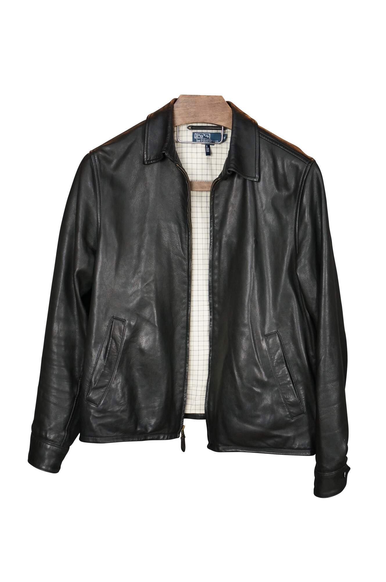 Polo Ralph Lauren black leather windbreaker style jacket. Zipper closure. Adjustable tabs at hem and cuffs. Blue and white checked cotton lining. Two exterior pockets. Polo pony logo at left chest. Made in China