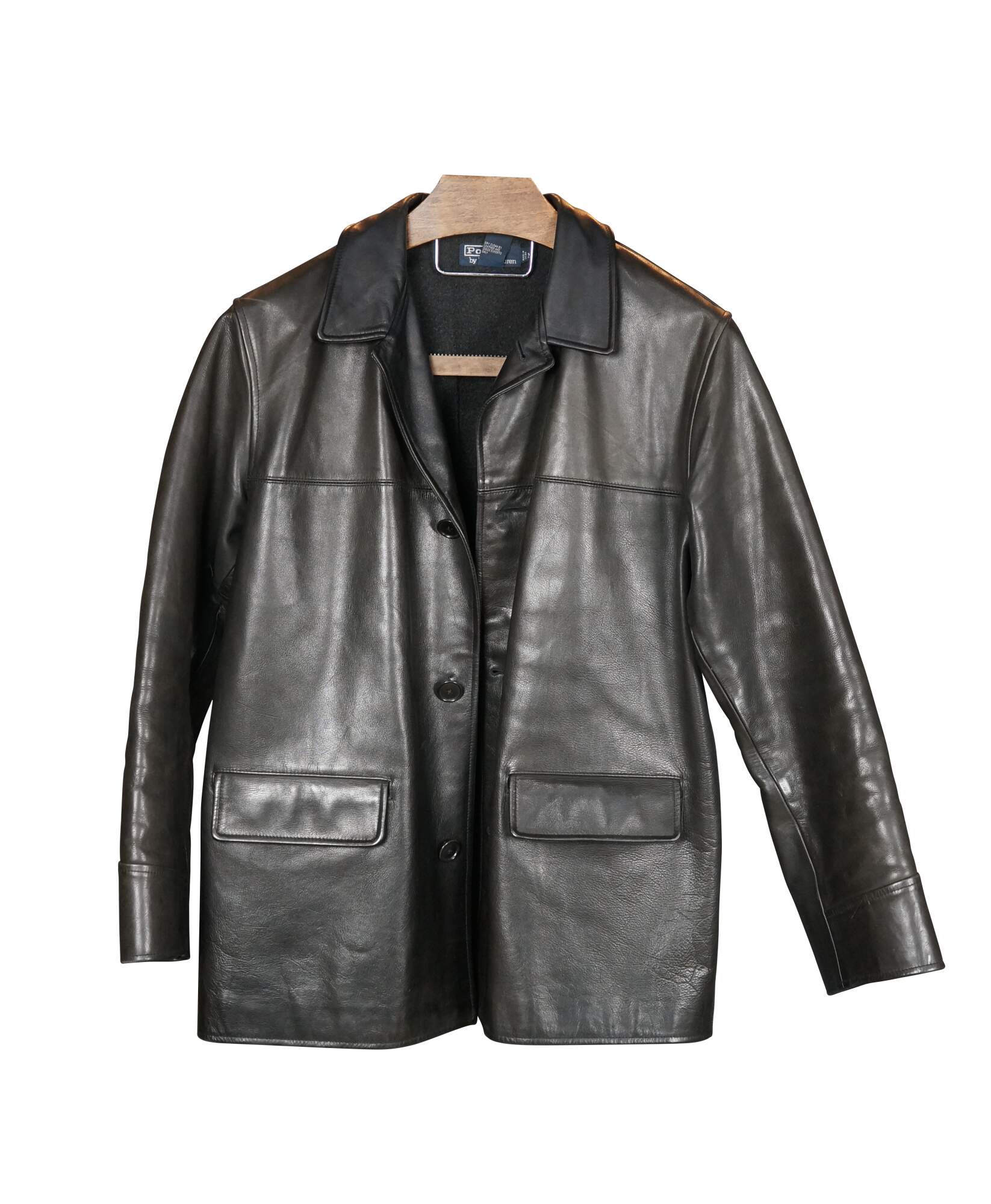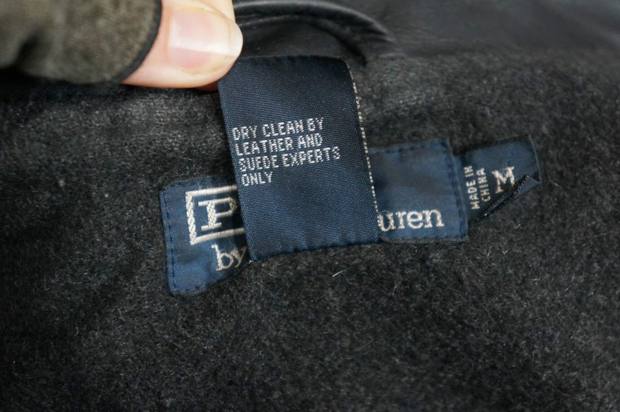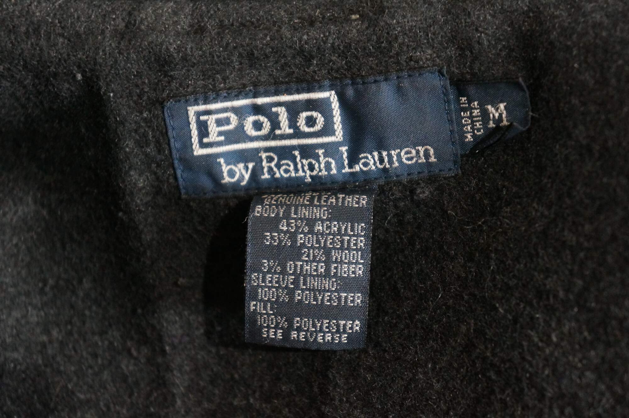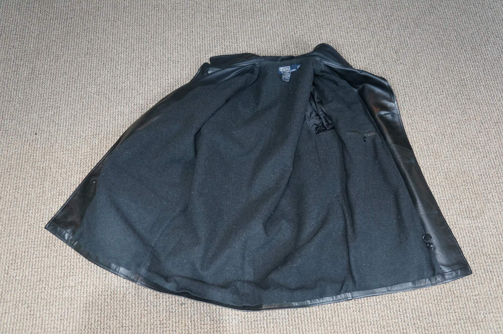 Circa 1990's Polo Ralph Lauren men's black leather winter jacket / car coat with wool / ployester lining. Button front closure. One interior breast pocket, button closure. Two outer pockets with flaps. Made in China.