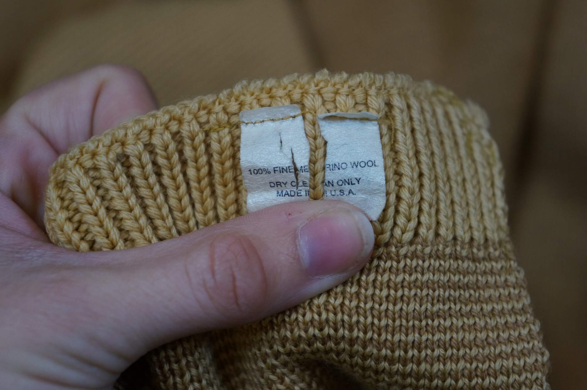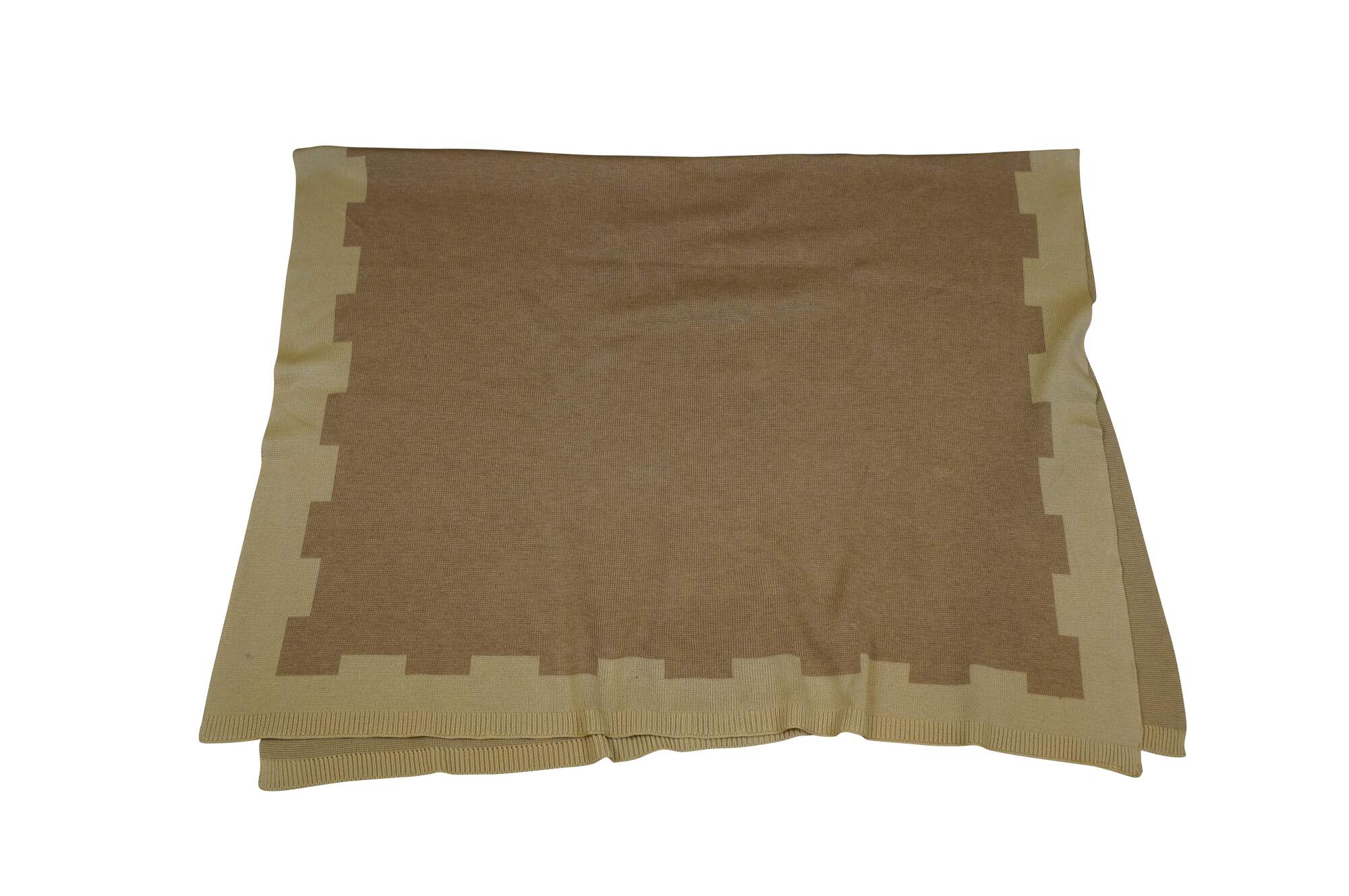 Vintage two-tone sandy brown 100% Merino wool throw blanket featuring a crenelated border design and ribbed ends. Made in USA.