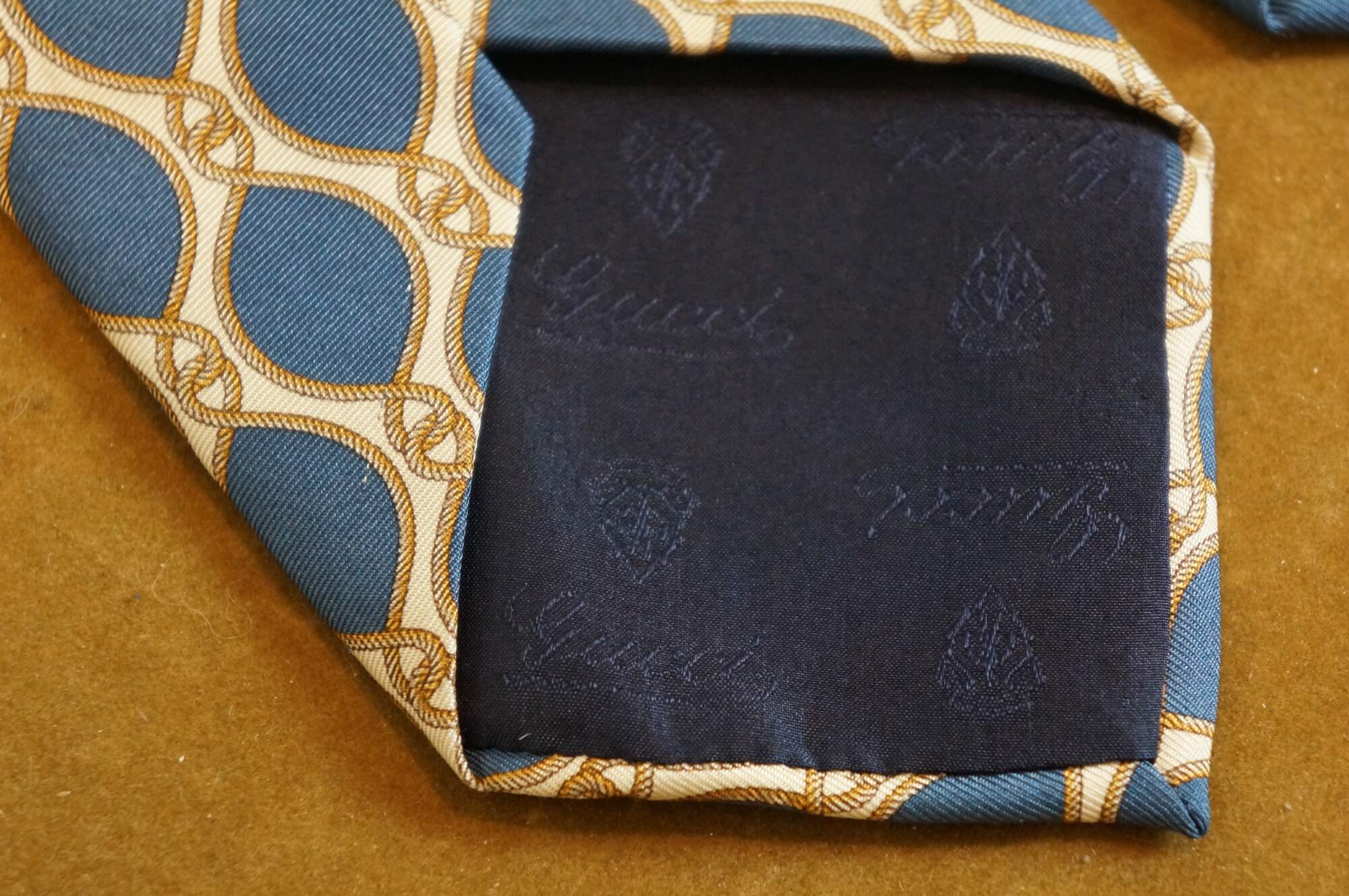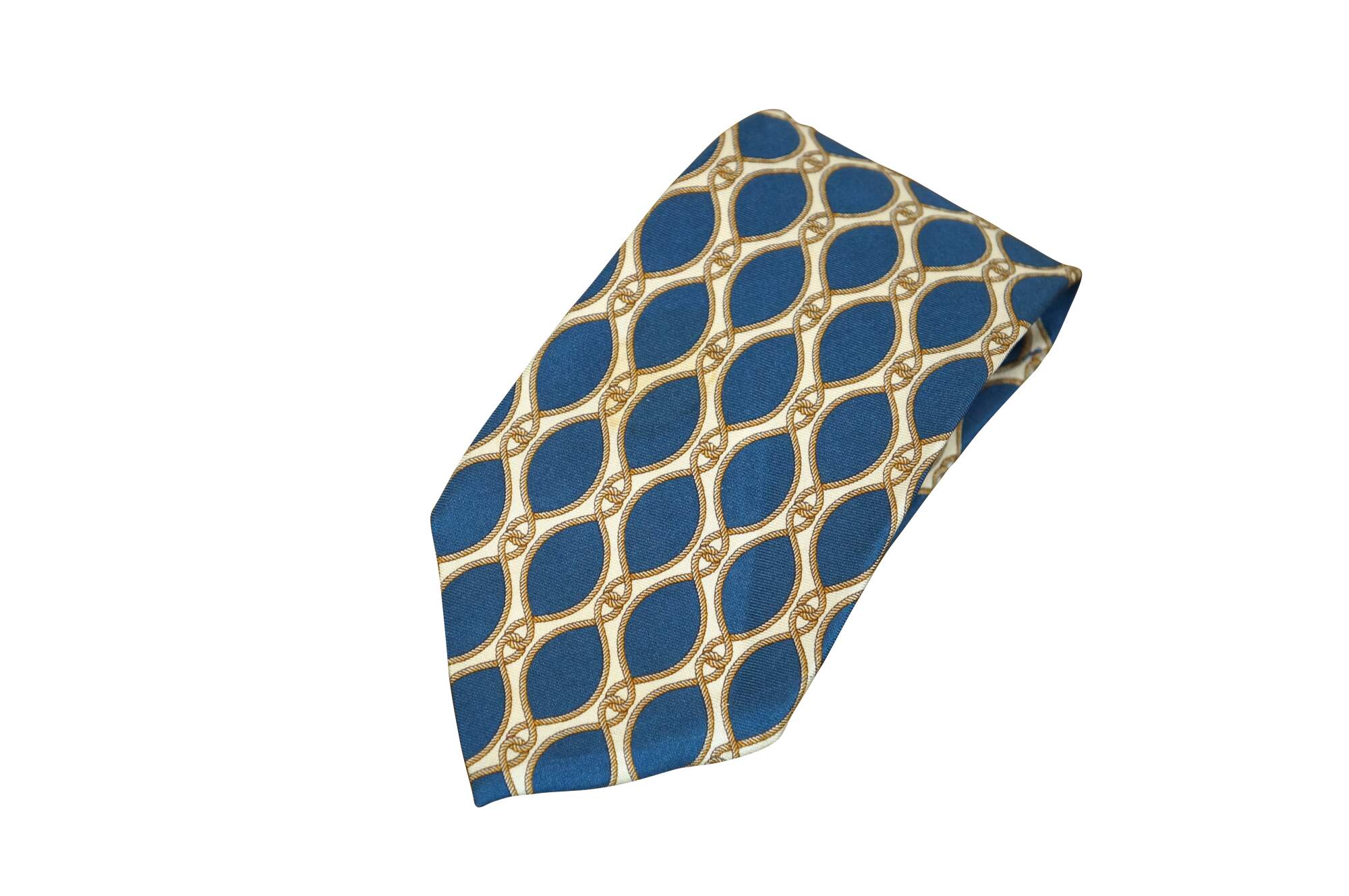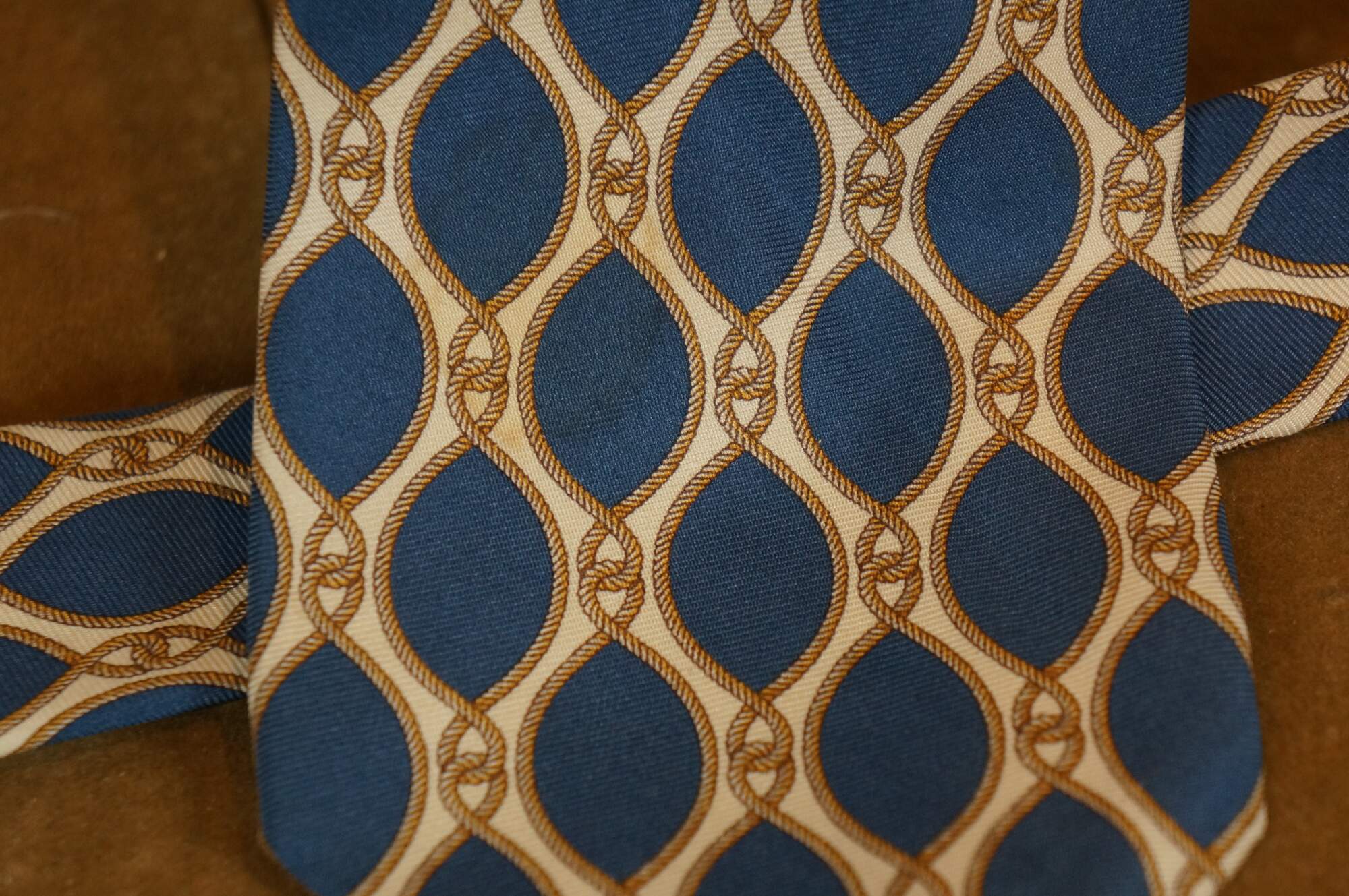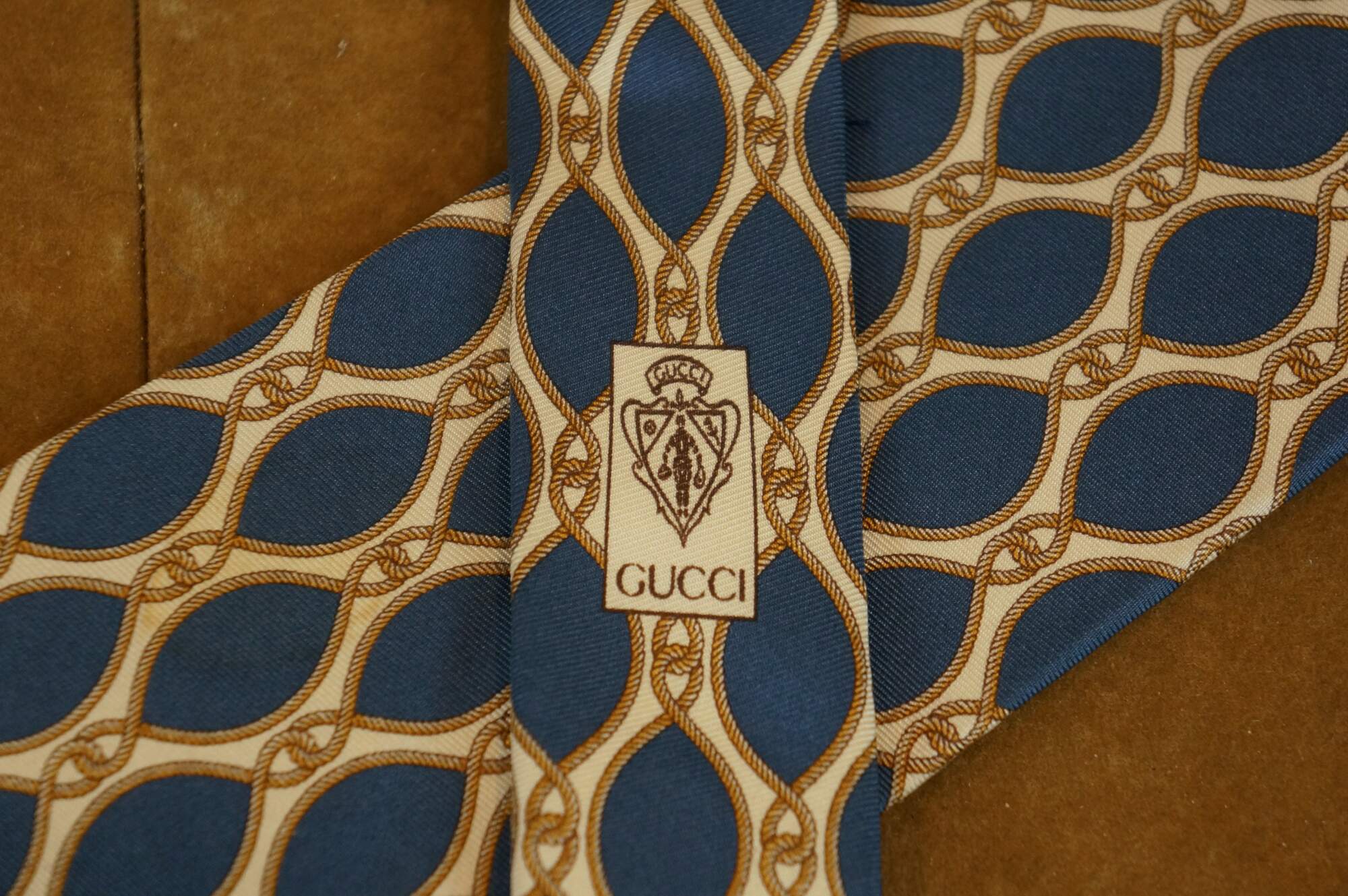 Vintage Gucci men's 100% silk classic neck tie featuring a navy blue, golden brown, and off white lattice pattern of links of knotted rope. Made in Italy.