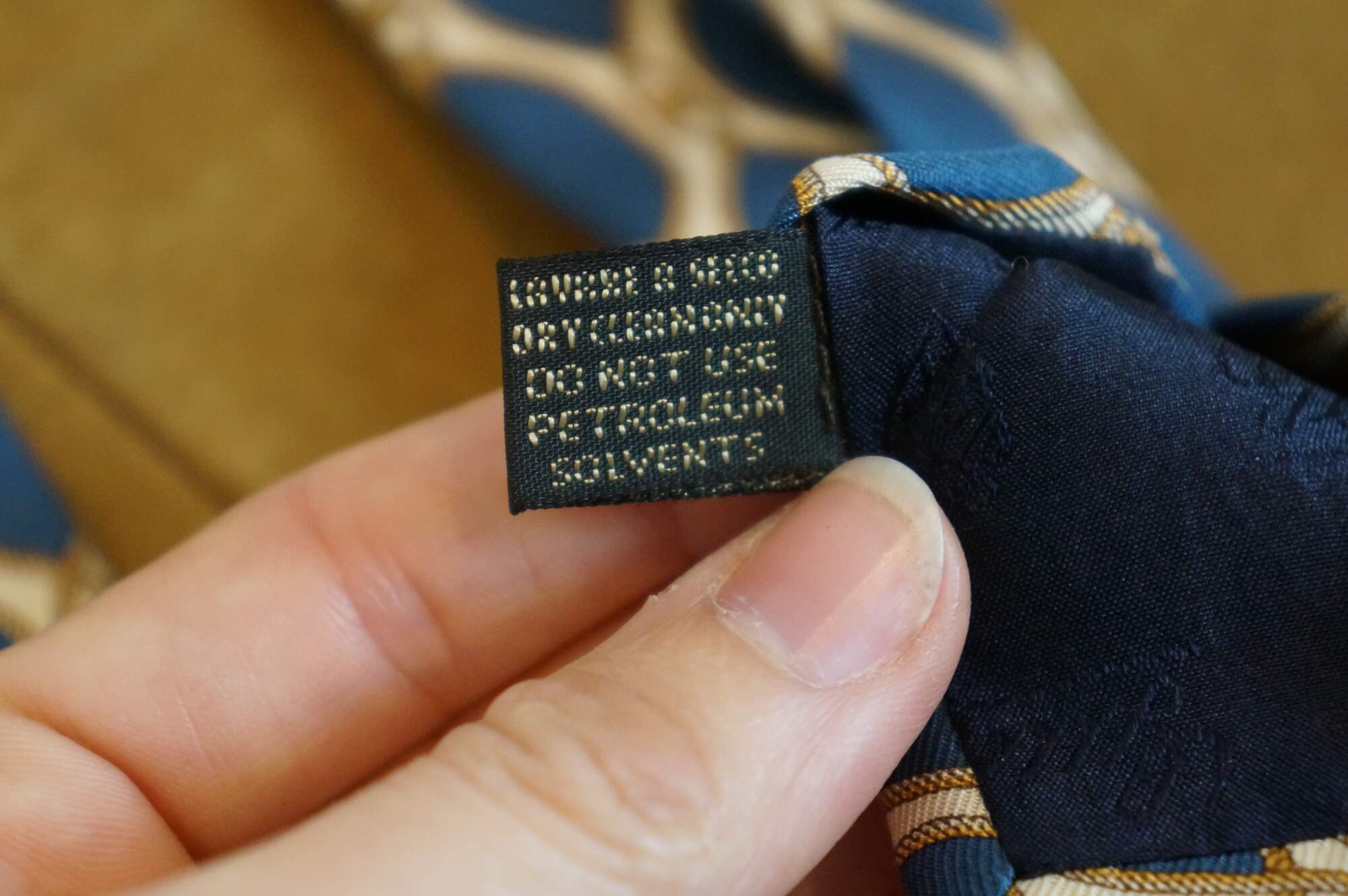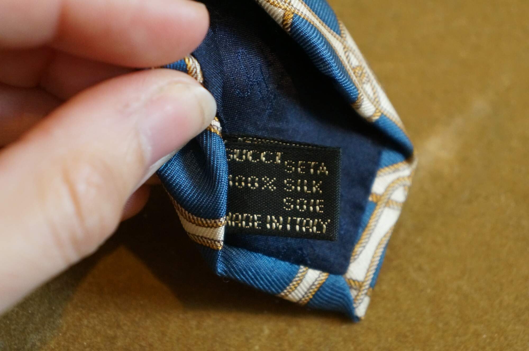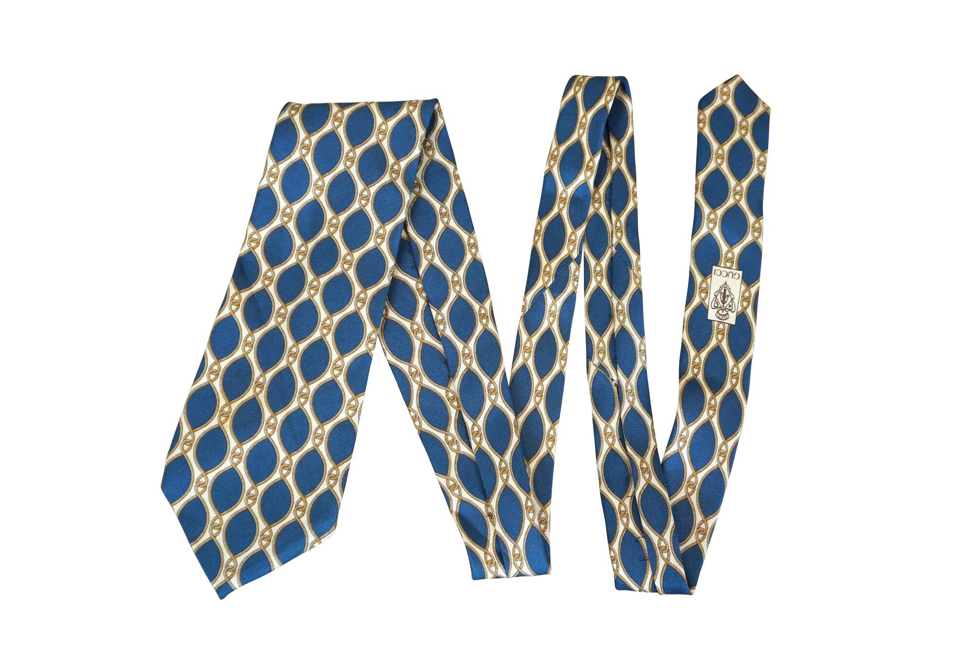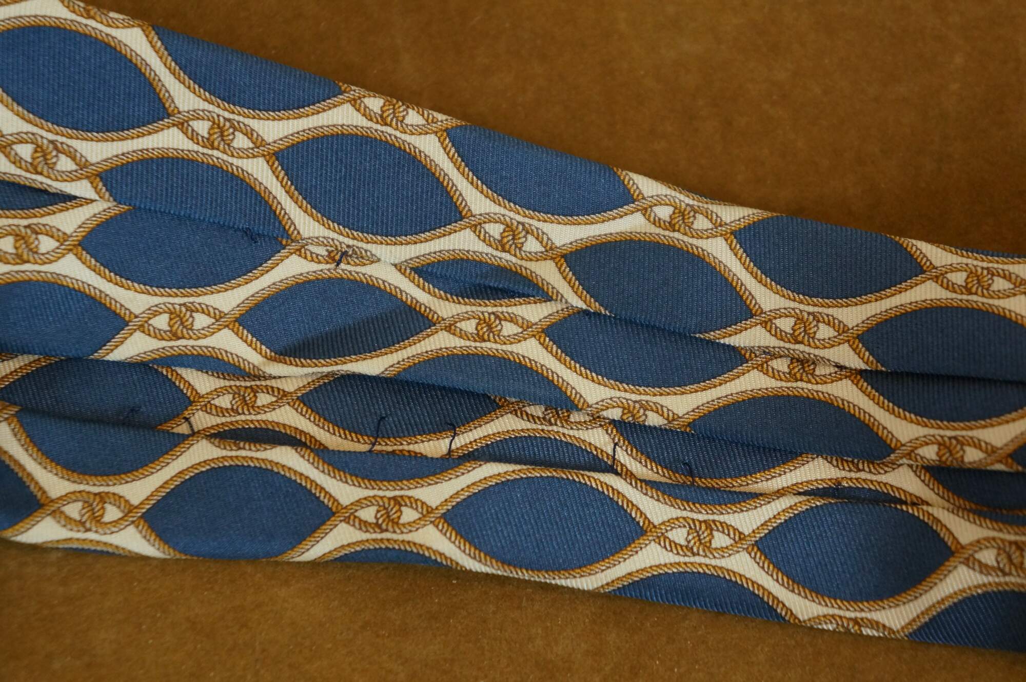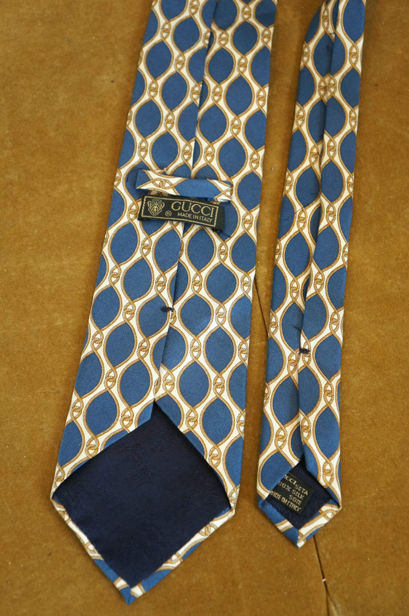 Vintage Gucci men's 100% silk classic neck tie featuring a navy blue, golden brown, and off white lattice pattern of links of knotted rope. Made in Italy.