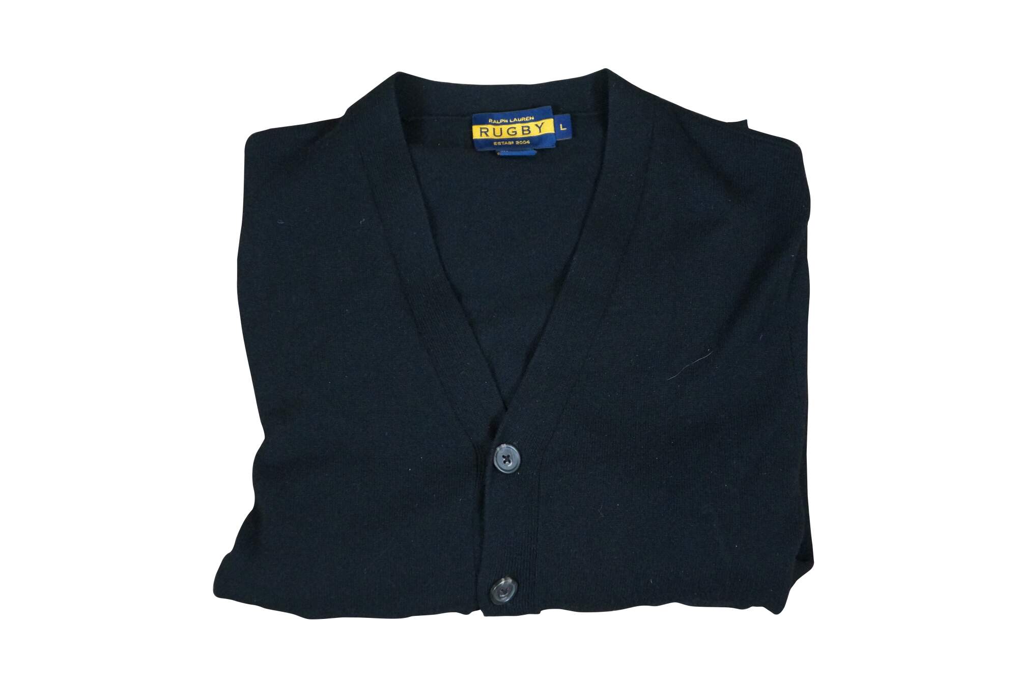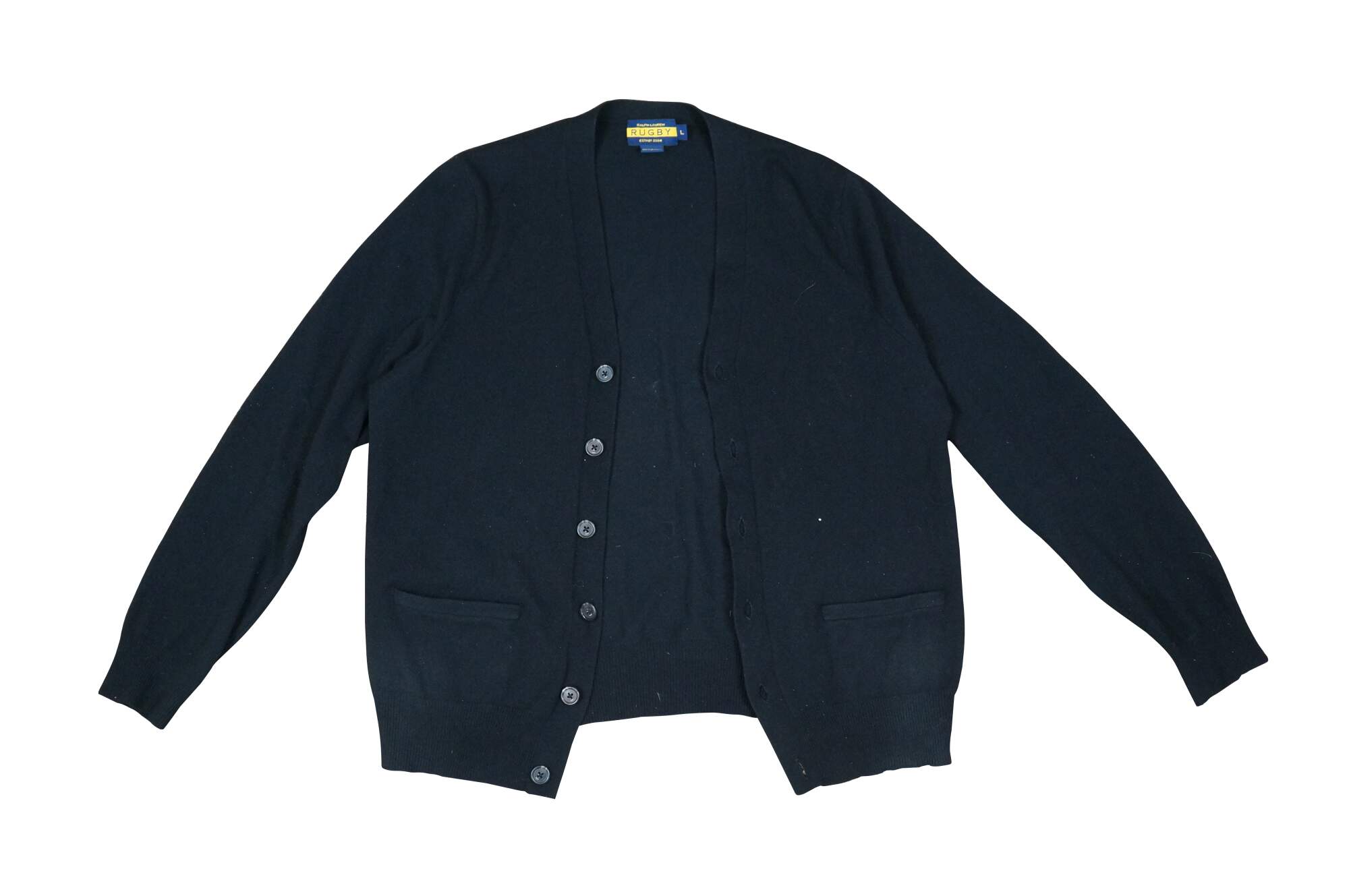 Vintage Ralph Lauren Rugby men's black cardigan sweater. Long sleeved, button up, with two hip pockets. 100% Cashmere.