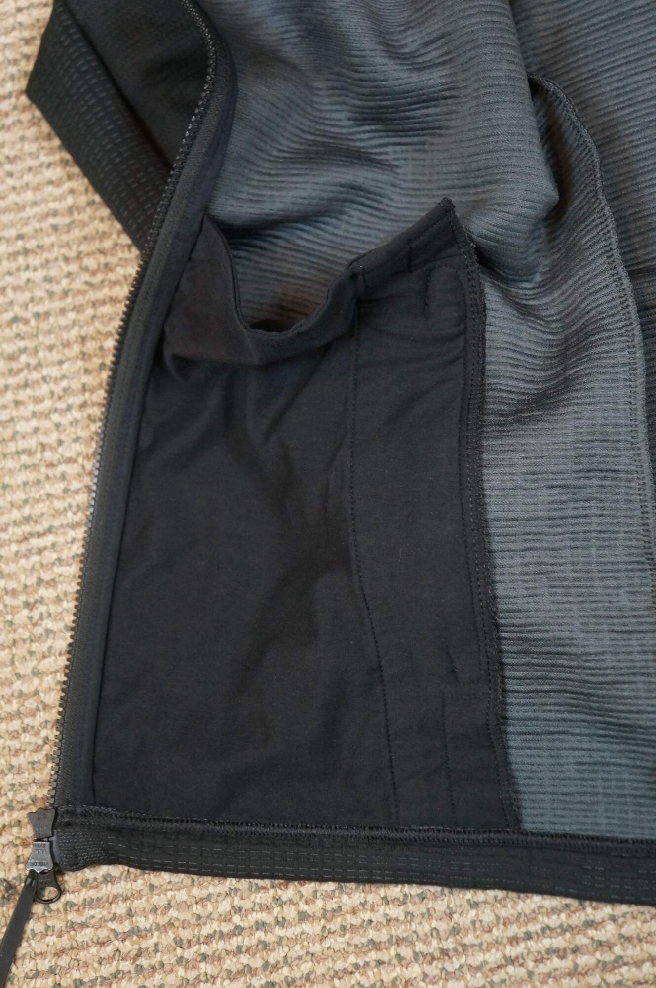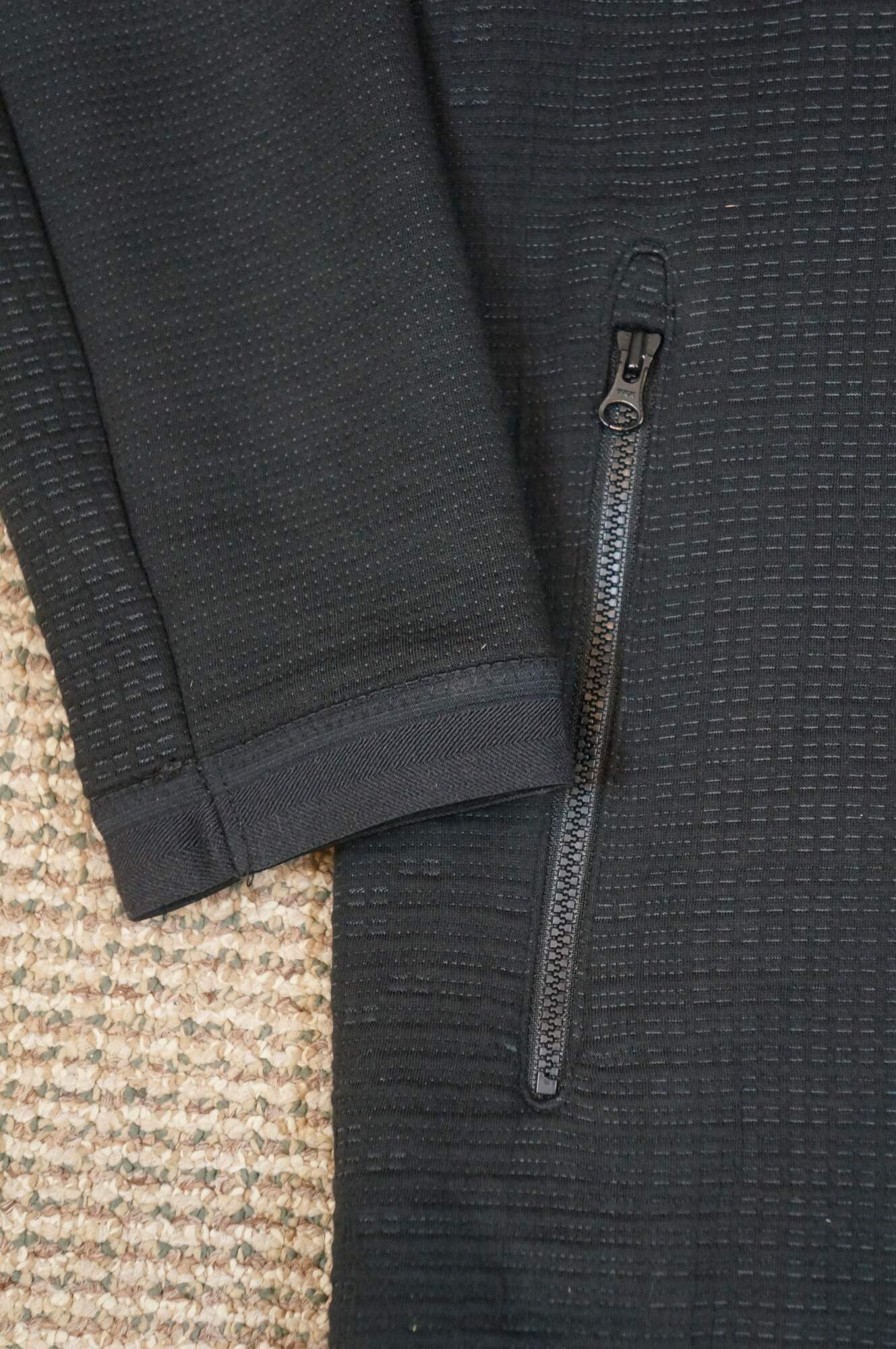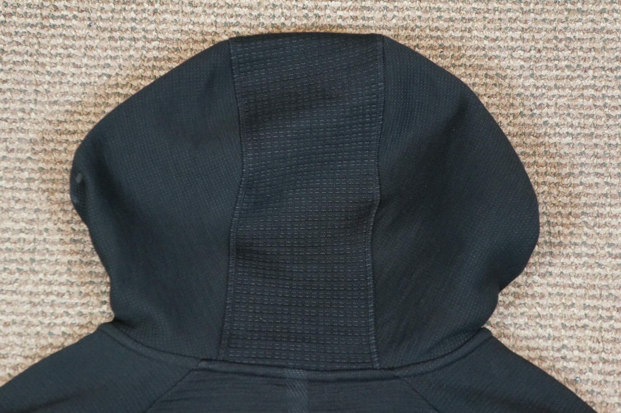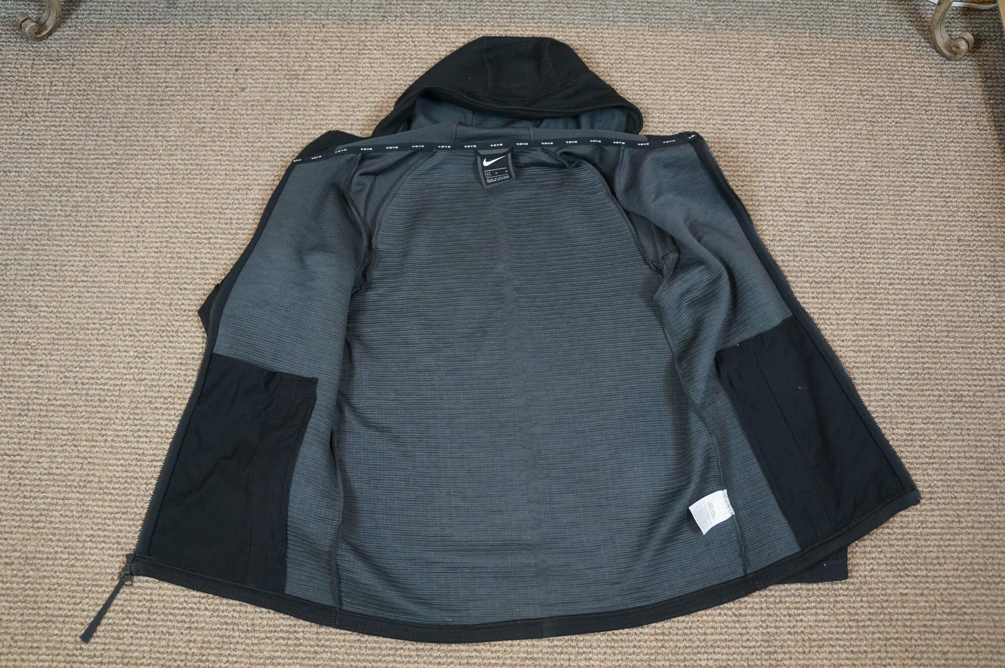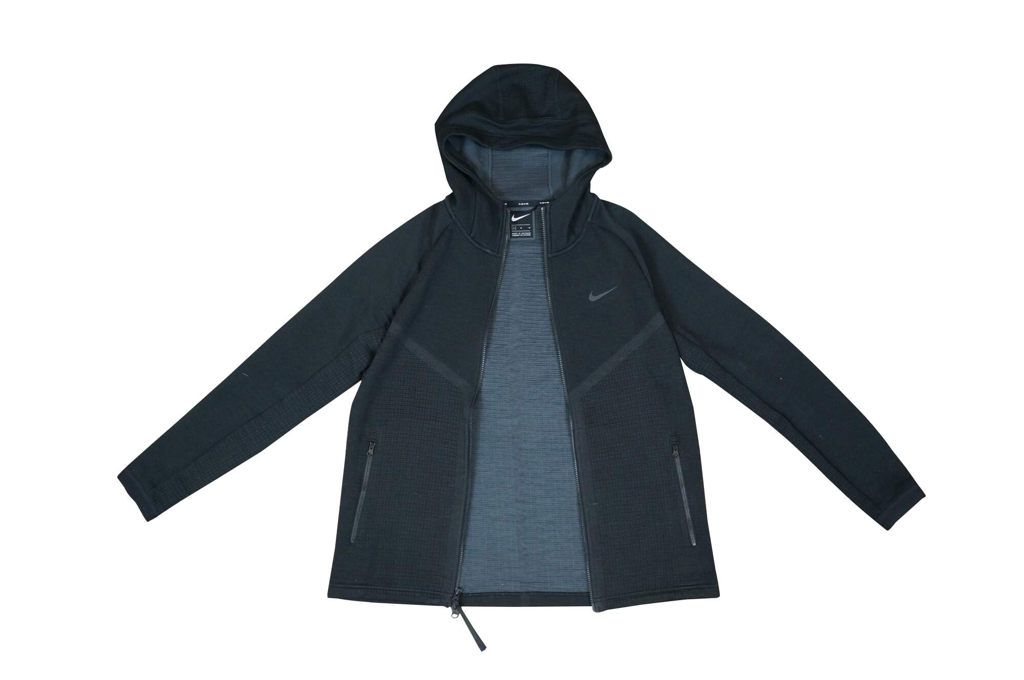 Vintage Nike men's Sportswear Tech Pack Windrunner hooded sweatshirt jacket. Black texture jersey. Zipper closure. Two exterior hip pockets, zipper closure. Two interior hip pockets. Polyester / Cotton blend. 14 09 11 05. Made in Vietnam.