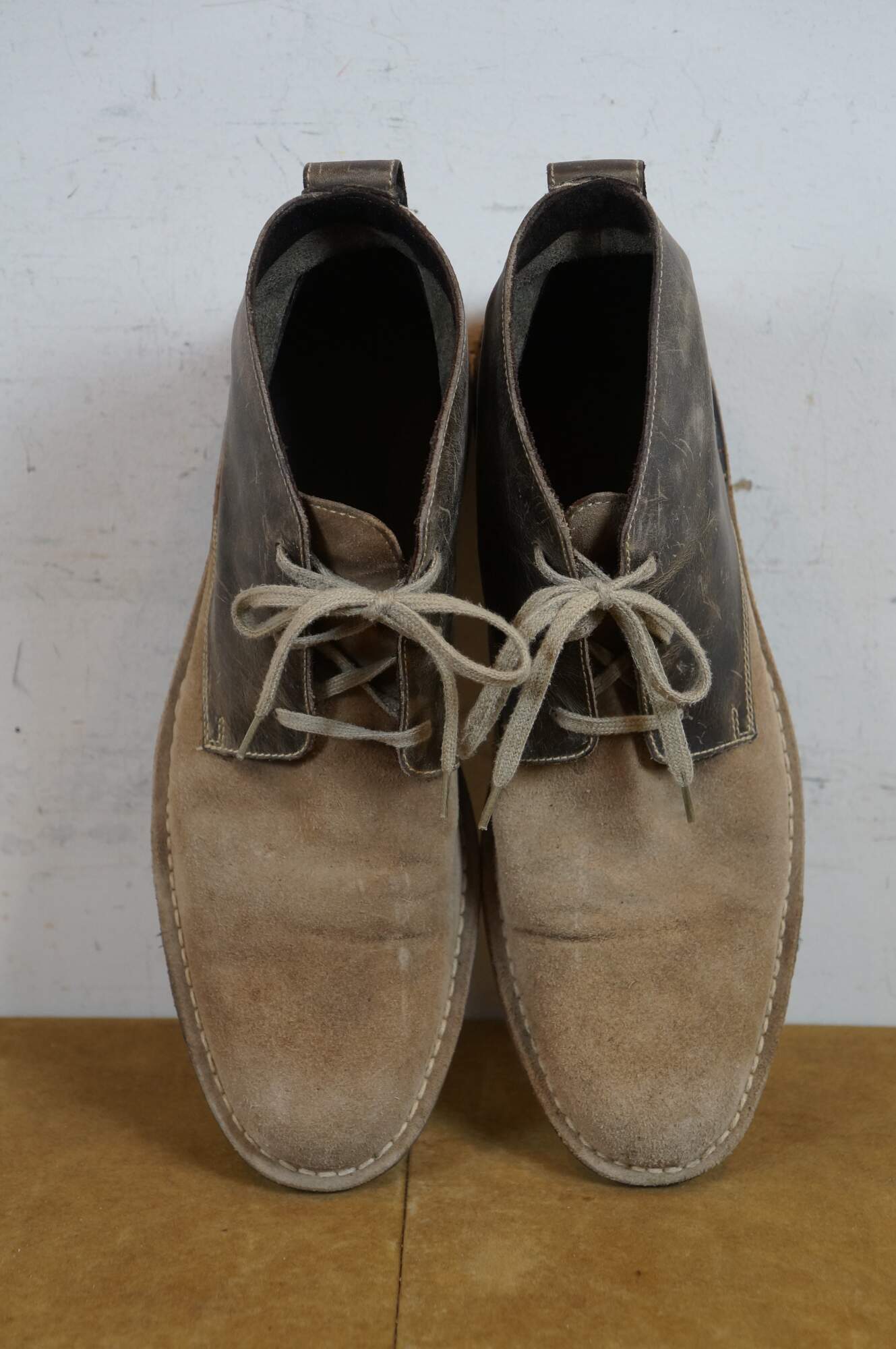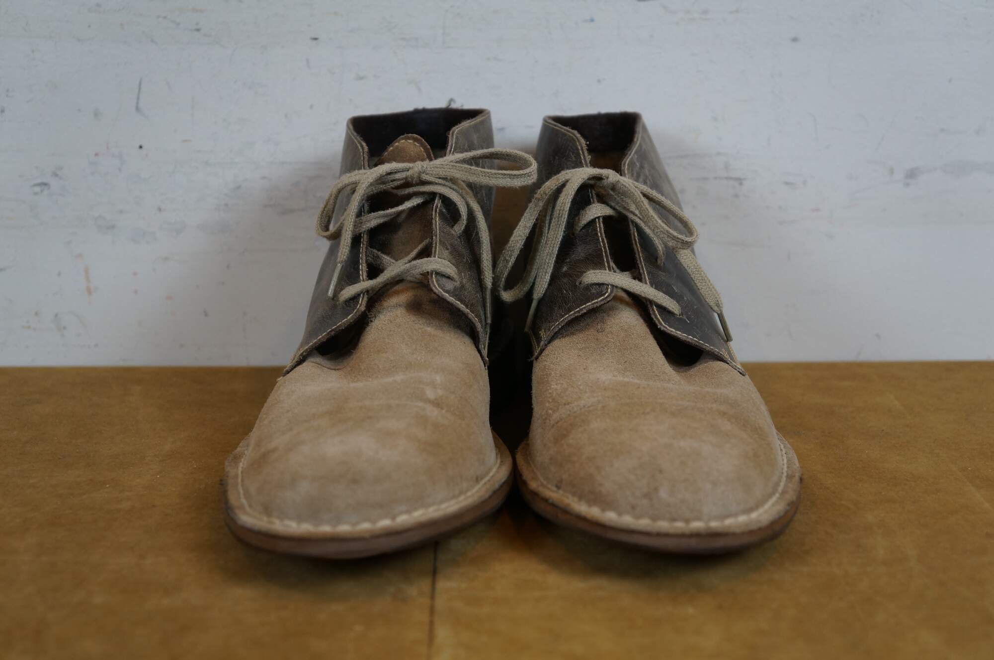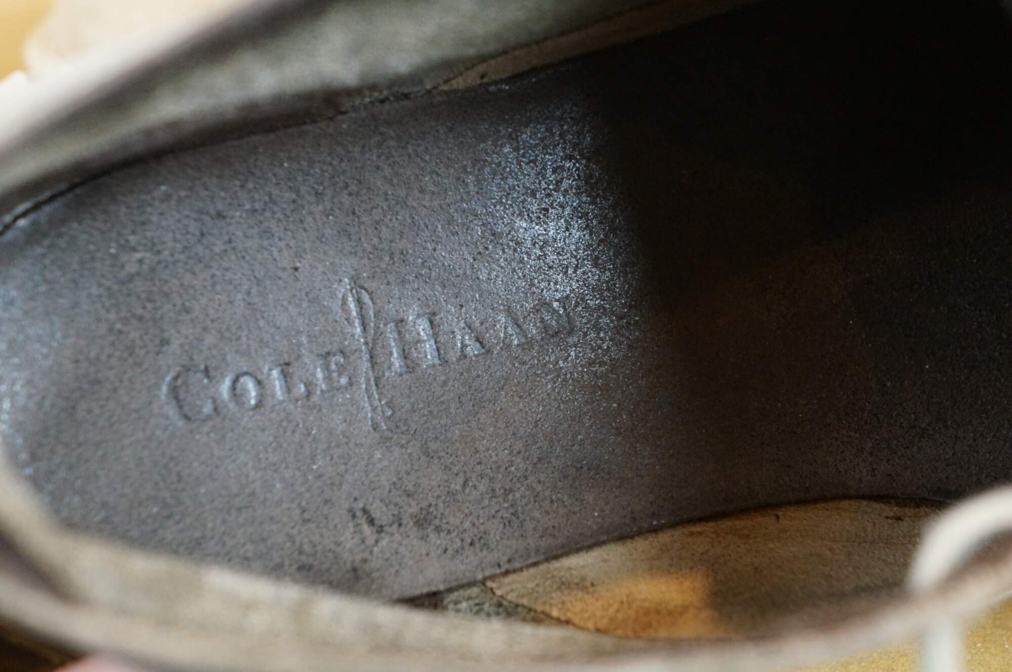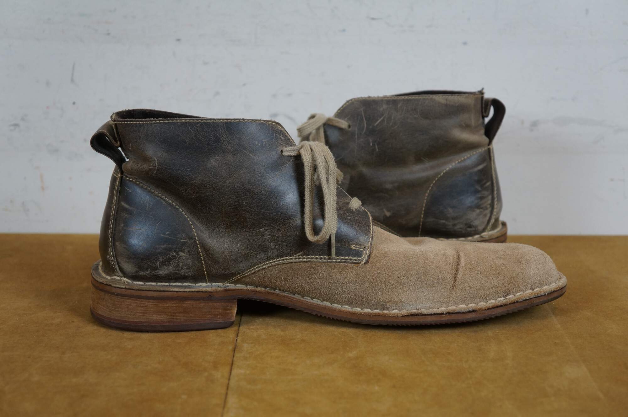 Vintage Cole Haan Dryden Chukka ankle height boot in Cinder / Milkshake. C10653 U D2. Dark brown leather ankle with beige suede toe and brown sole. Made in India. Includes box.
