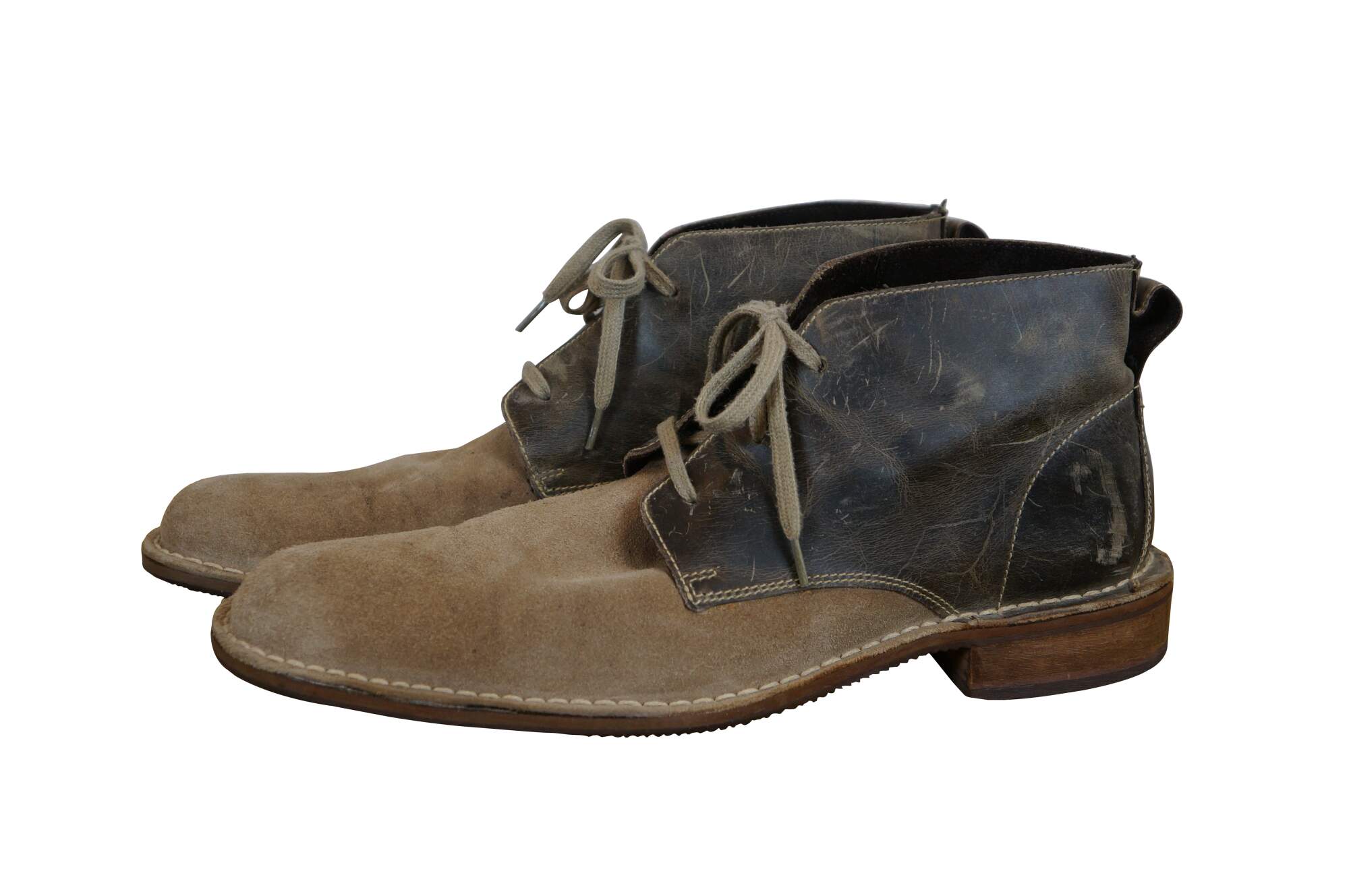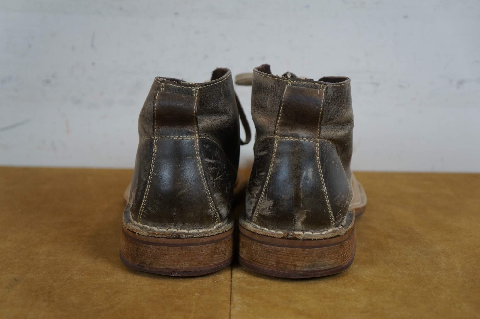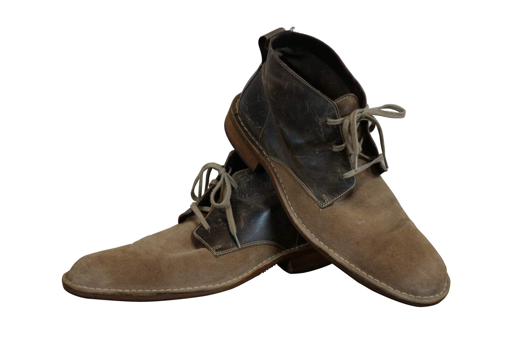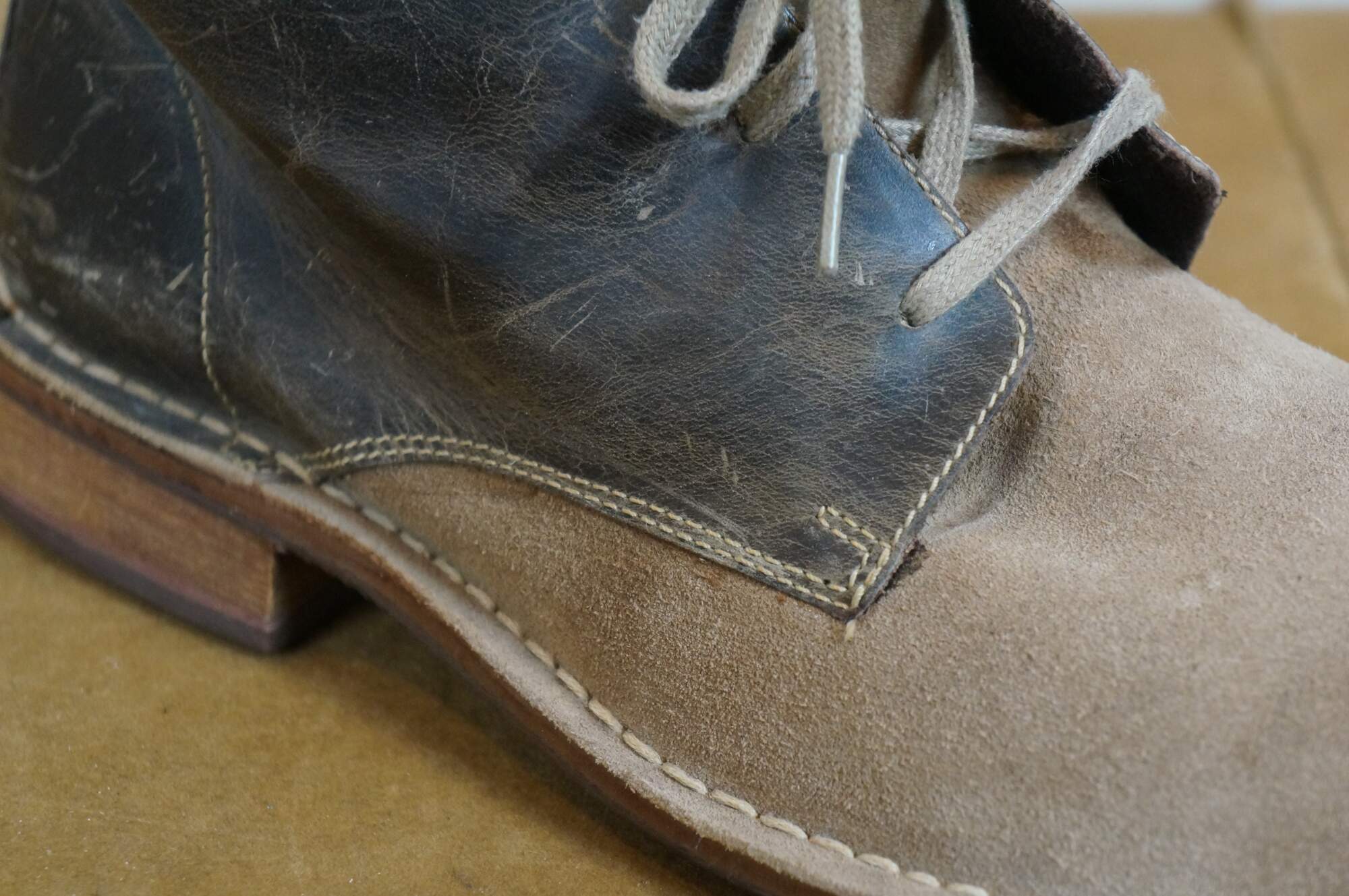 Vintage Cole Haan Dryden Chukka ankle height boot in Cinder / Milkshake. C10653 U D2. Dark brown leather ankle with beige suede toe and brown sole. Made in India. Includes box.