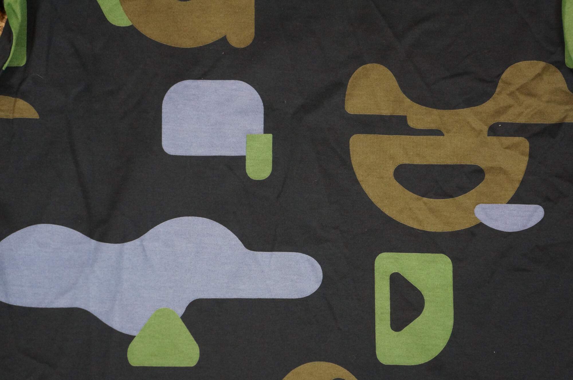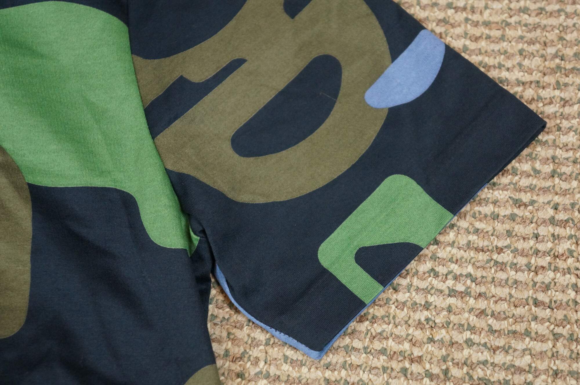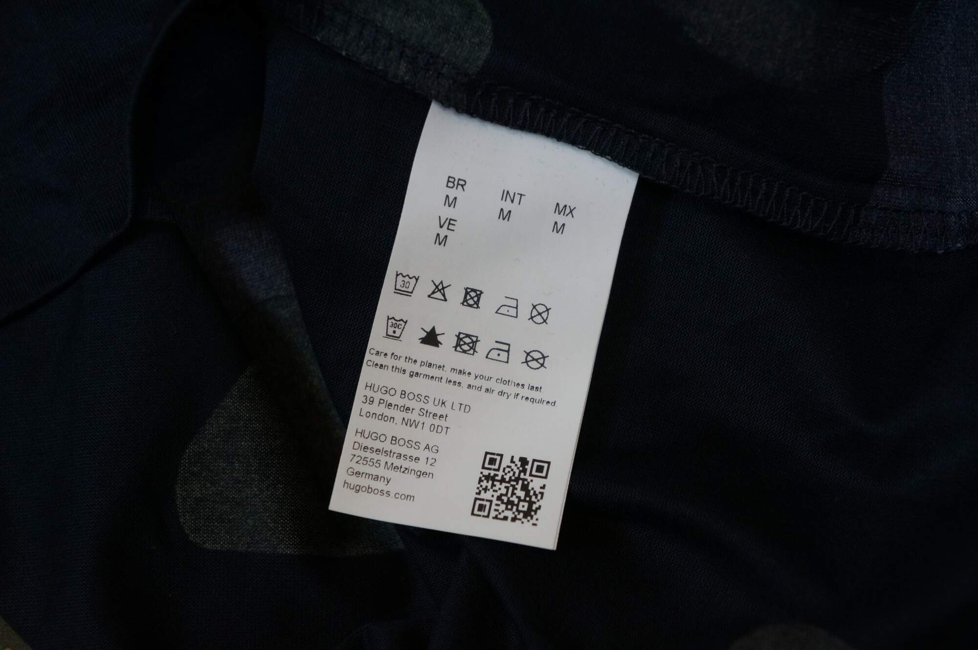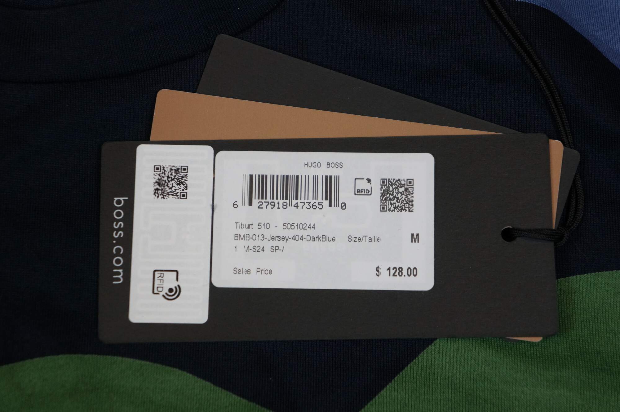 Vintage Hugo Boss men's mercerized cotton t-shirt; short sleeve, crew neck. Navy blue with light blue, brown, and green abstract camoflage design. BMB-013 Jersey 404 Dark Blue. Made in Portugal.