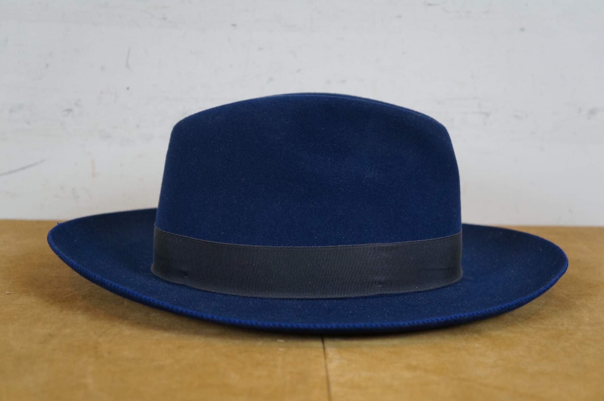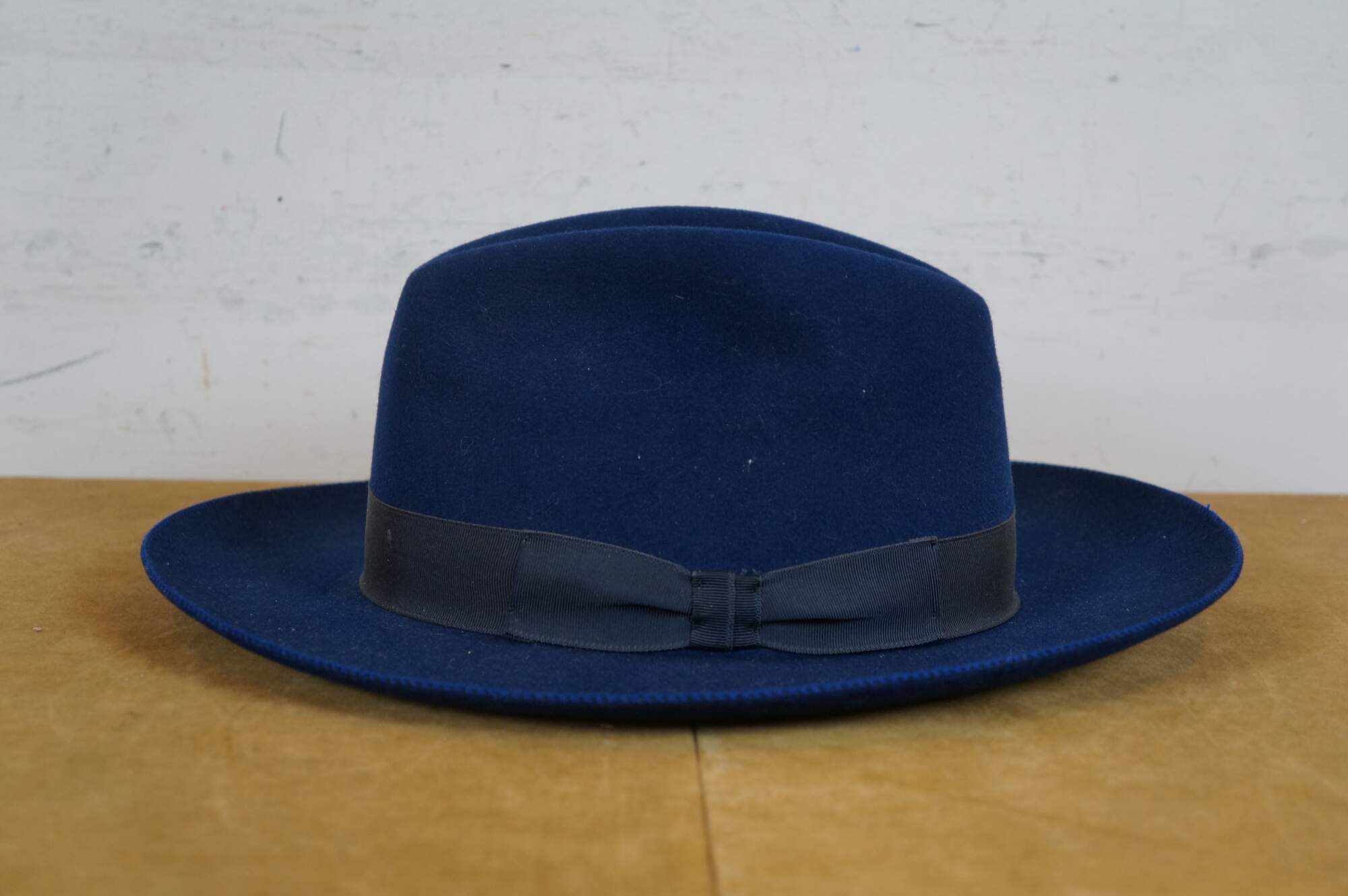 Vintage Stefeno Rodney small brim fedora. Navy blue 100% Fur Felt with black grosgrain ribbon band with bow detail. Handmade in Spain.
