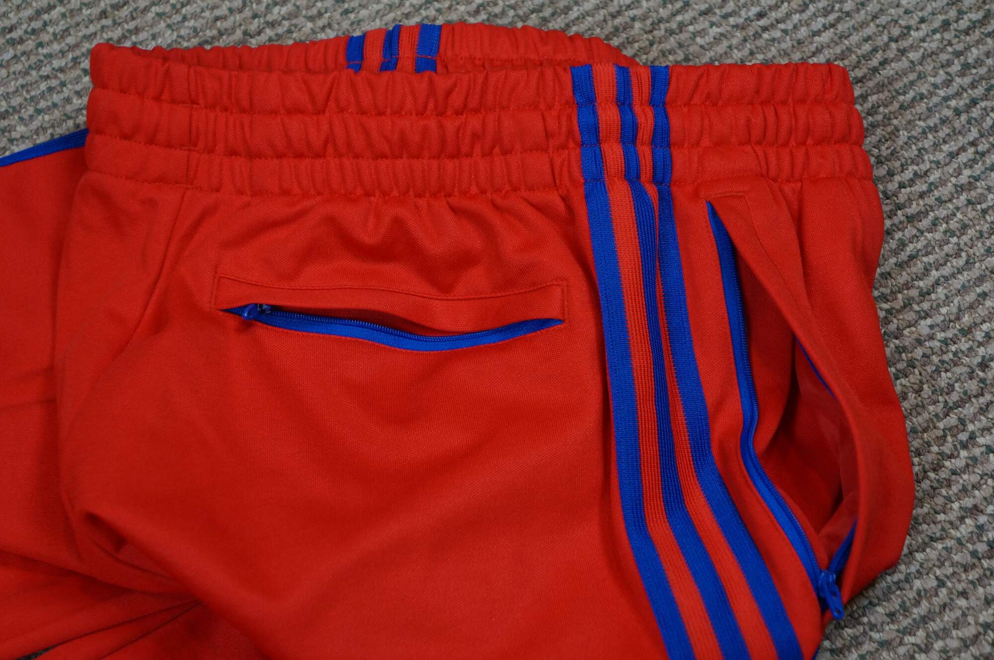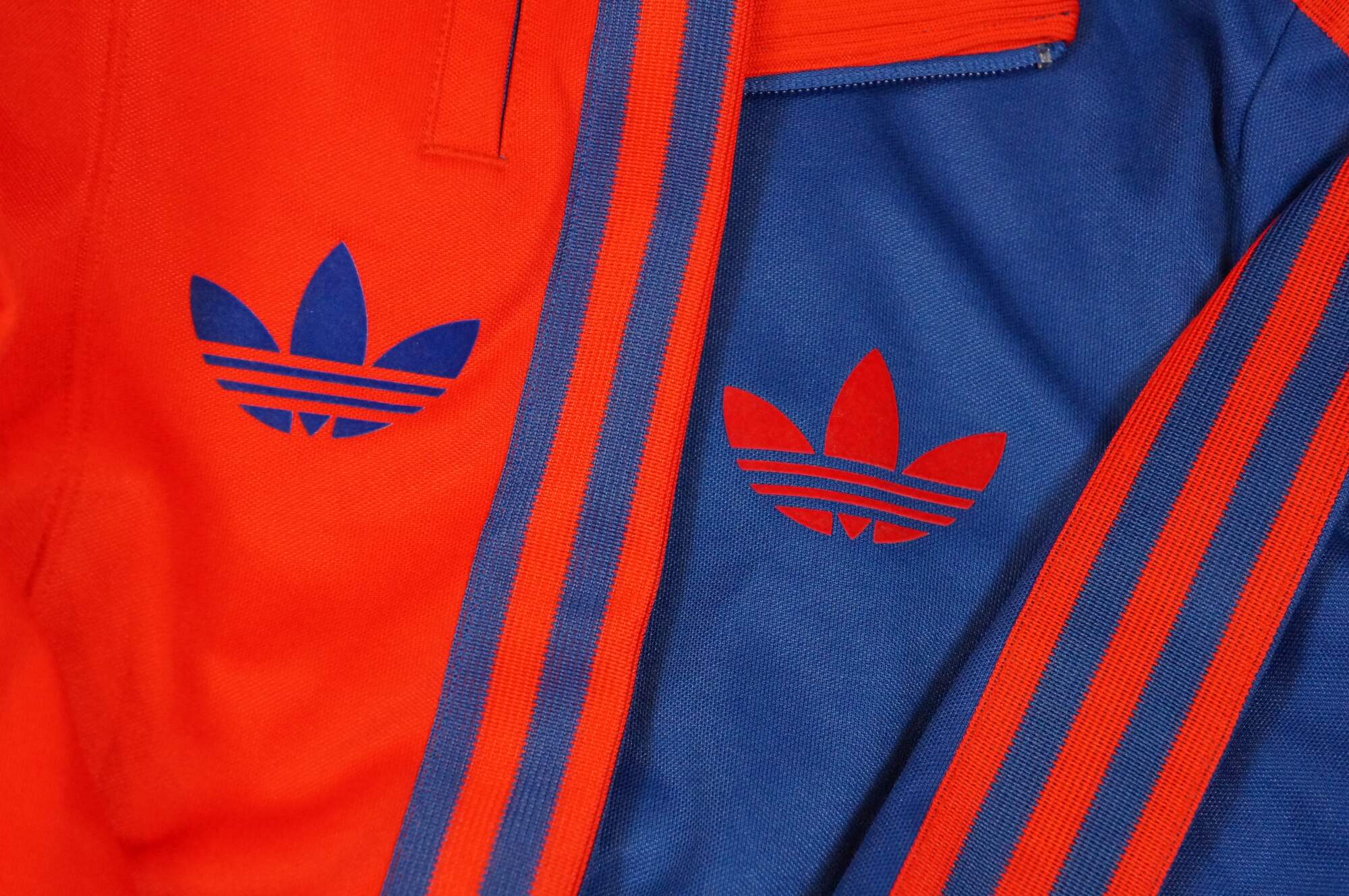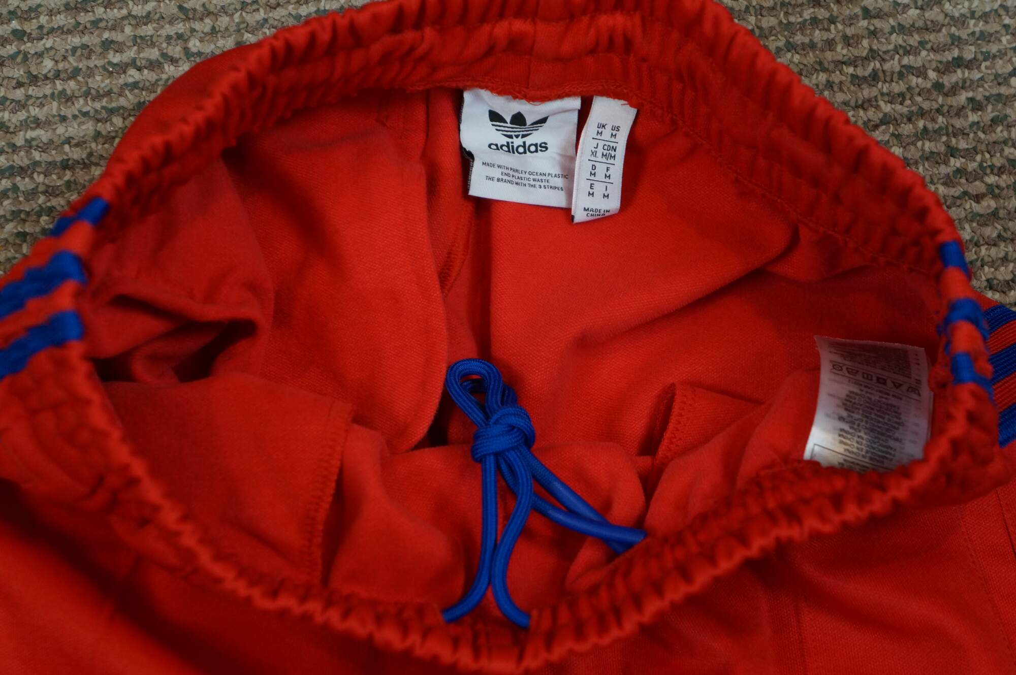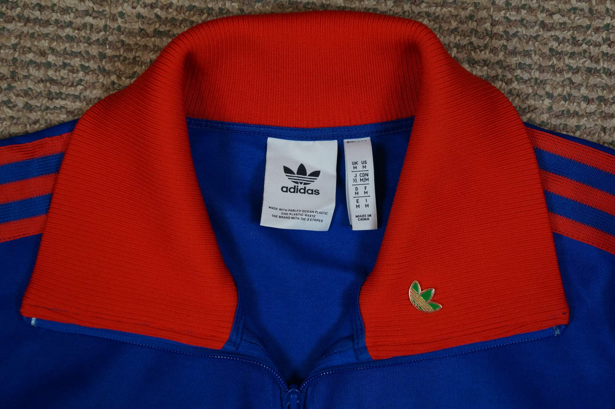 Vintage Adidas men's three stripes track suit. Pants red with blue stripe; elastic and drawstring waist; two zippered hip pockets and one zippered back pocket. Jacket blue with red stripe; full zip; two zippered pockets. Made with Parley Ocean Plastic. Made in China.