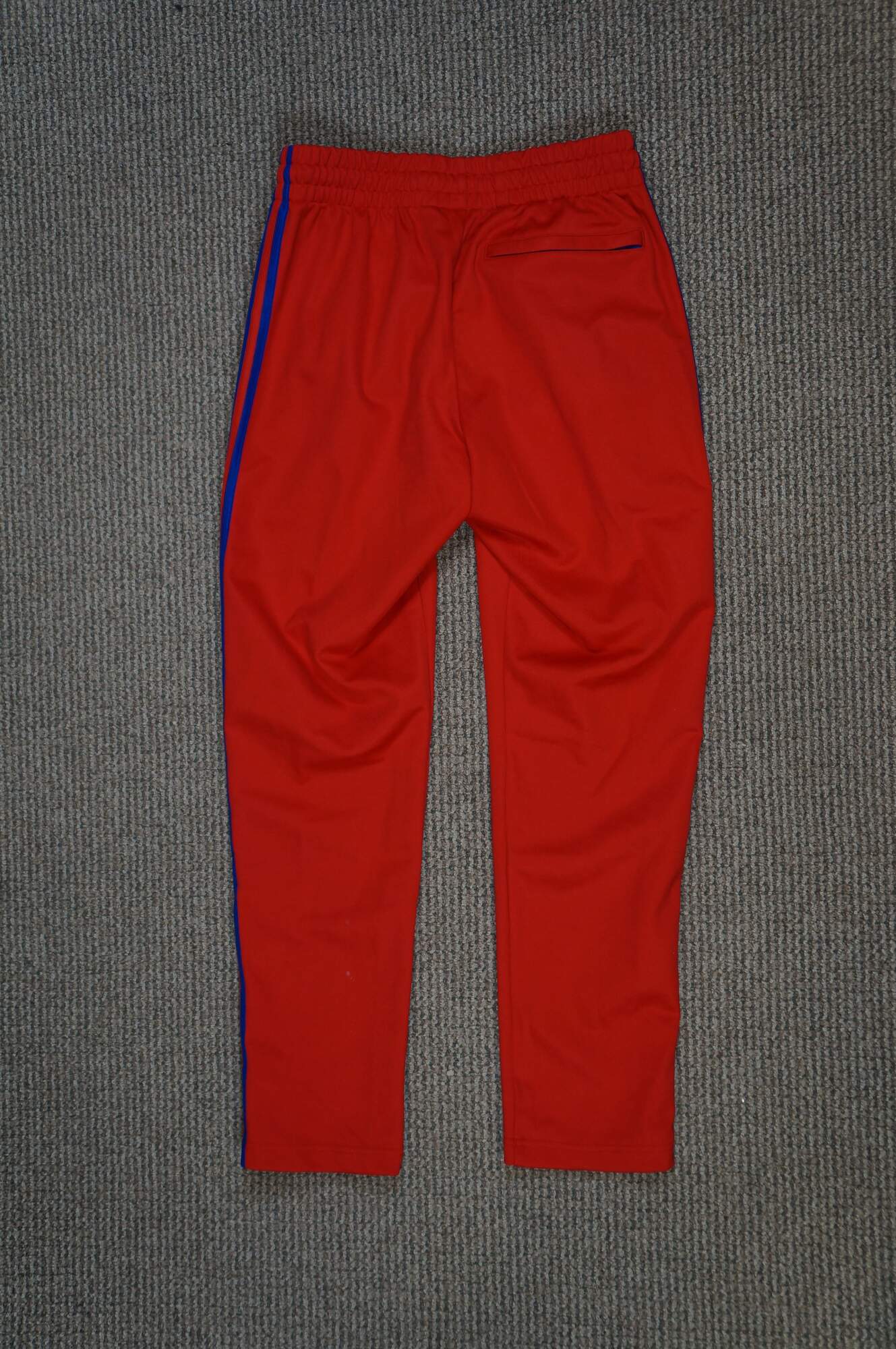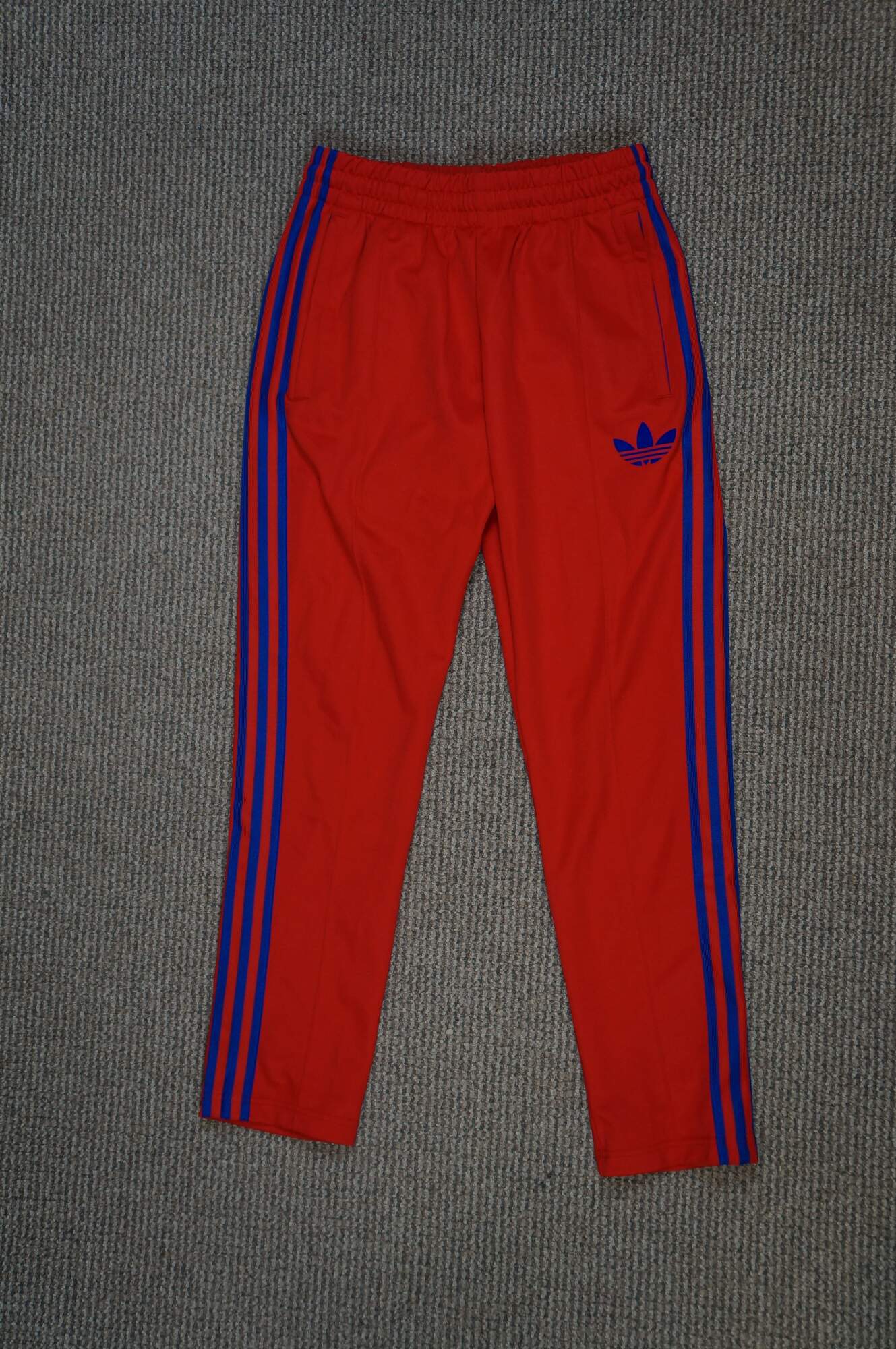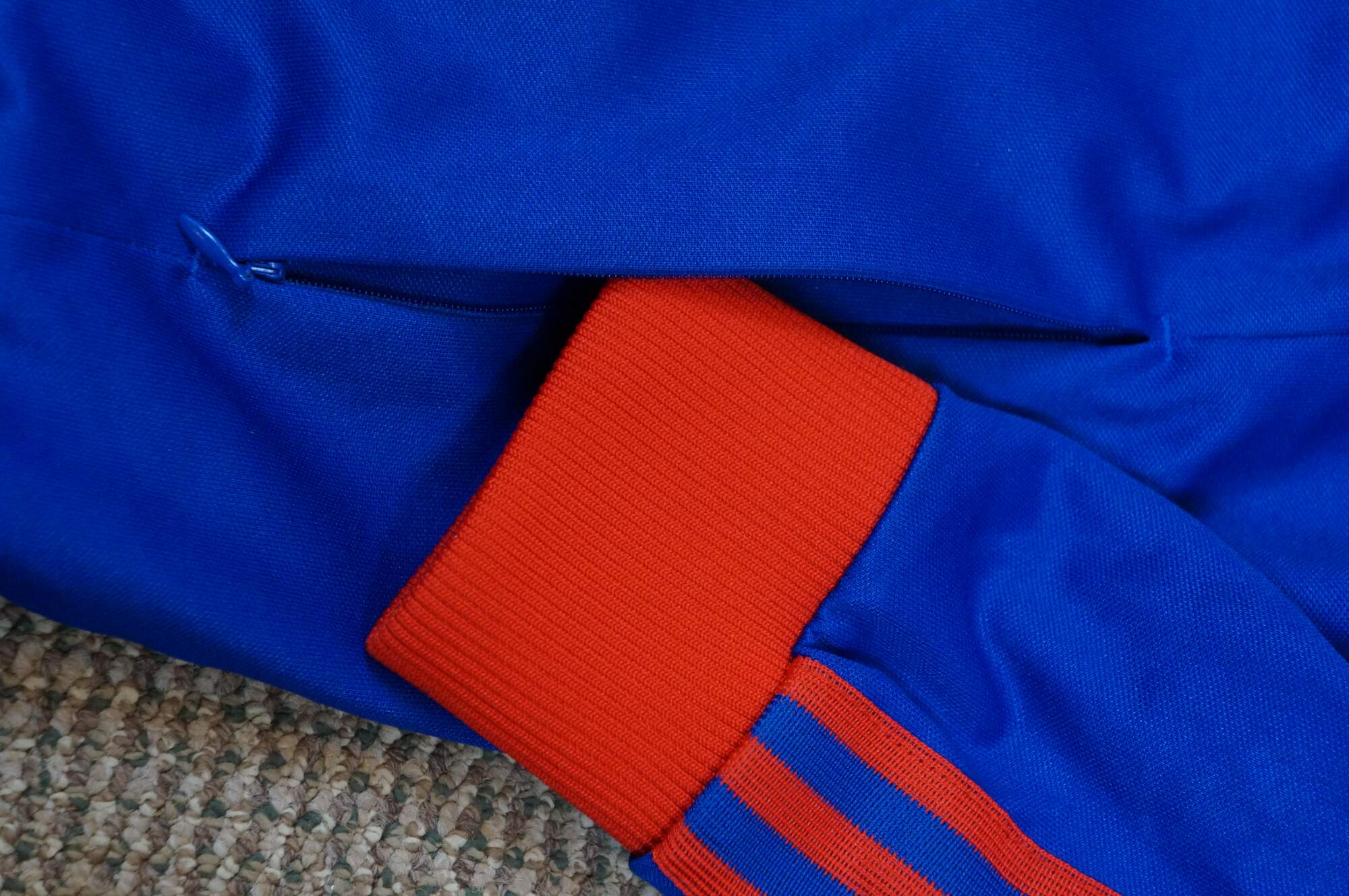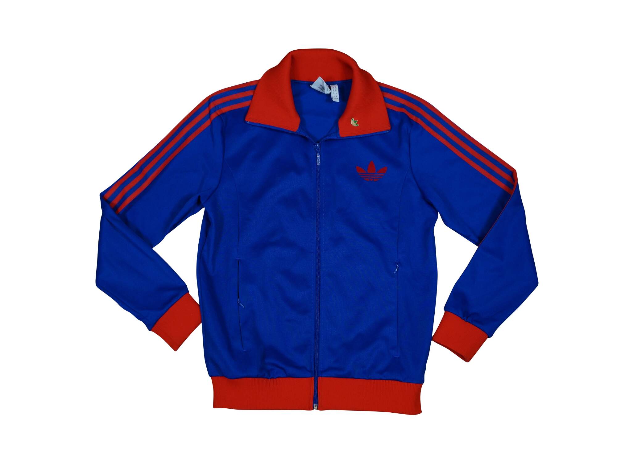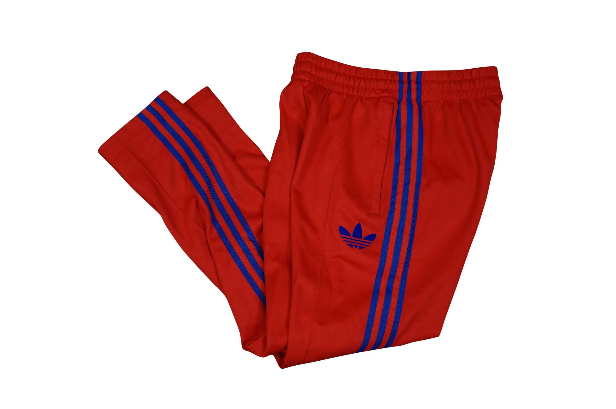 Vintage Adidas men's three stripes track suit. Pants red with blue stripe; elastic and drawstring waist; two zippered hip pockets and one zippered back pocket. Jacket blue with red stripe; full zip; two zippered pockets. Made with Parley Ocean Plastic. Made in China.