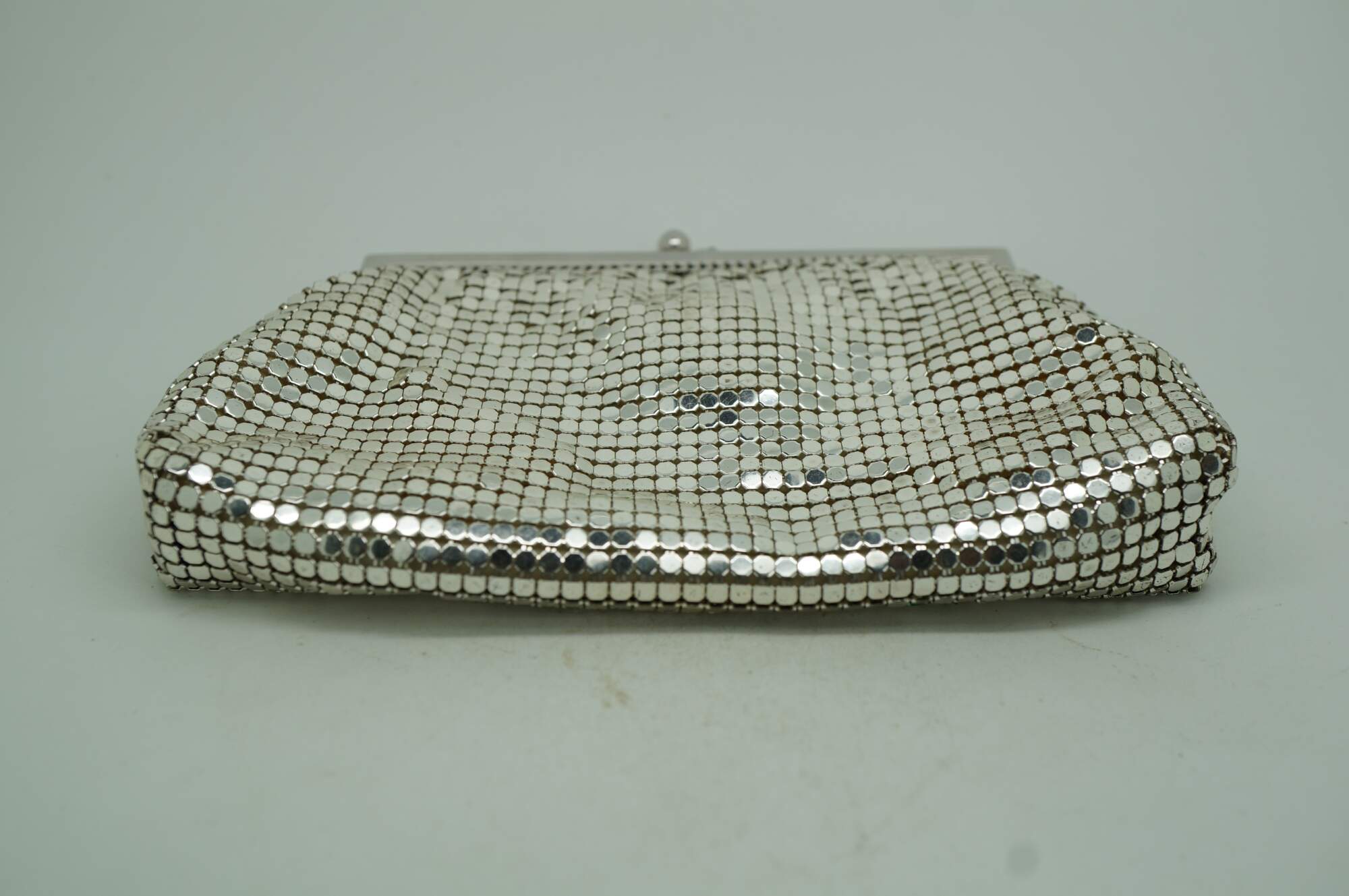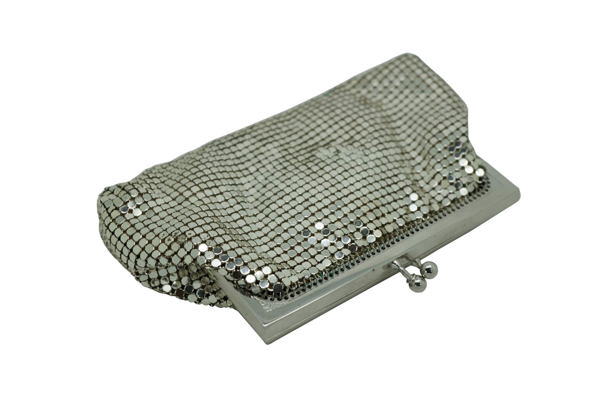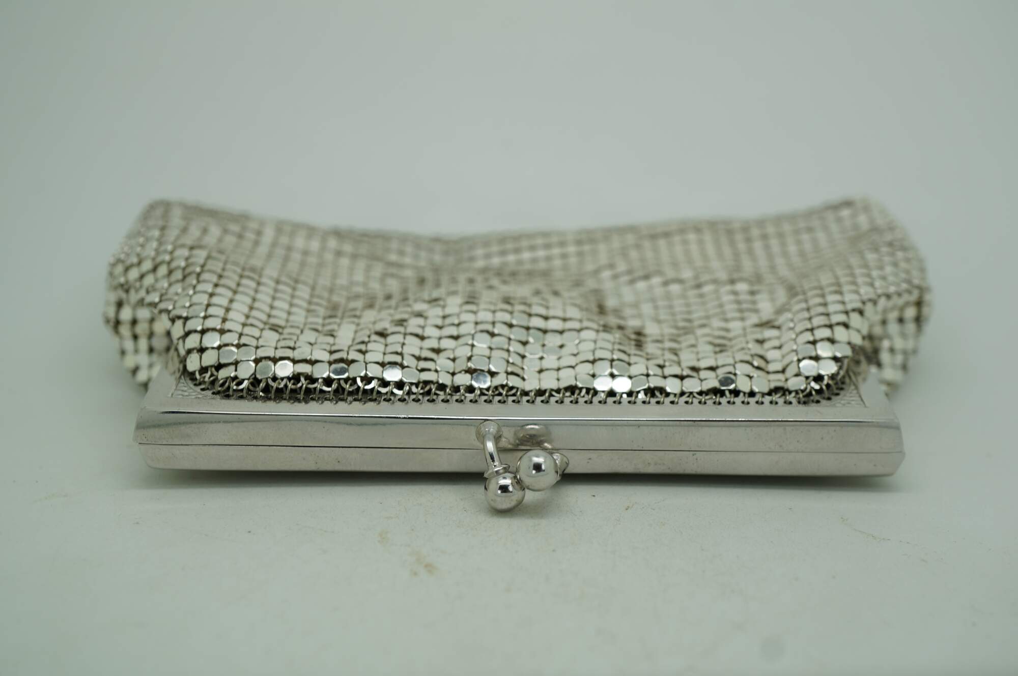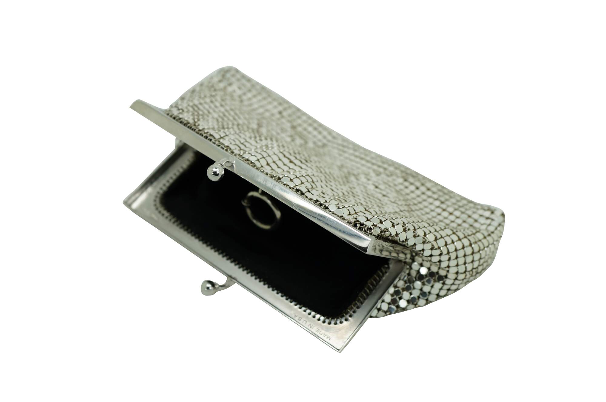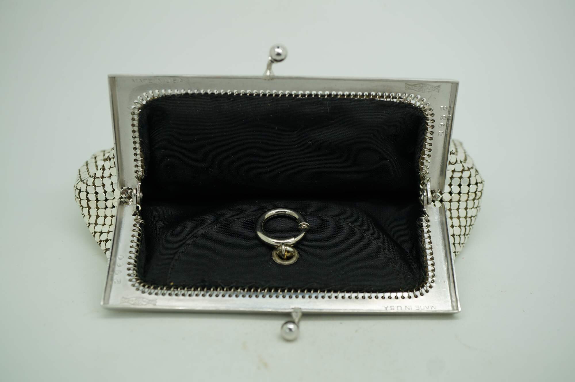 Mid century Whiting & Davis silver tone metal mesh cocktail purse / clutch with kiss clasp and retractable watch chain inside. Black lining. Made in USA. Number 2960.