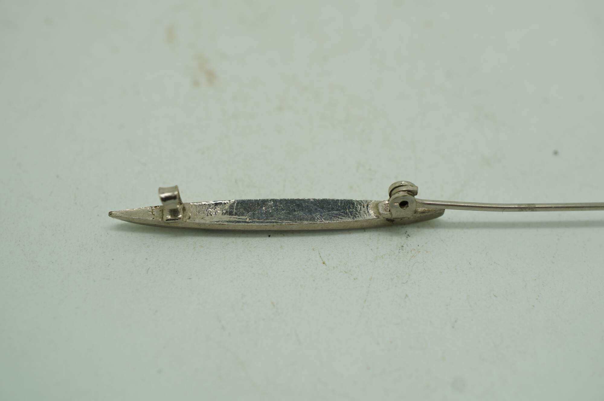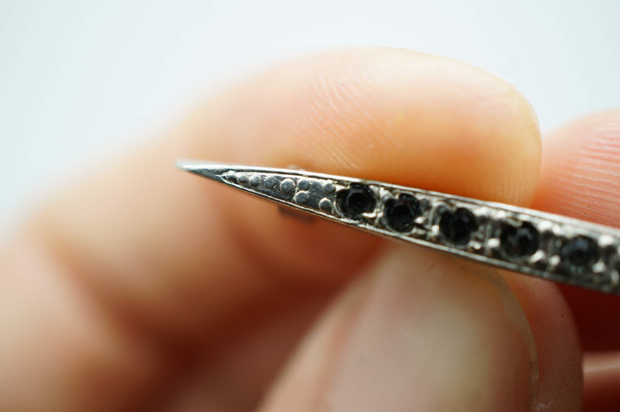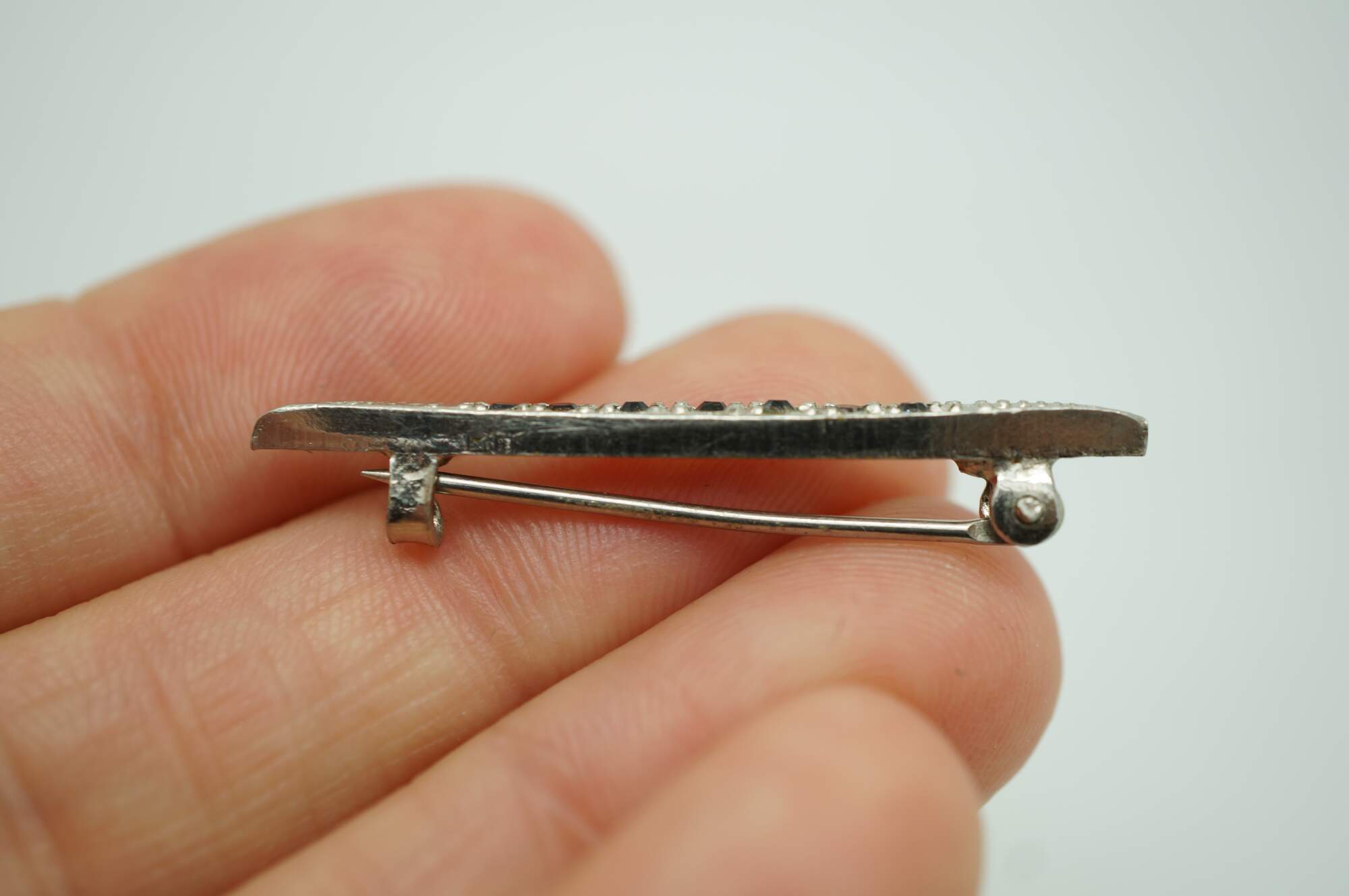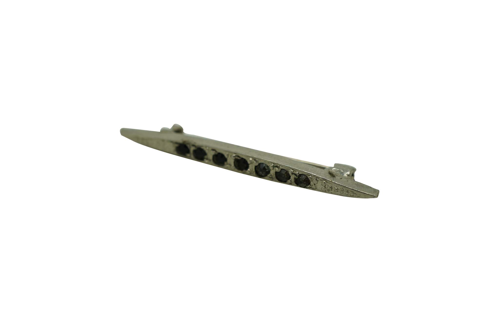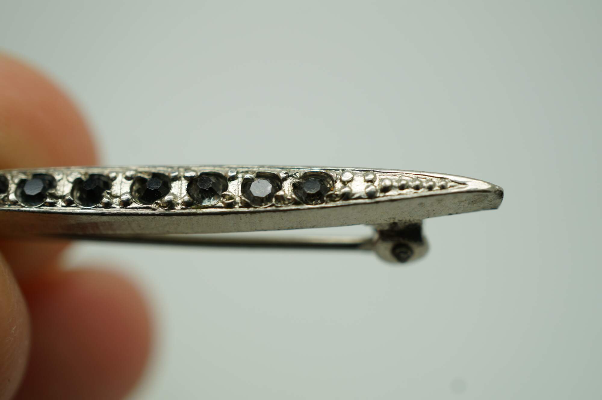Early 20th century art deco style pin / brooch featuring a bright chrome, narrow almond shape set with seven dark, smoky rhinestones.
