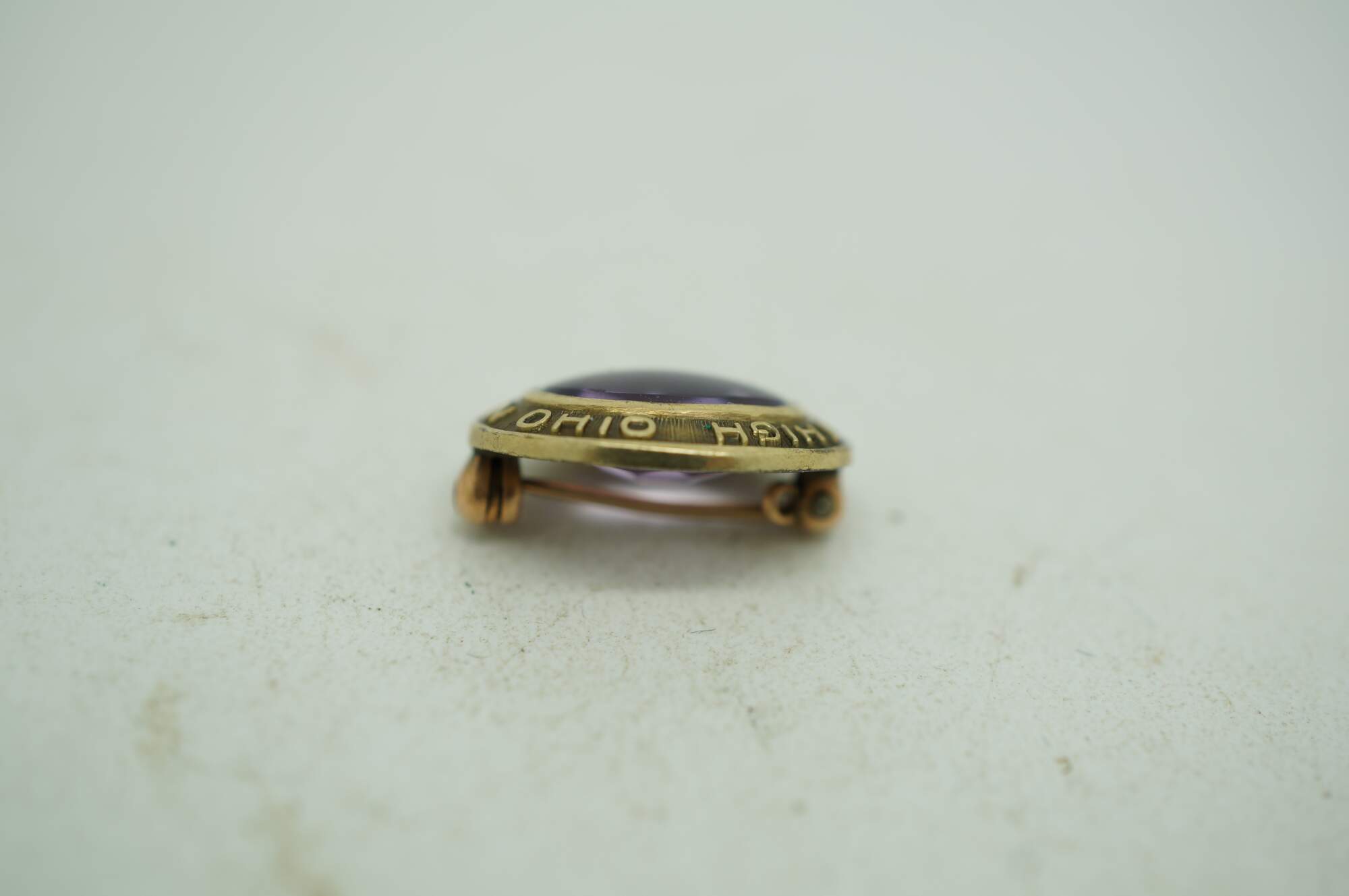 Circa mid 20th century Peters Co high school class lapel pin. 10K yellow gold oval frame marked Fairmont High Dayton Ohio, surrounding a light purple amethyst stone. Monogrammed RJR on reverse. No date / year.