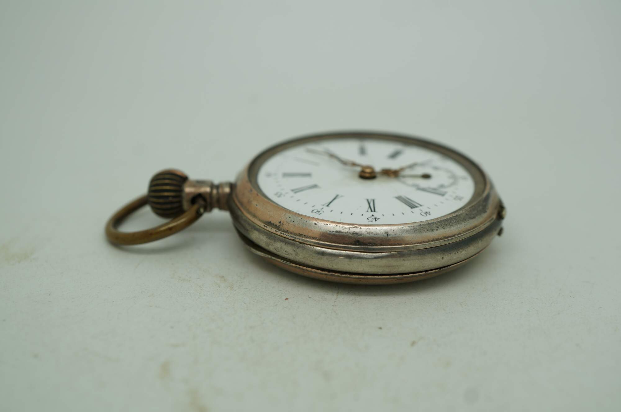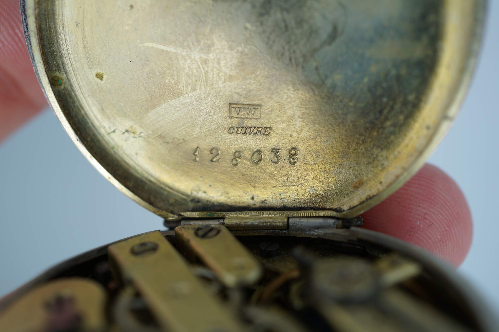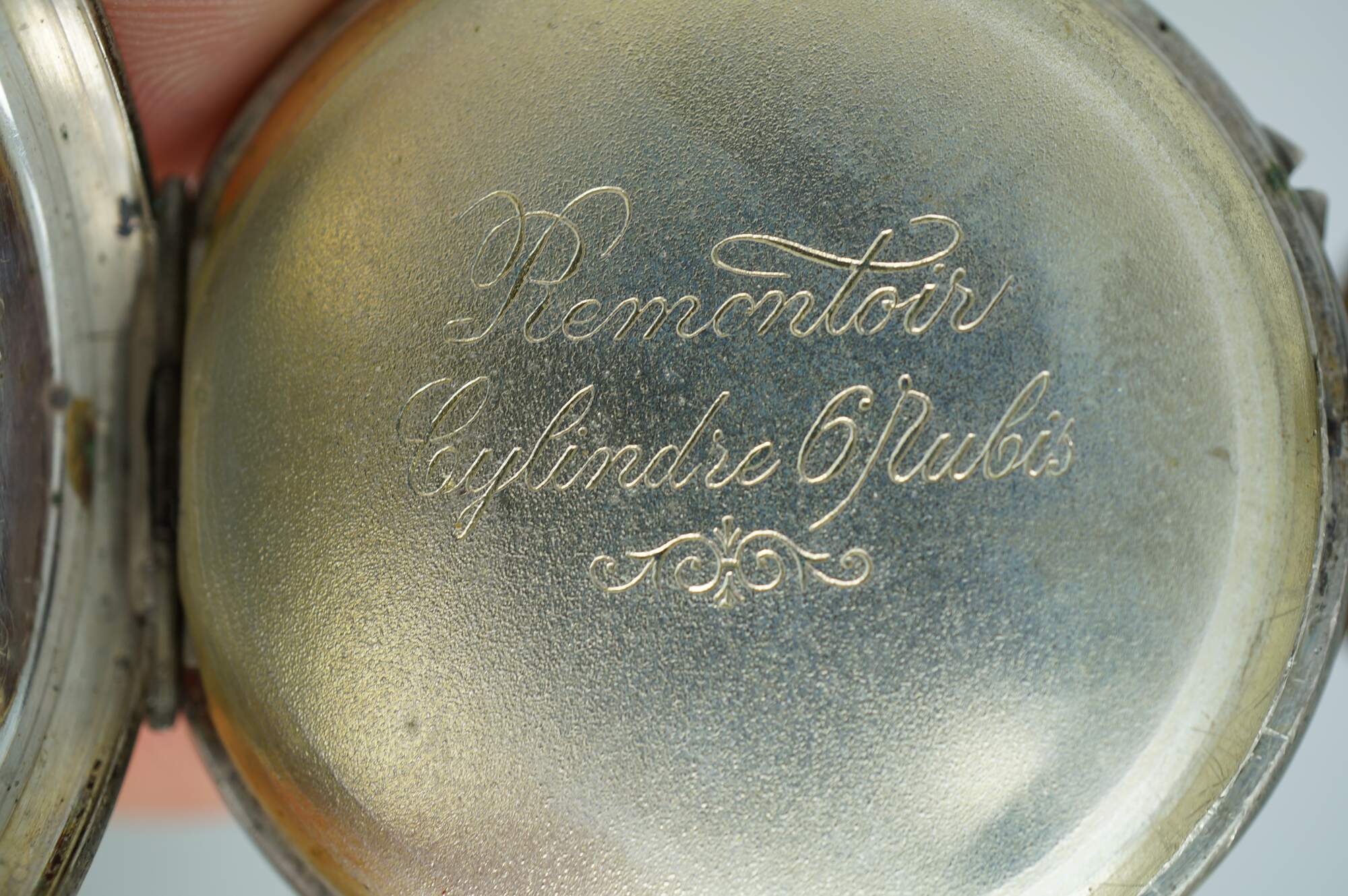 Antique 800 German silver Remontoir pocket watch. White face with black Roman numerals for the hours and Arabic numerals for the seconds and auxiliary dial; ornate gilt brass hands; missing glass. Remontoir Cylindre 6 Rubis. Three part butterfly case marked with the German national purity mark of the moon and crown (Halbmond & Krone), Swiss grouse purity mark (used circa 1882-1934), 0,800, unidentified V.W maker's mark, Cuivre, and numbered 128038. Back etched with a simple shield framed with striped rings and leaves.