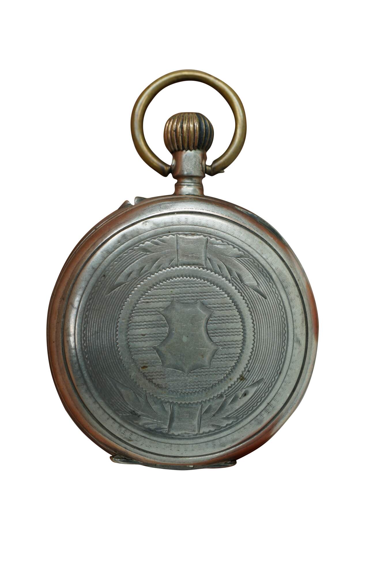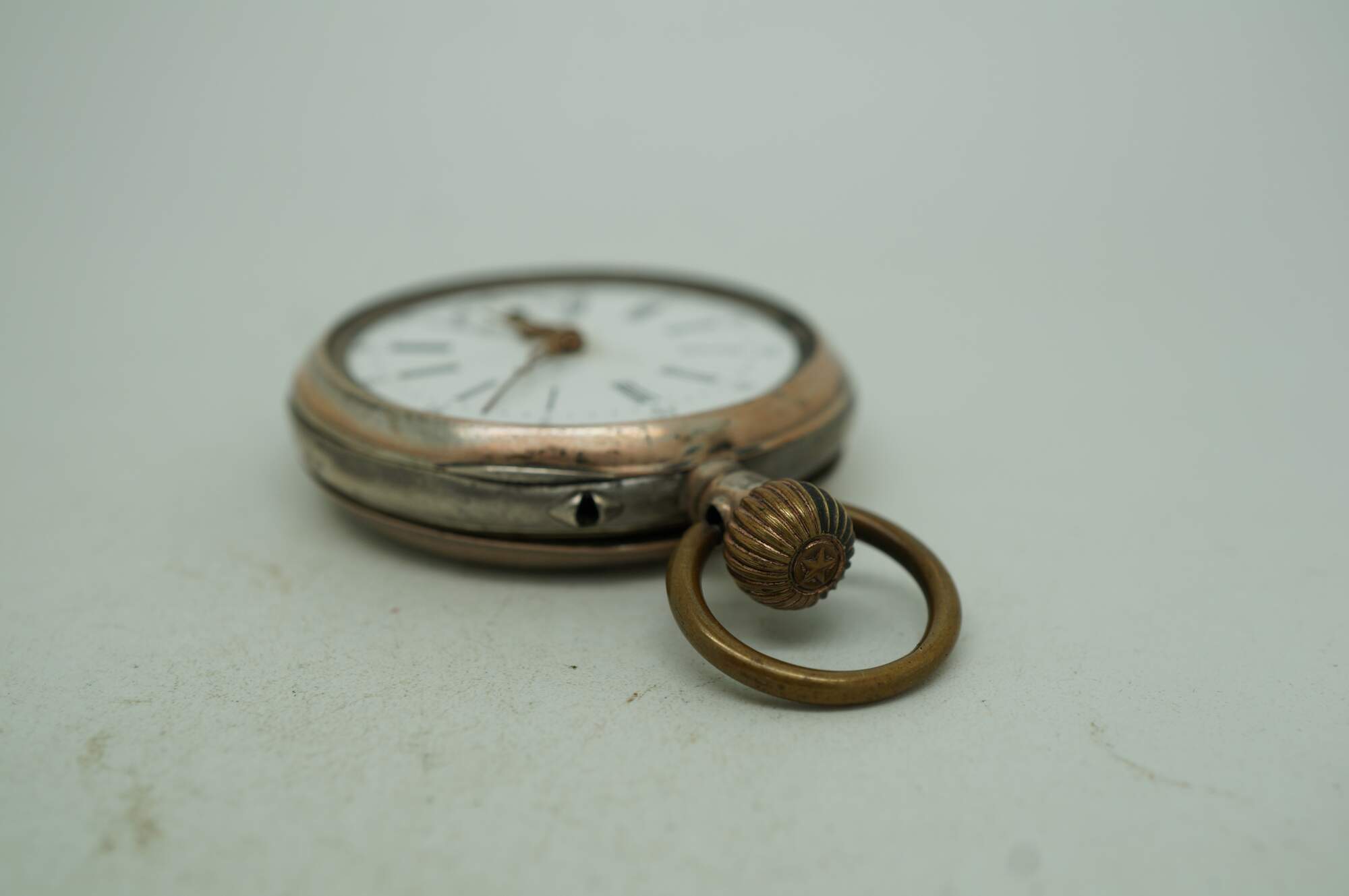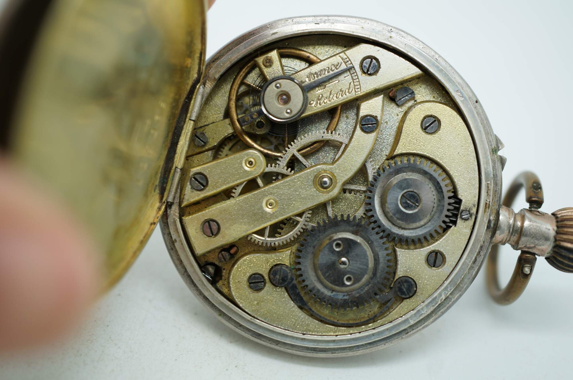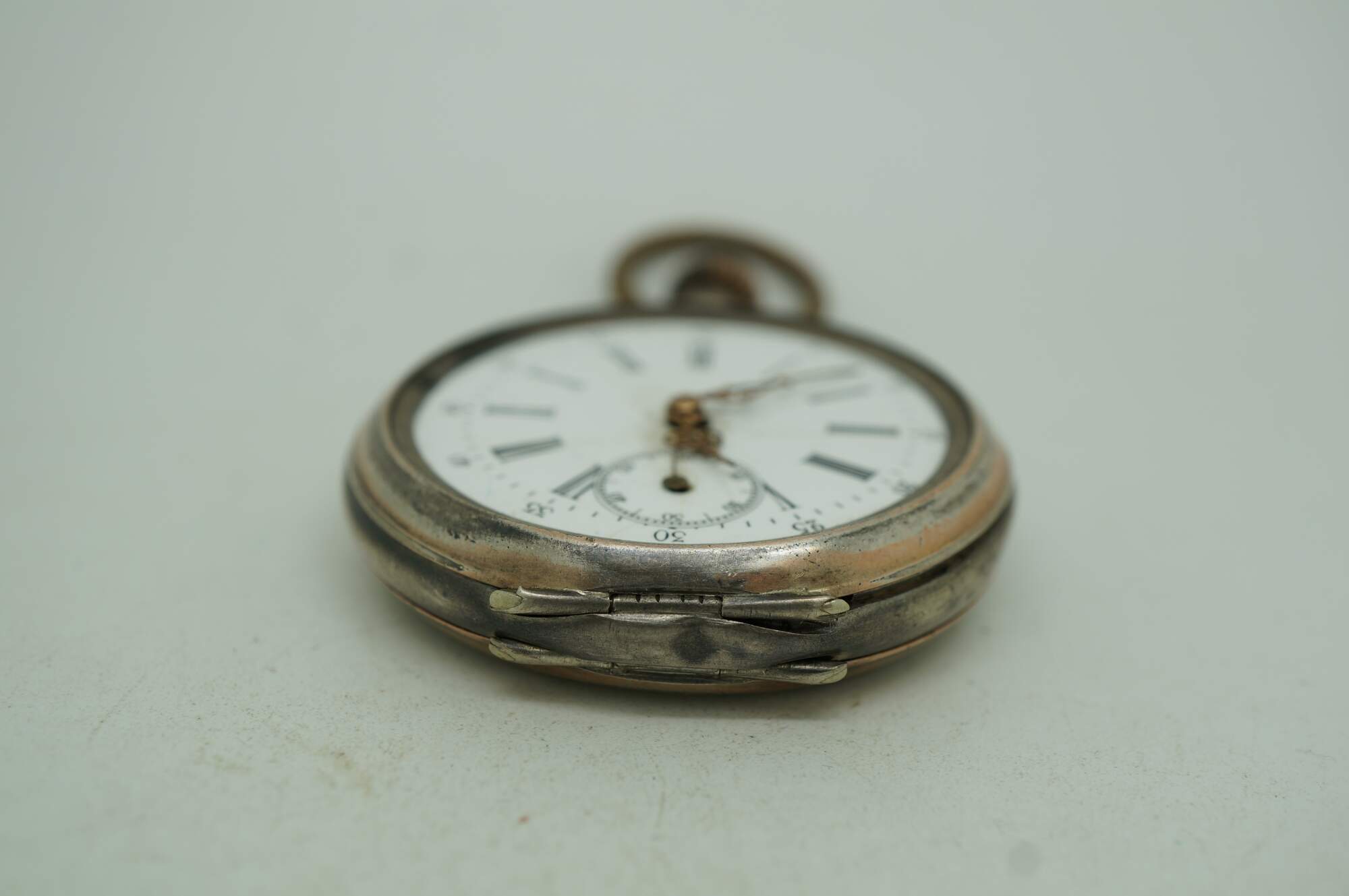 Antique 800 German silver Remontoir pocket watch. White face with black Roman numerals for the hours and Arabic numerals for the seconds and auxiliary dial; ornate gilt brass hands; missing glass. Remontoir Cylindre 6 Rubis. Three part butterfly case marked with the German national purity mark of the moon and crown (Halbmond & Krone), Swiss grouse purity mark (used circa 1882-1934), 0,800, unidentified V.W maker's mark, Cuivre, and numbered 128038. Back etched with a simple shield framed with striped rings and leaves.