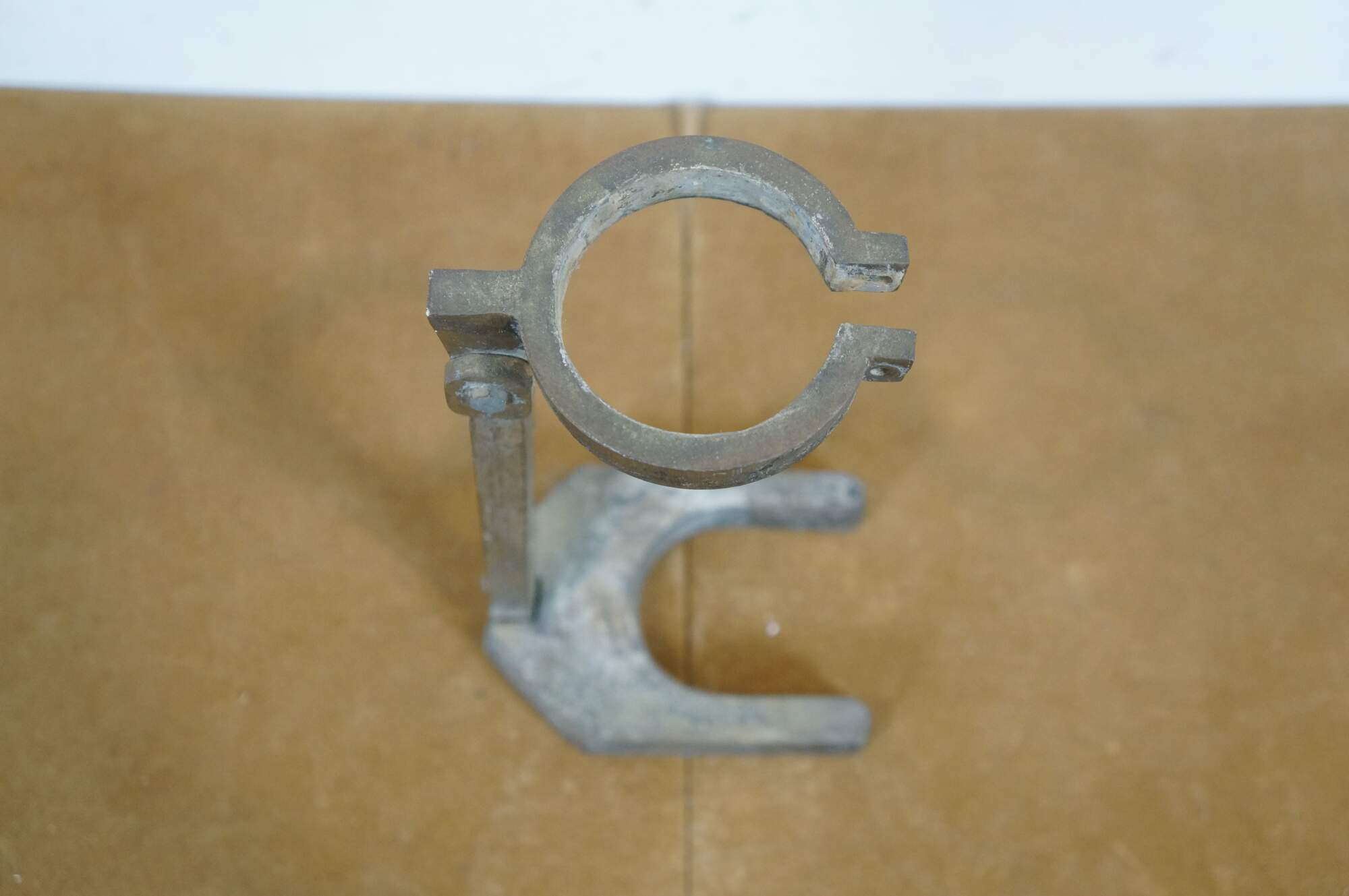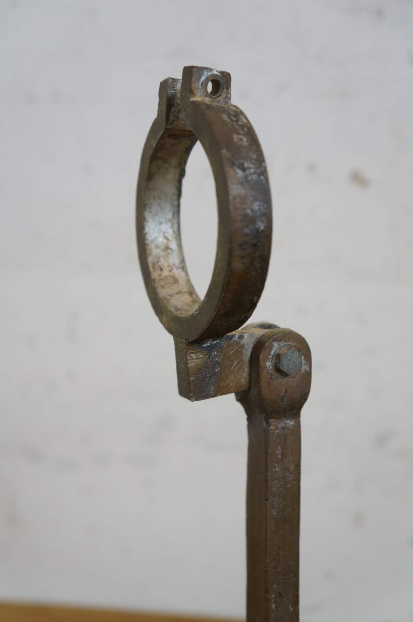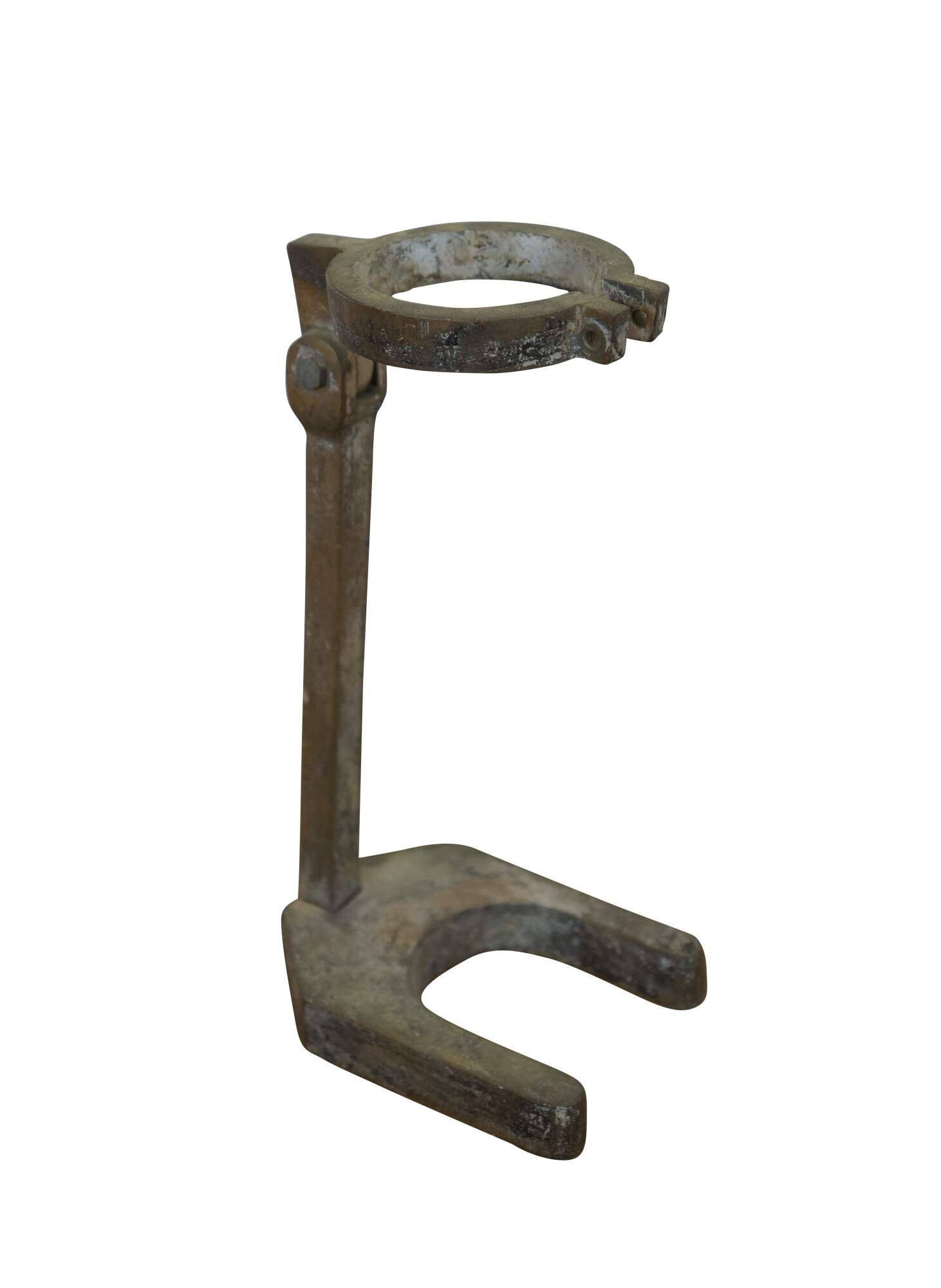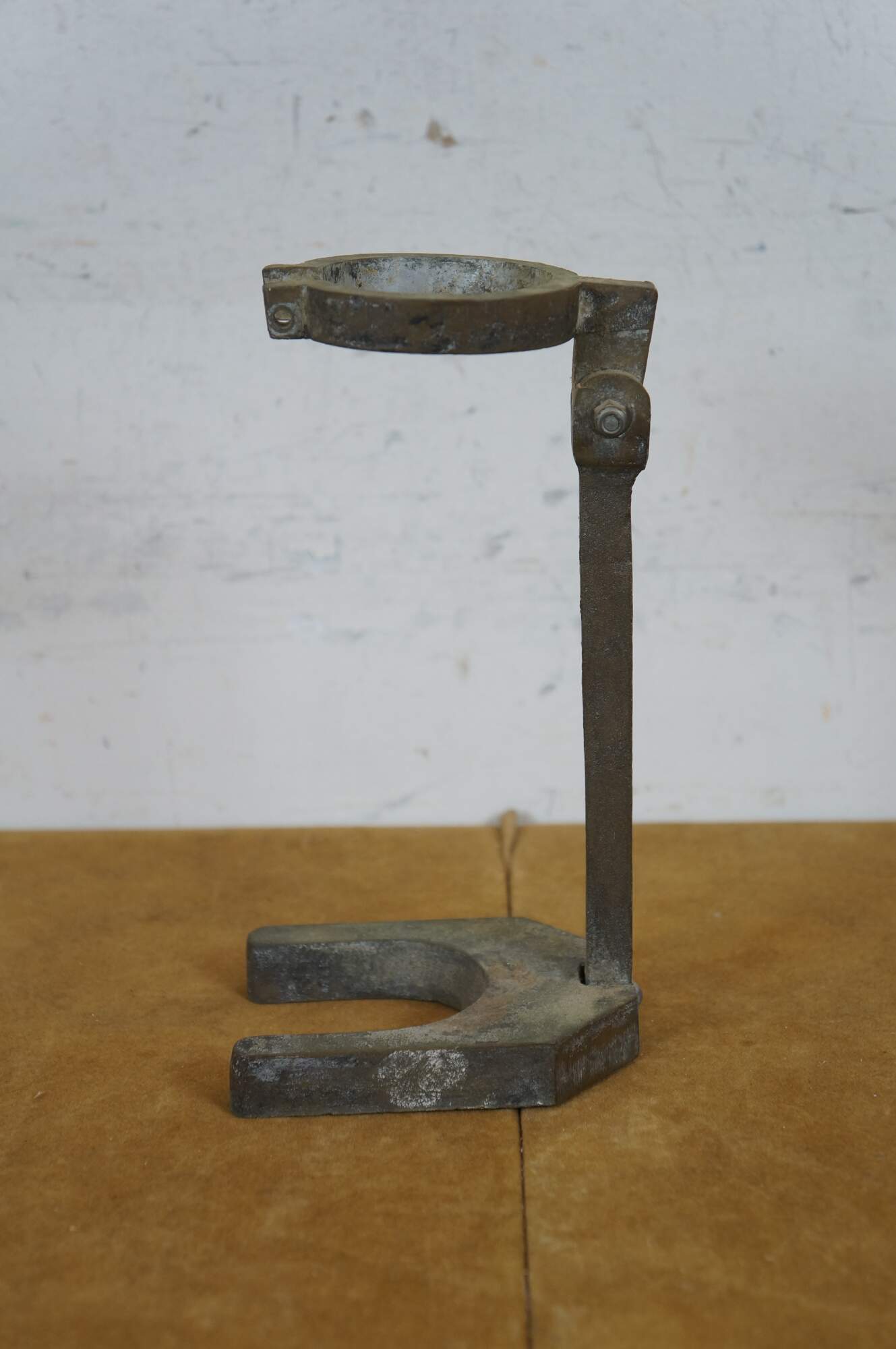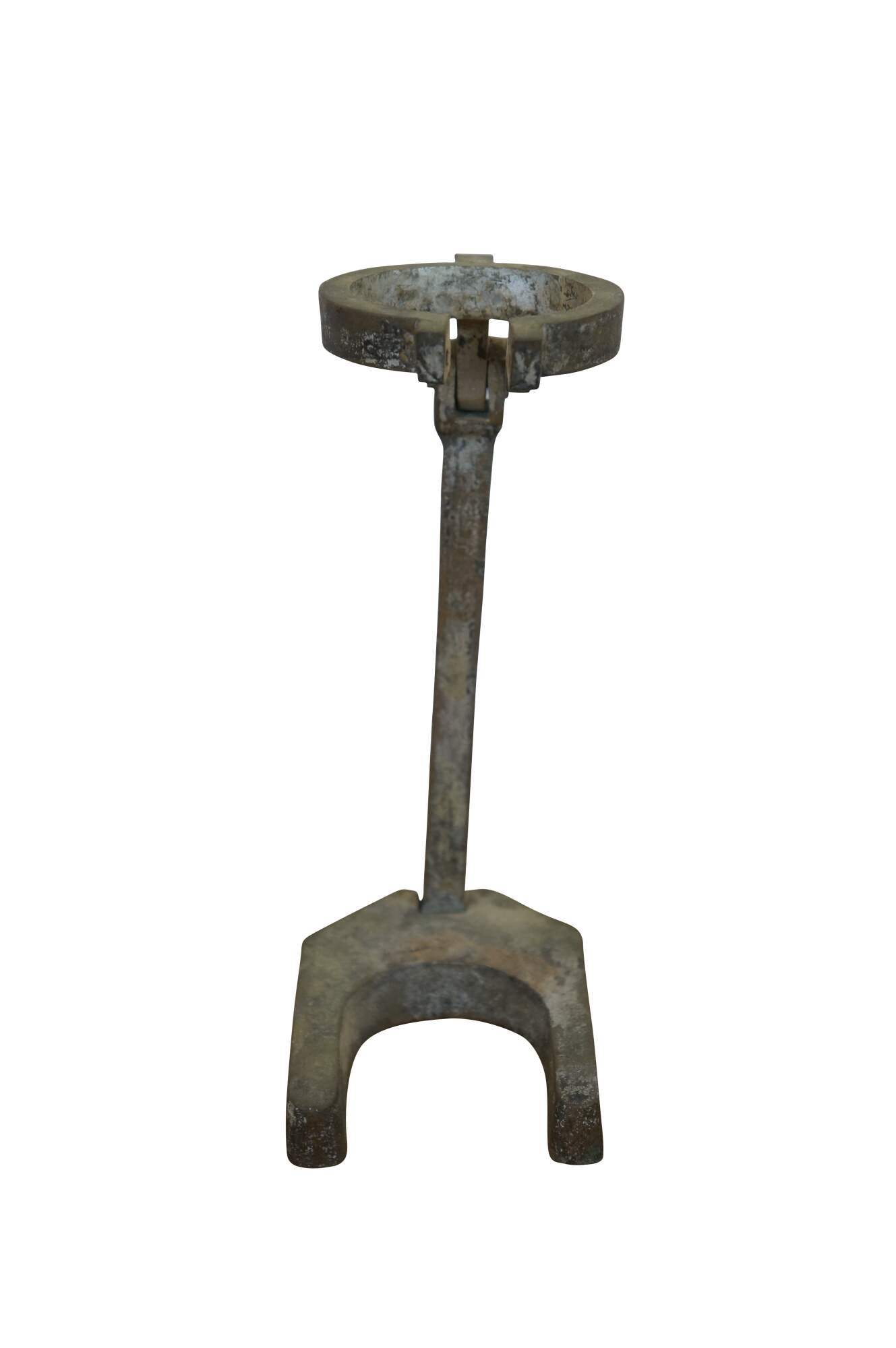 Vintage 20th century metal stand for an unknown scientific apparatus. Horseshoe shaped base with single supporting column topped with a rotating ring clamp.