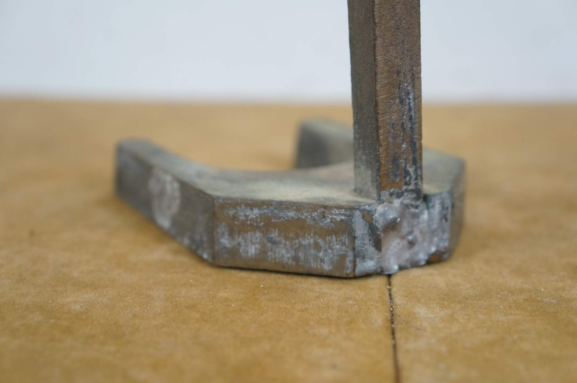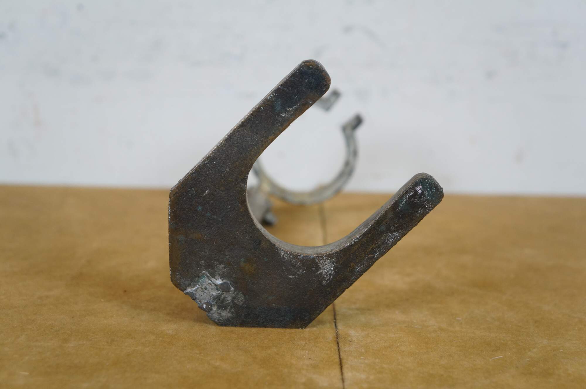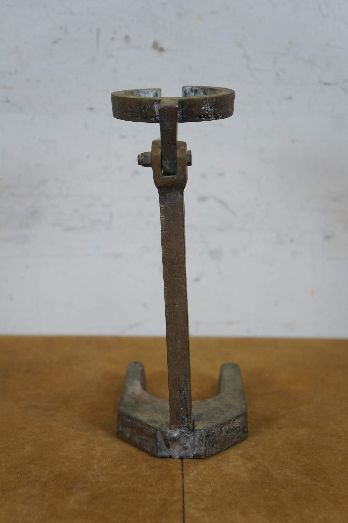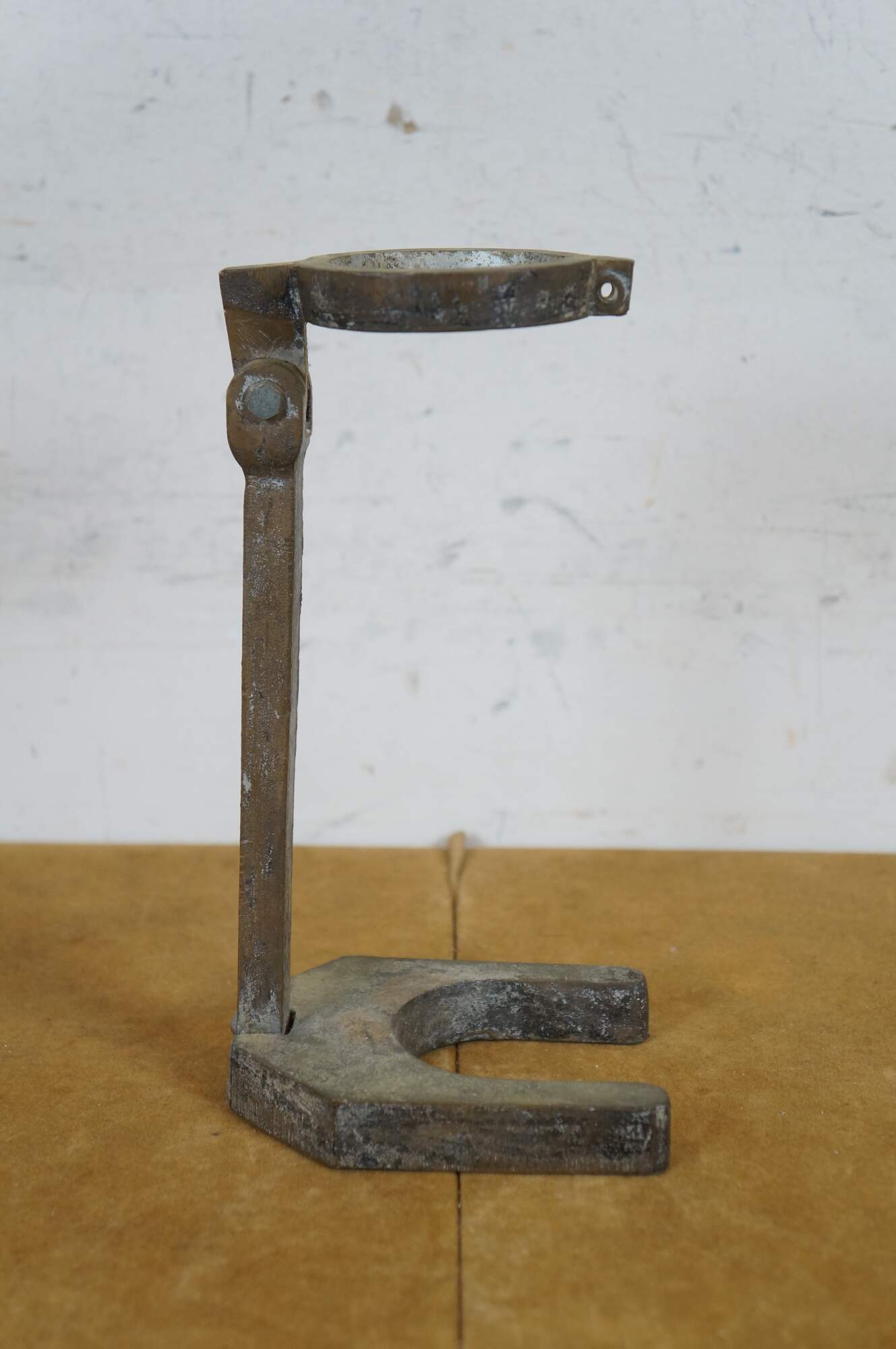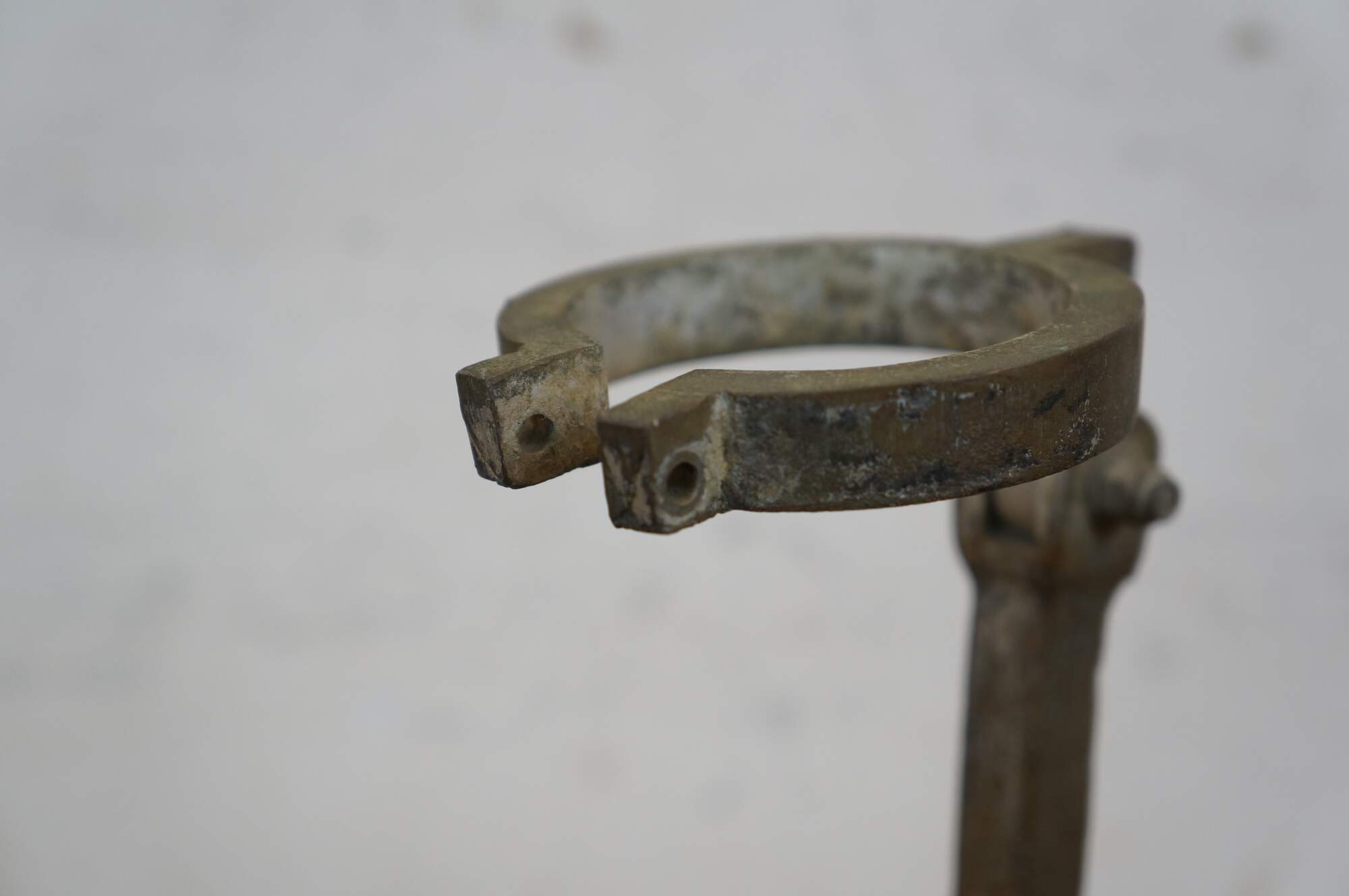 Vintage 20th century metal stand for an unknown scientific apparatus. Horseshoe shaped base with single supporting column topped with a rotating ring clamp.