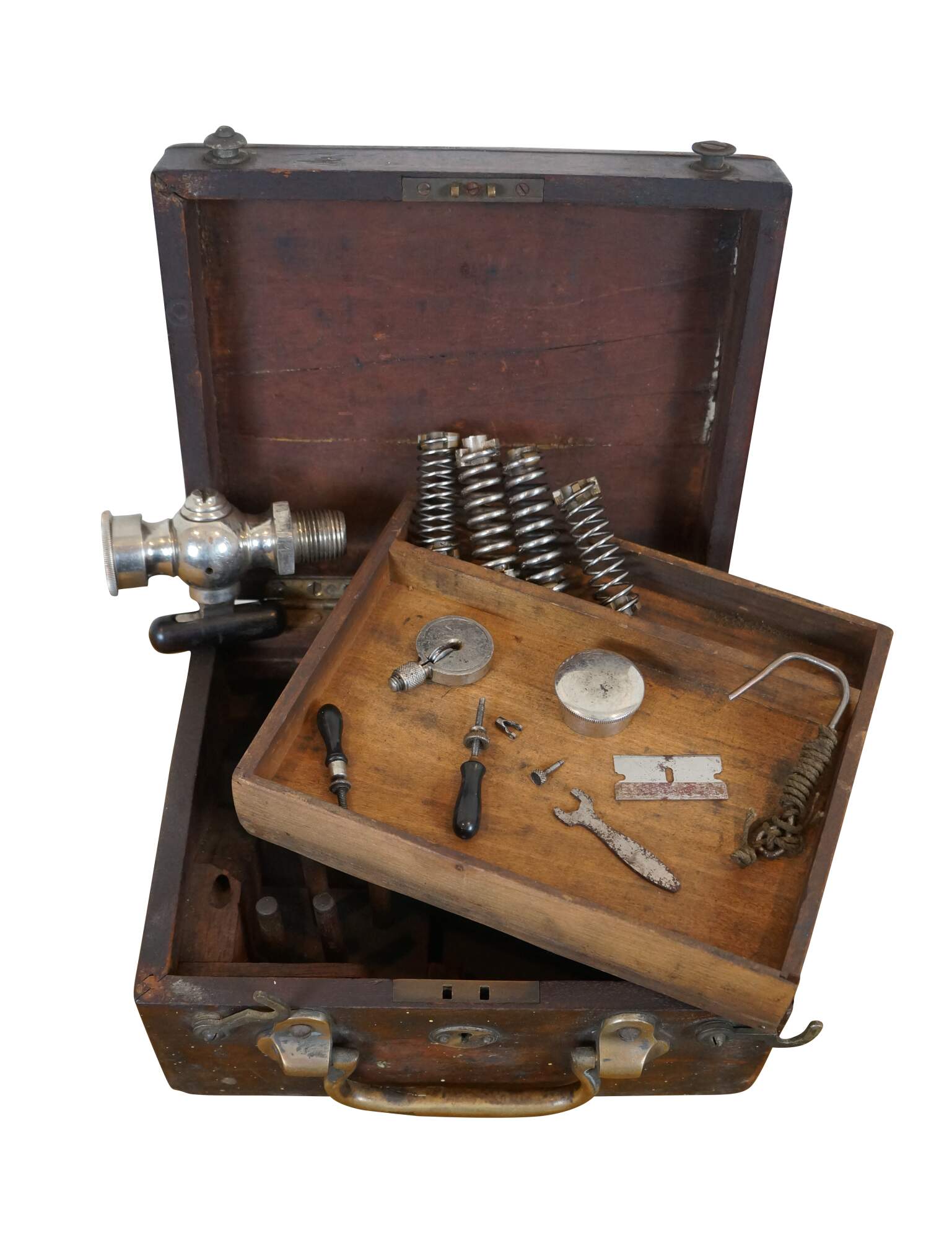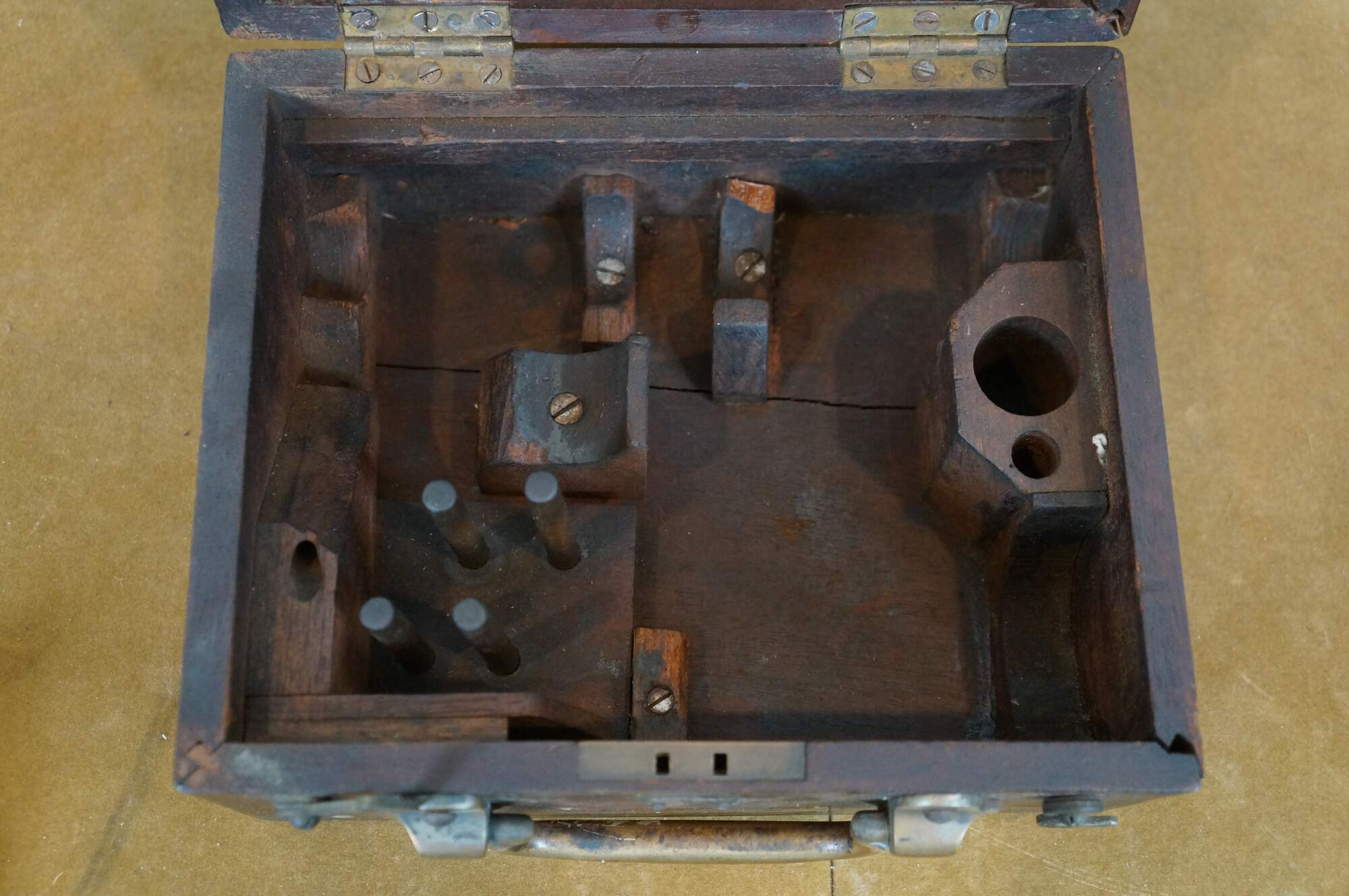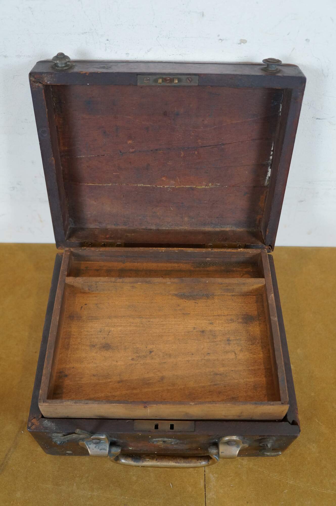 Early 20th century wood instrument / machinist tool case with heavy brass bail handle, two swing hook clasps and lock (no key). Original contents unknown; currently contains a small assortment of objects.