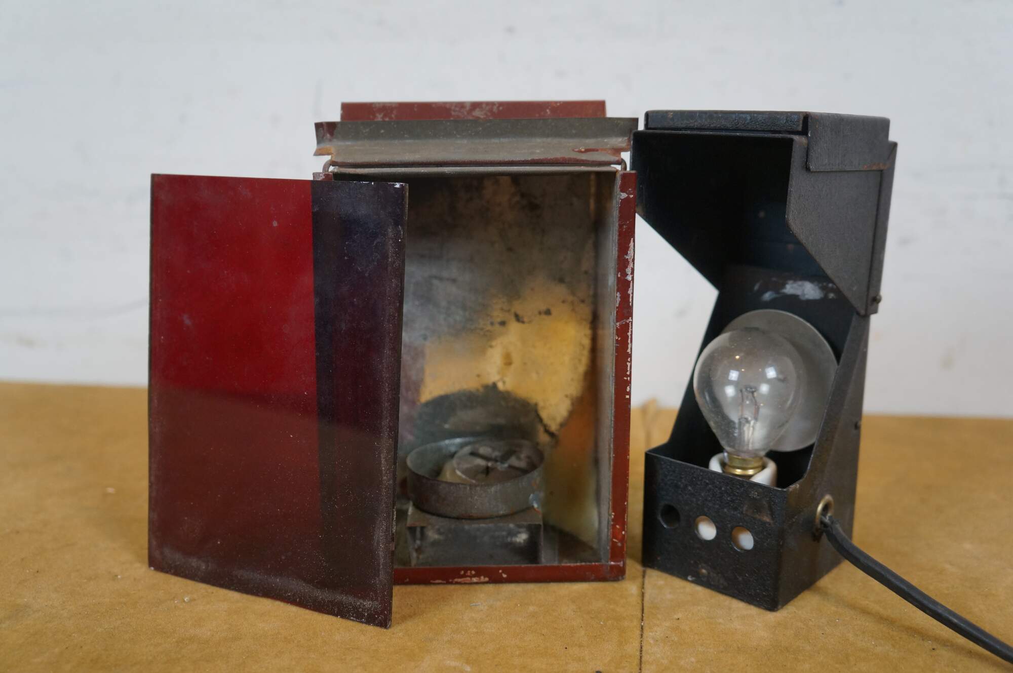 Lot of early 20th century contact print / photographic developing equipment. Lot includes: wooden carrying case (lid loose / missing latches), pair of black sleeve guards, 3 Compressed Fiber Co developing trays, 10 square cardboard backing panels for pictures, one clothespin, wood frame for contact printing, wooden block with cut out circle, empty box for Cyko Developing Paper by Anthony & Scovill Co plus manual and product insert (circa 1902-1907), one unused roll of Agfa Plenachrome Film (circa 1930s), small glass mixing beaker and swizzle stick, hand held candle lantern with red glass front, and one small E. Leitz Inc electric lamp (parts of cord covering crumbling - not tested).