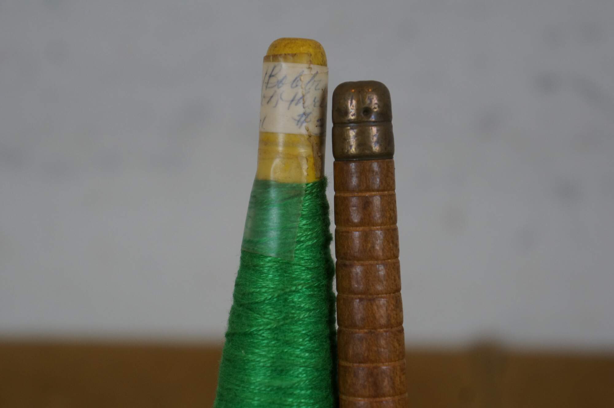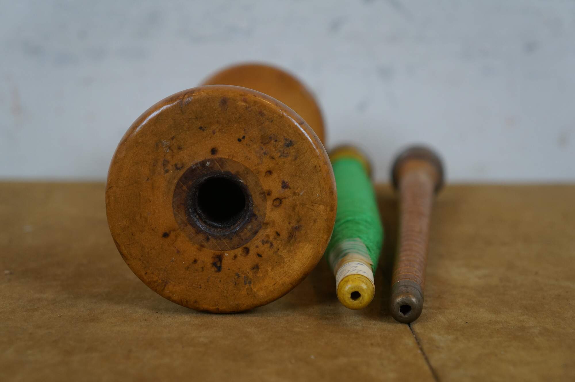 Antique indutrial textile manufacturing spool and p[air of spindles, one wrapped with green thread. Hardwood with metal pieces.