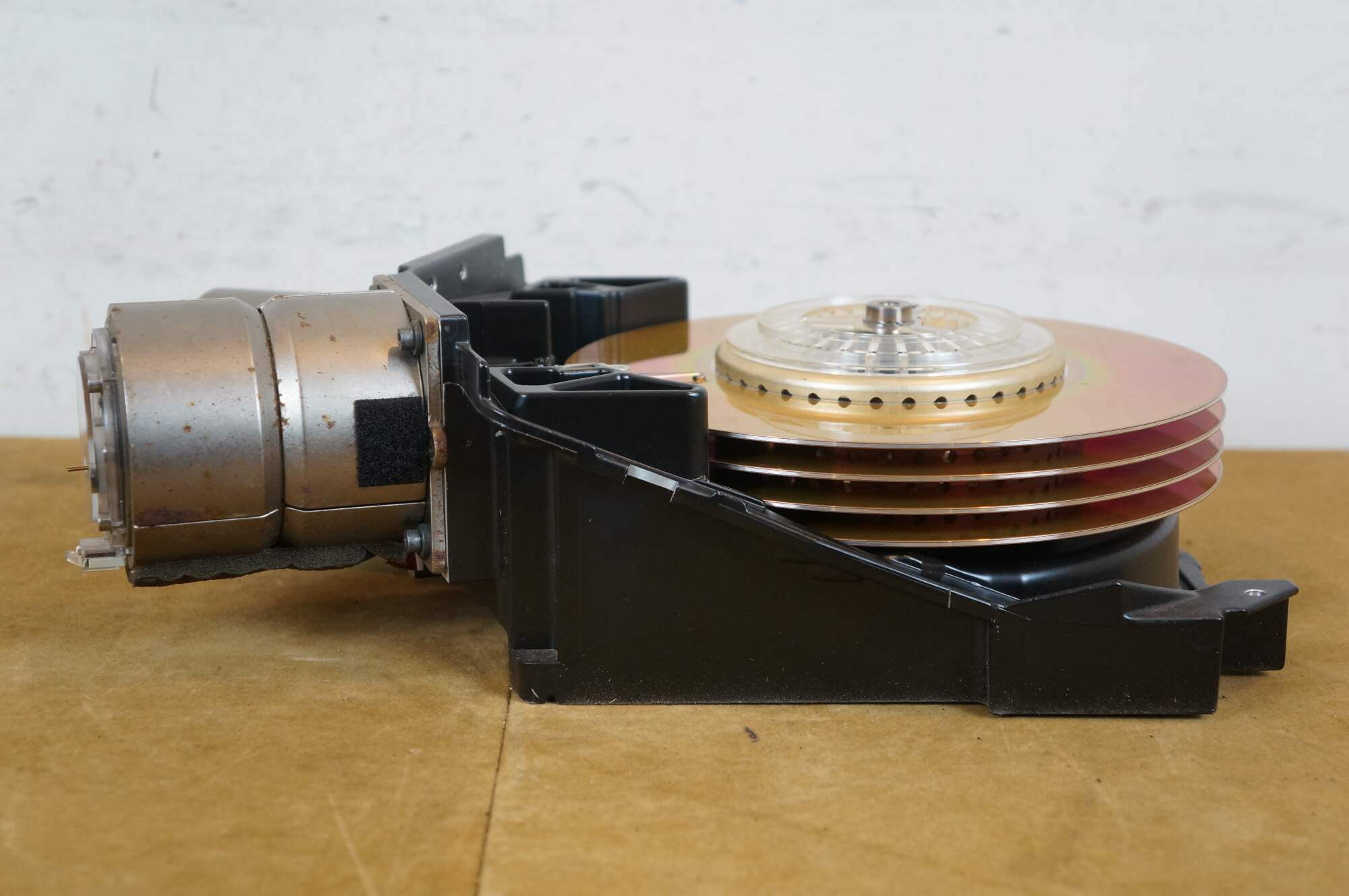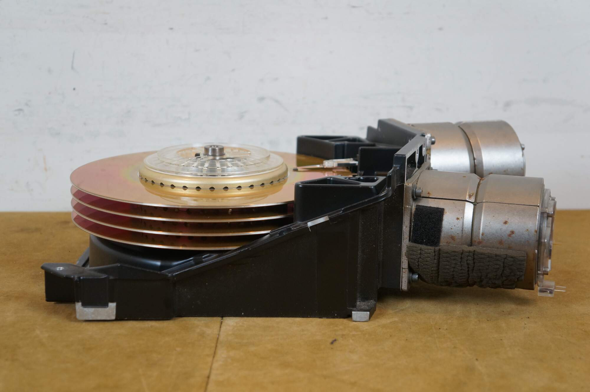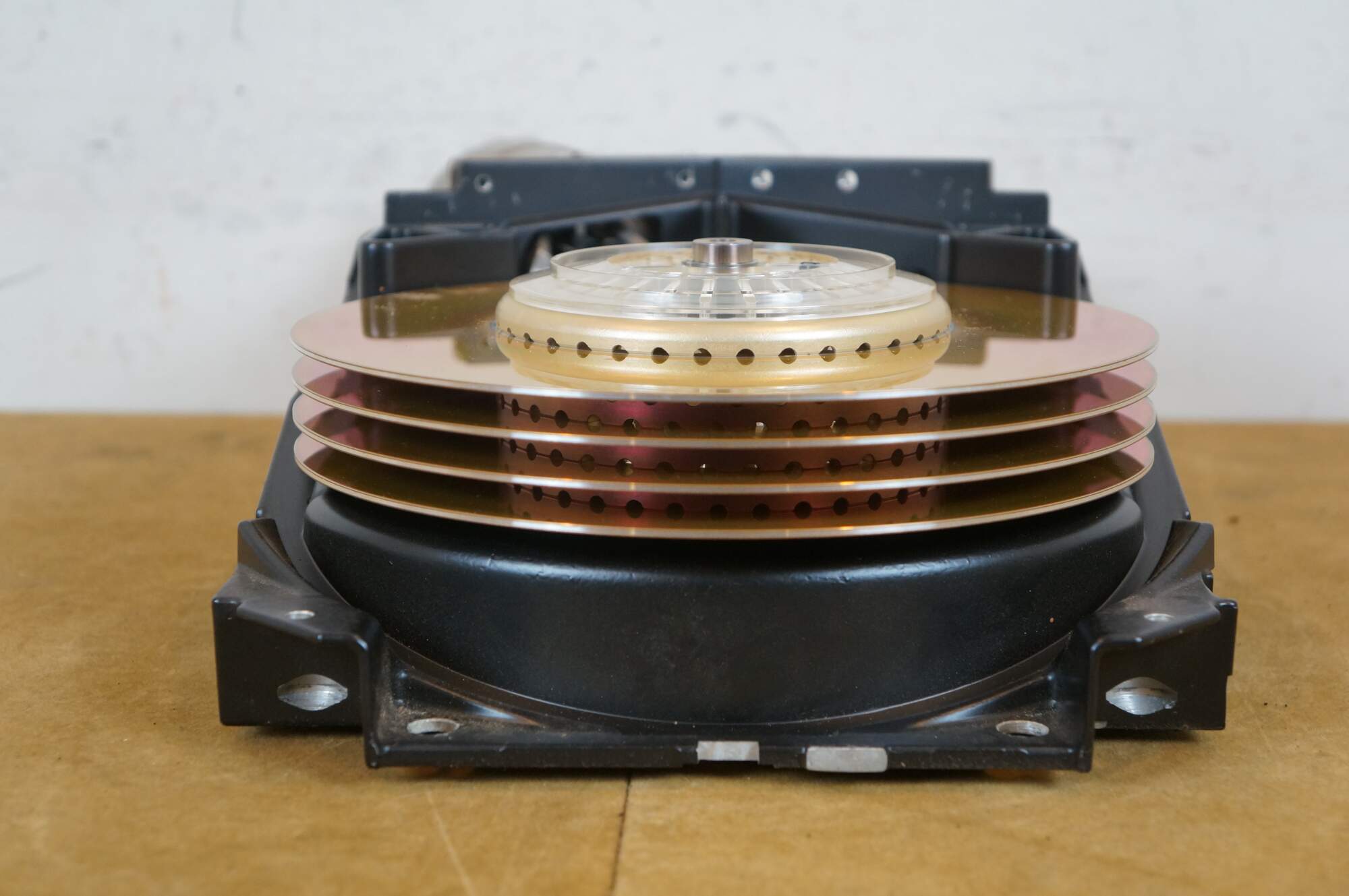 Circa 1980s-1990s hard drive / head disk assembly. Four stacked golden disks in a black plastice frame with two cylindrical metal connectors on one end. No makers marks. Un-tested.