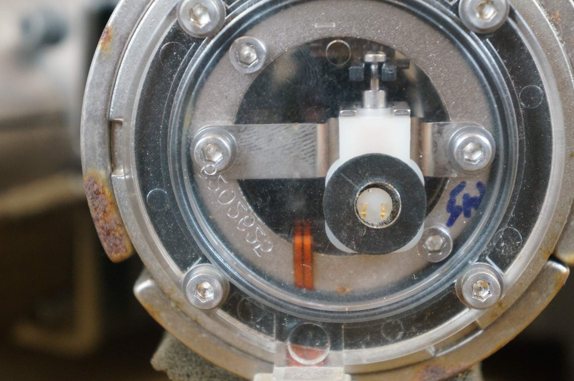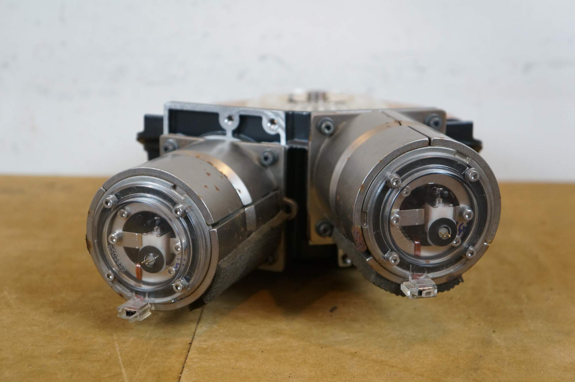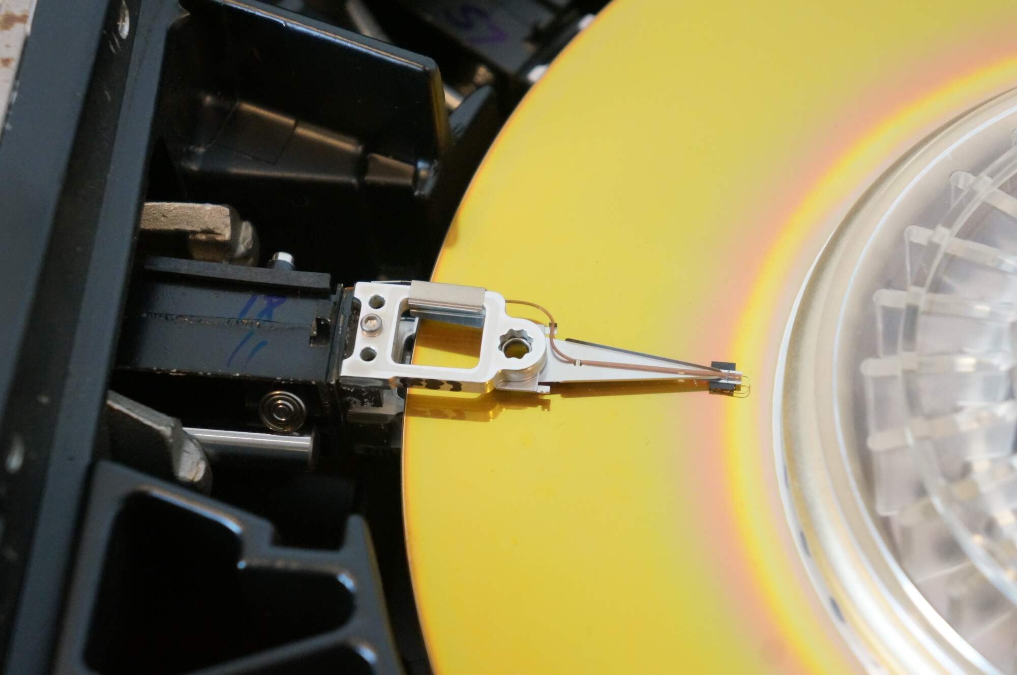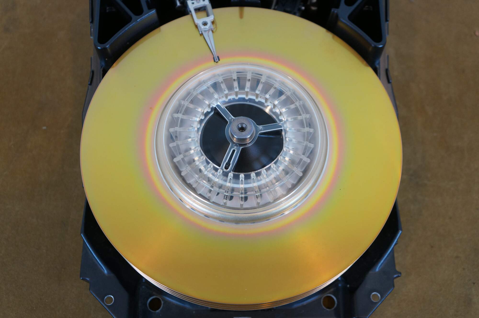 Circa 1980s-1990s hard drive / head disk assembly. Four stacked golden disks in a black plastice frame with two cylindrical metal connectors on one end. No makers marks. Un-tested.