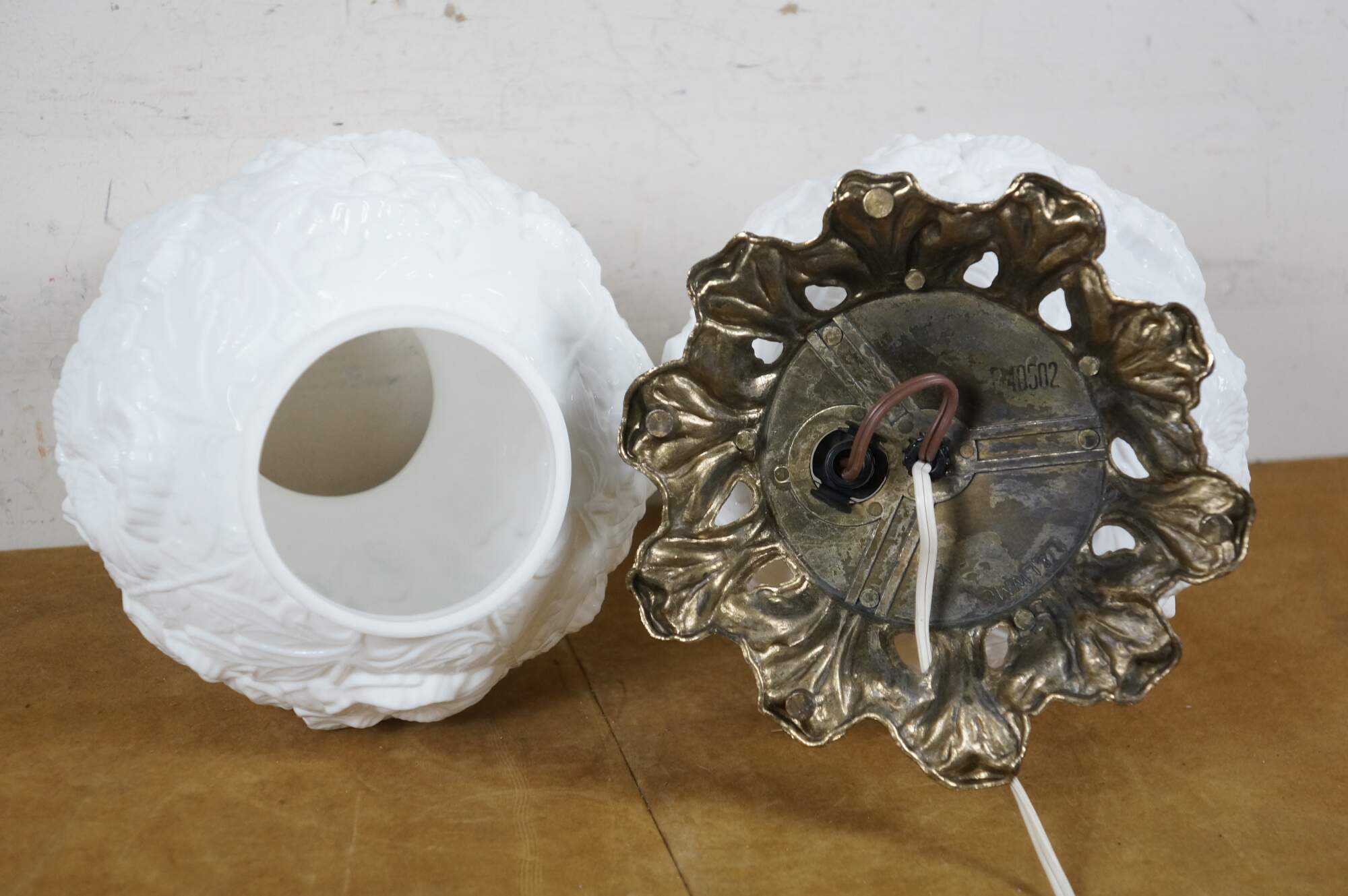Vintage Fenton art glass Gone with the Wind style table lamp. Imitating the look of a converted oil lamp, with two milk glass globes molded with poppies, hurricane, and a bronze colored white metal base by Loevsky & Loevsky White Metal Castings (in business in Carlstadt, N.J., from about 1937 until the 1970s). Three way switch illuminates the lights in each globe independently or together. E40502.