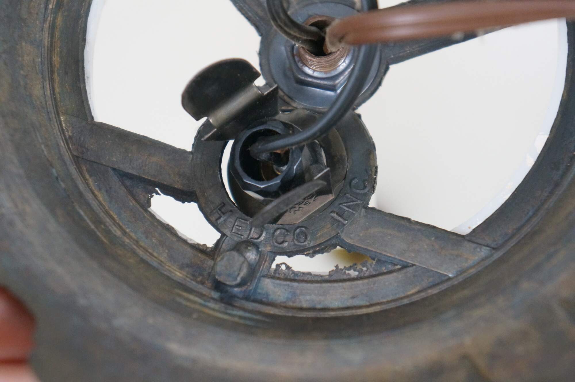 Circa mid 20th century Gone with the Wind style table lamp produced by Hedco Inc. Imitating the look of a converted oil lamp with two white glass globes hand painted with pink roses and green leaves, short hurricane, and bronze colored metal base. Three way switch illuminates the lights in each globe independently or together.