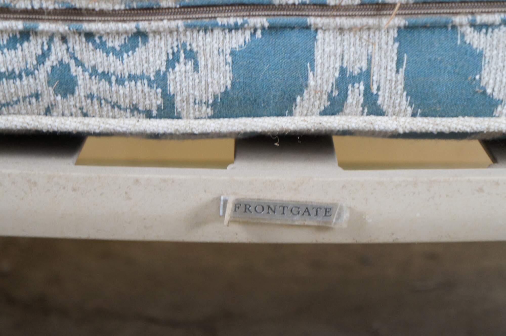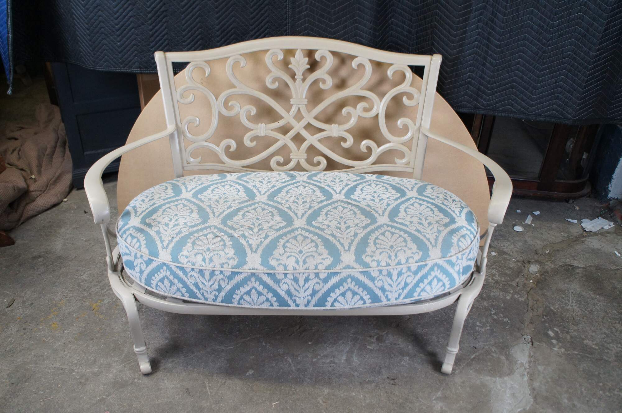 Vintage Frontgate outdoor patio chair / bench / loveseat. Made of cast aluminum featuring serpentine and scrolled form with lattice acanthus style back.