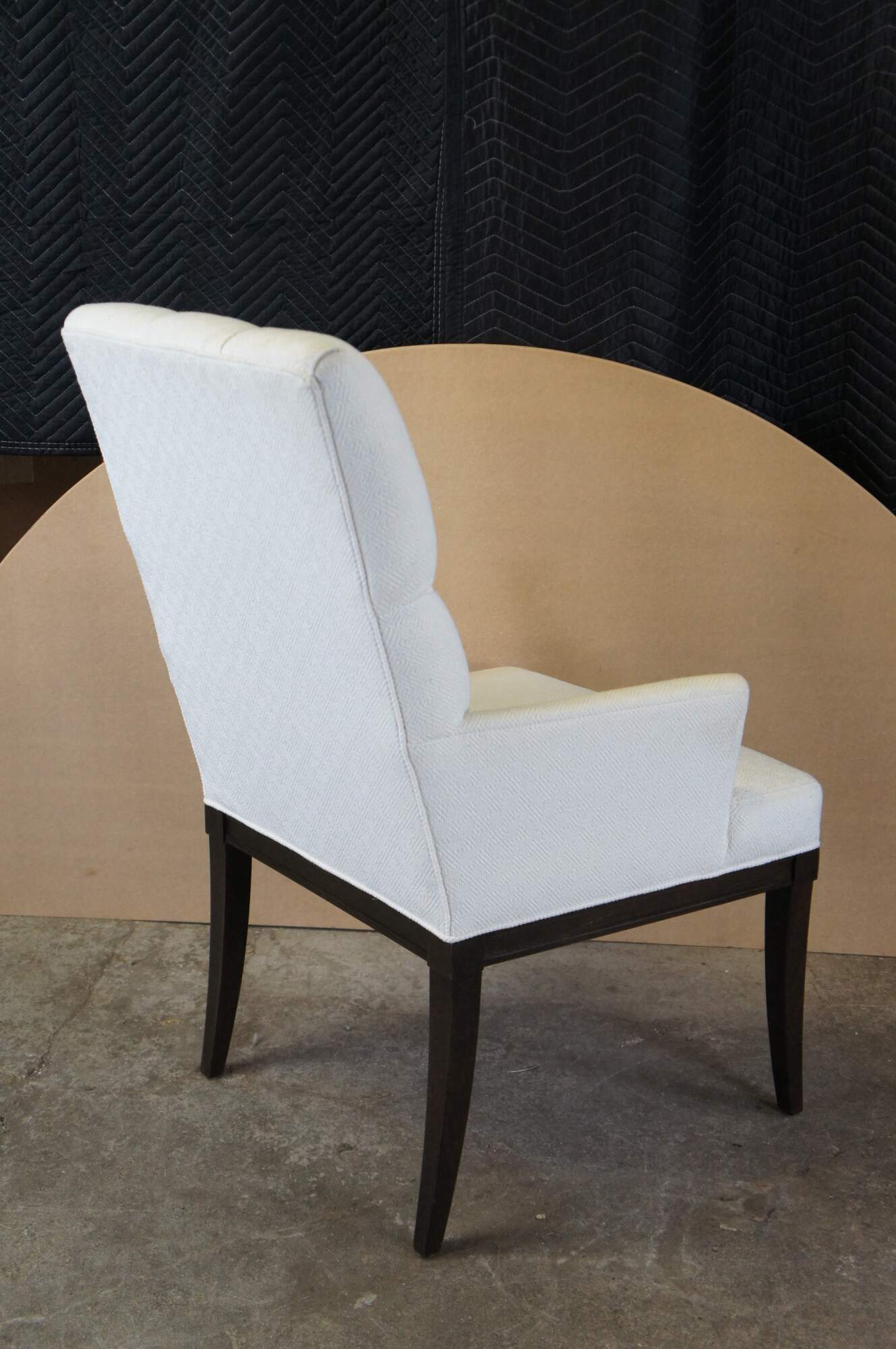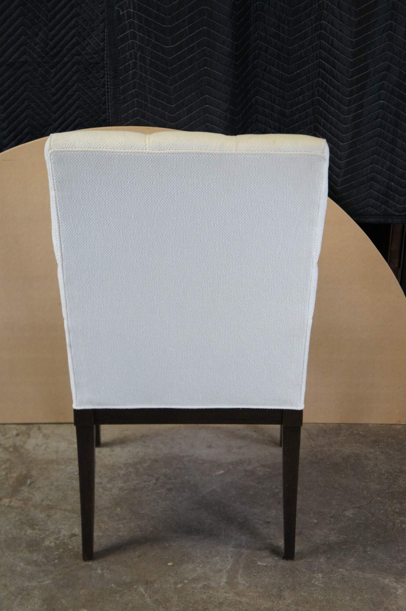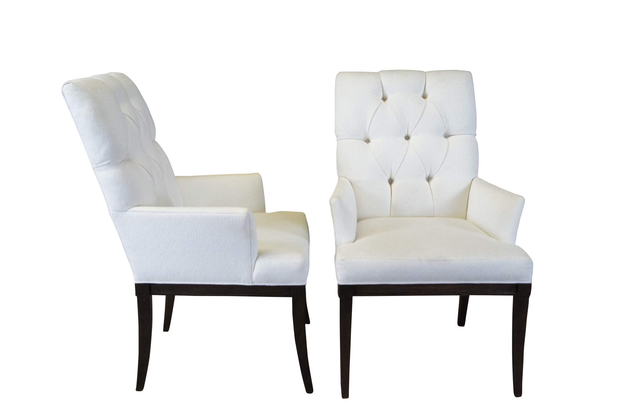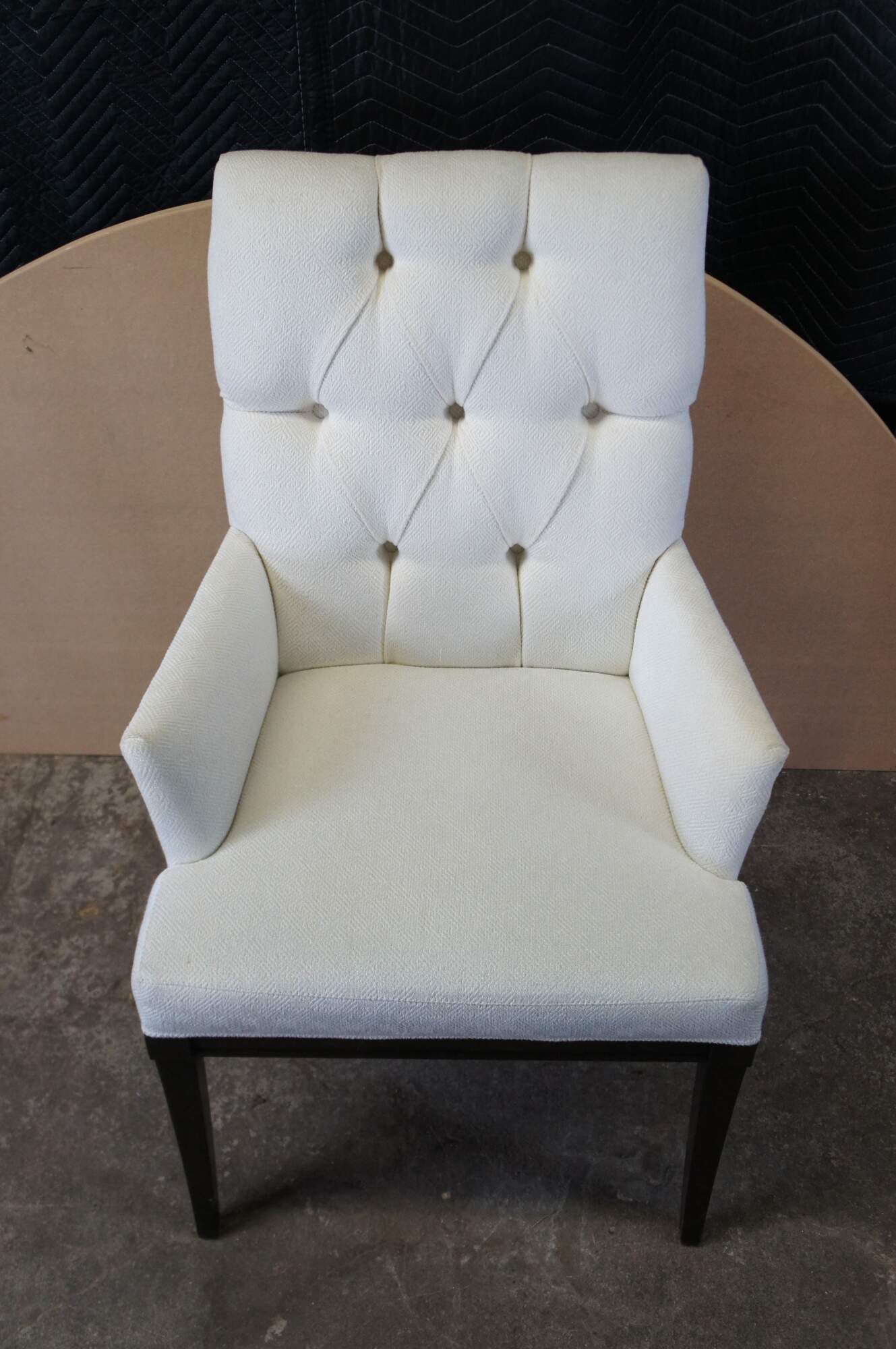 Four vintage Ethan Allen Dayton armchairs featuring English Regency styling with a tufted diamond pattern back, flared low / half arms, and slim saber legs. Upholstered in a white tone fabric and includes grey slip covers (not pictured). Circa 2016.