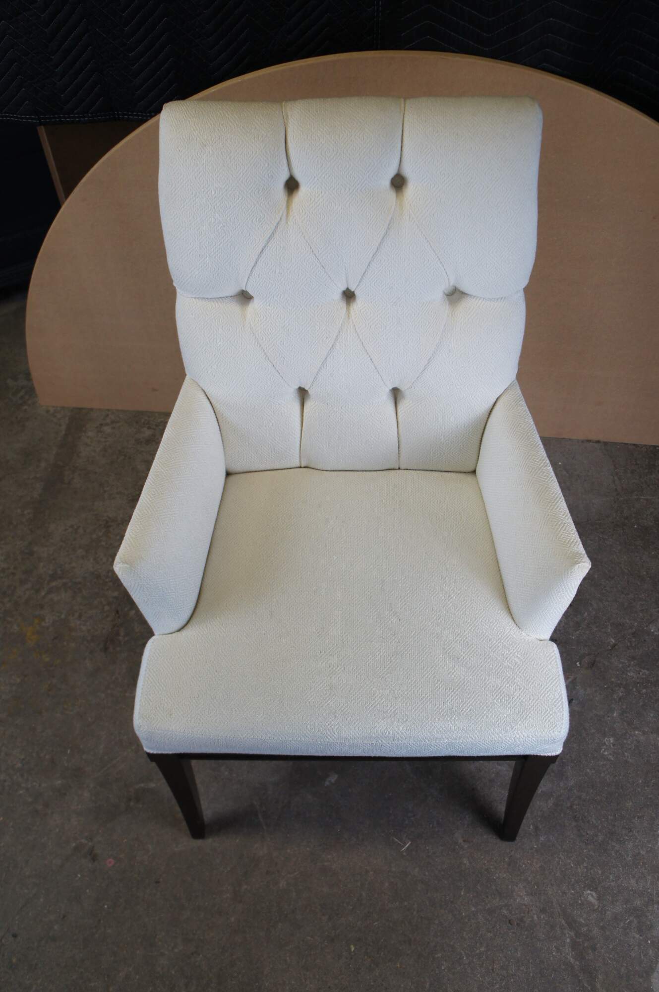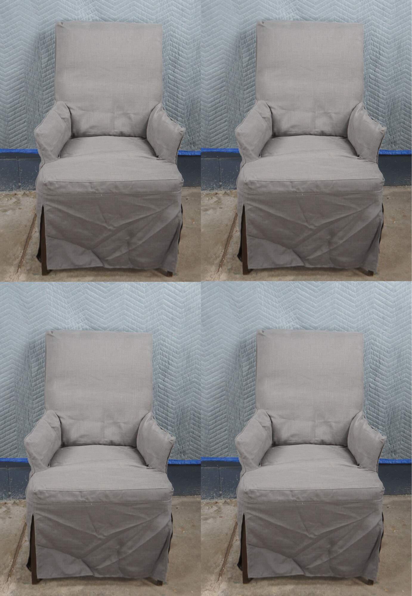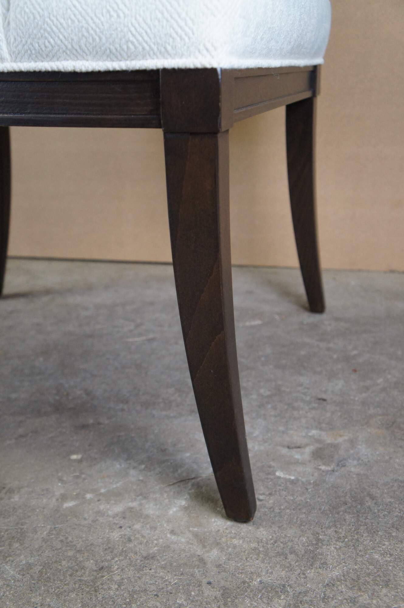 Four vintage Ethan Allen Dayton armchairs featuring English Regency styling with a tufted diamond pattern back, flared low / half arms, and slim saber legs. Upholstered in a white tone fabric and includes grey slip covers (not pictured). Circa 2016.