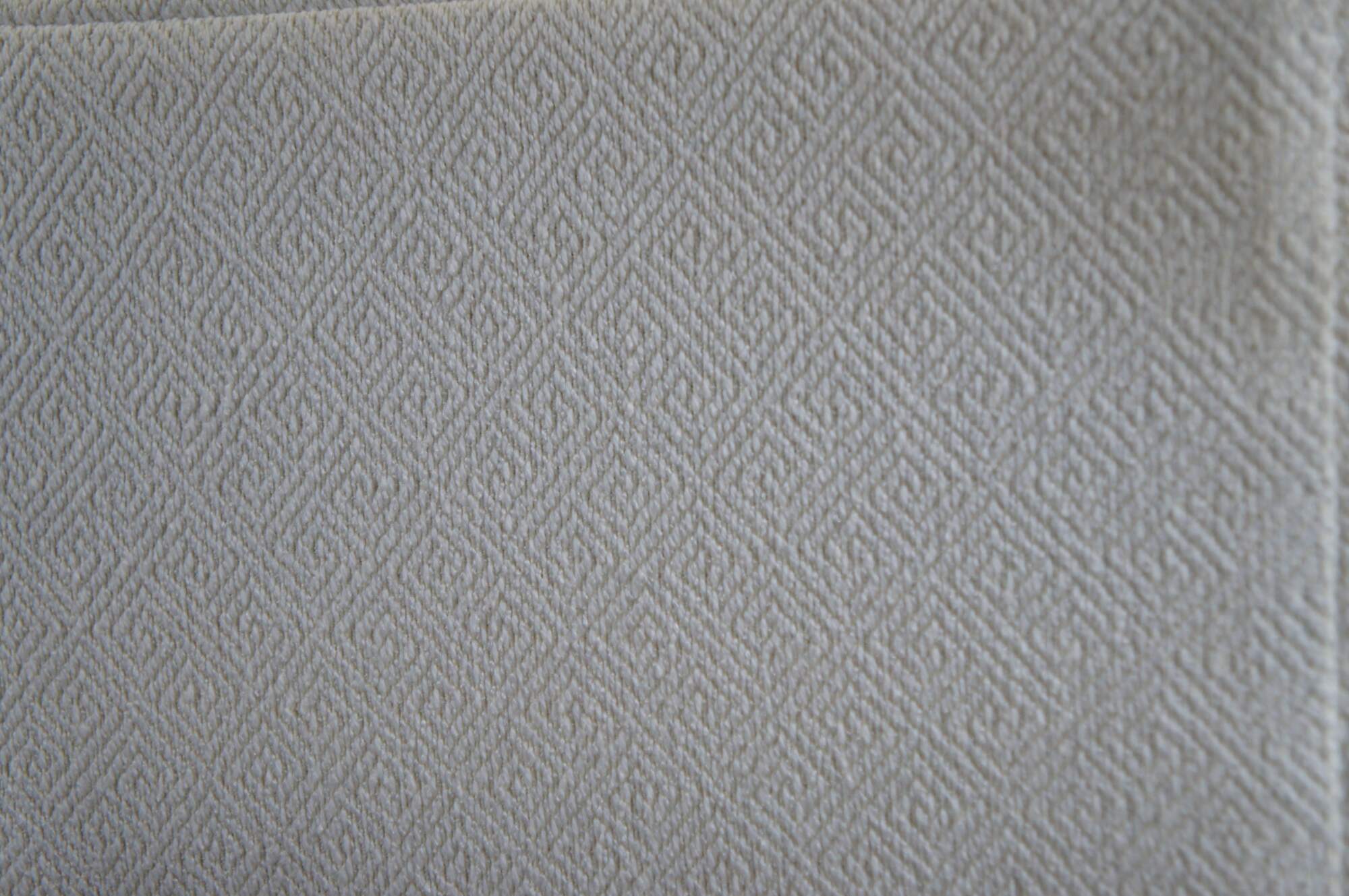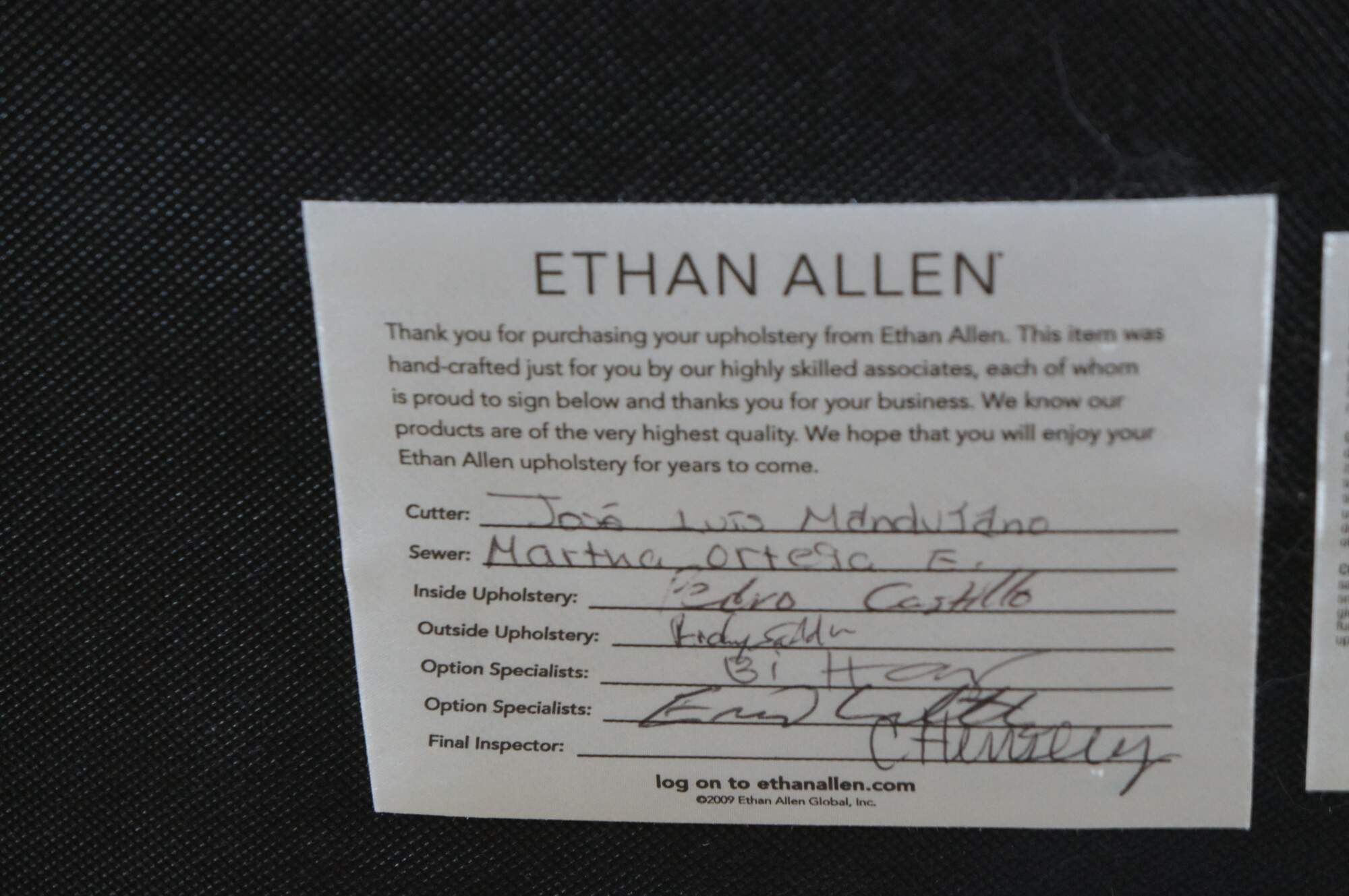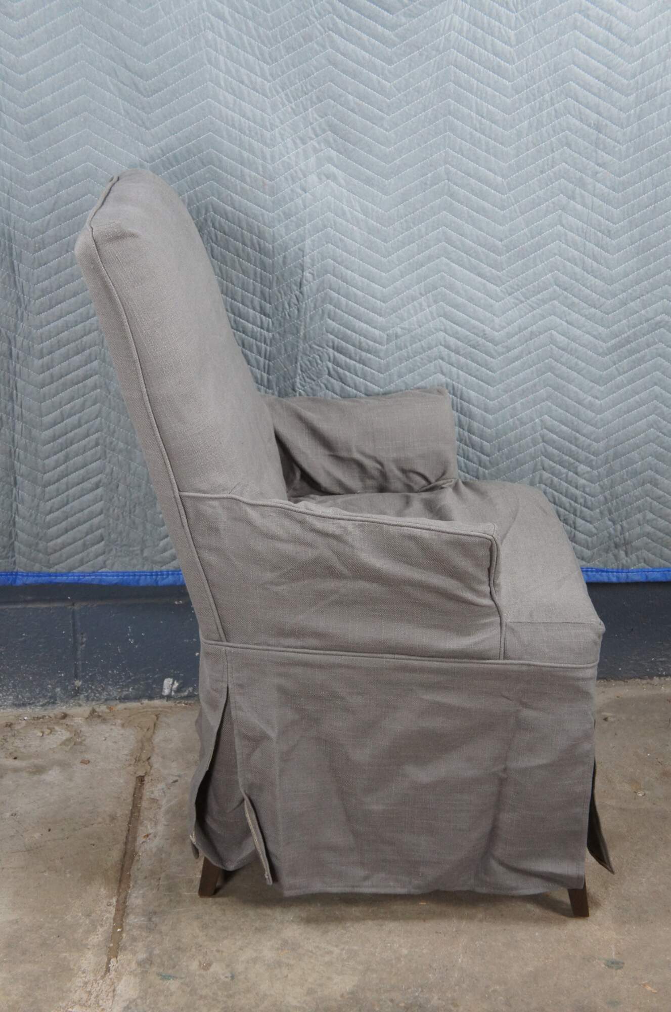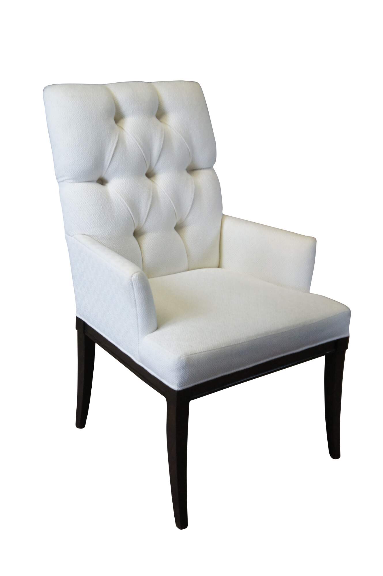 Four vintage Ethan Allen Dayton armchairs featuring English Regency styling with a tufted diamond pattern back, flared low / half arms, and slim saber legs. Upholstered in a white tone fabric and includes grey slip covers (not pictured). Circa 2016.
