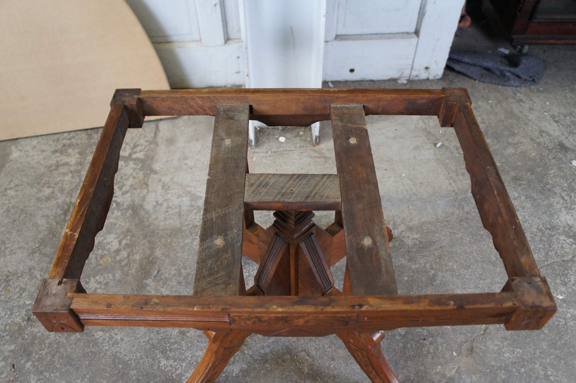 An antique Victorian Eastlake marble top coffee table. Features a rectangular form made from walnut with burled panels and carved accents. The table is supported by four flared legs.