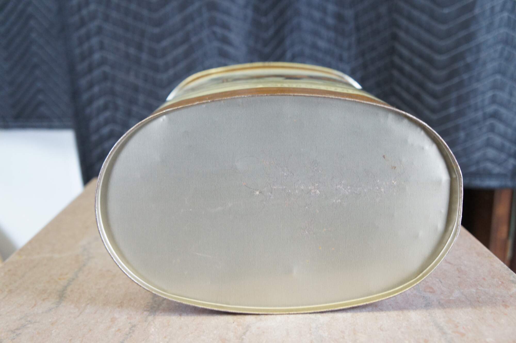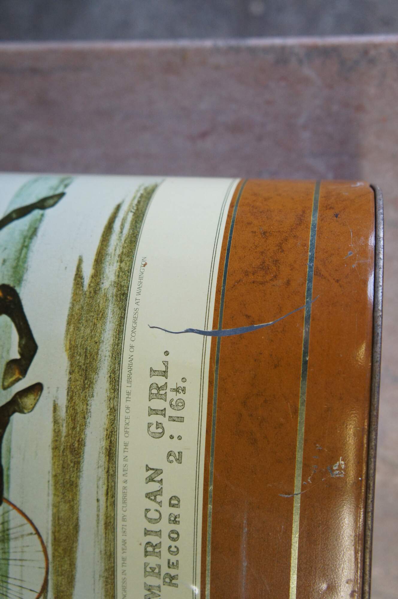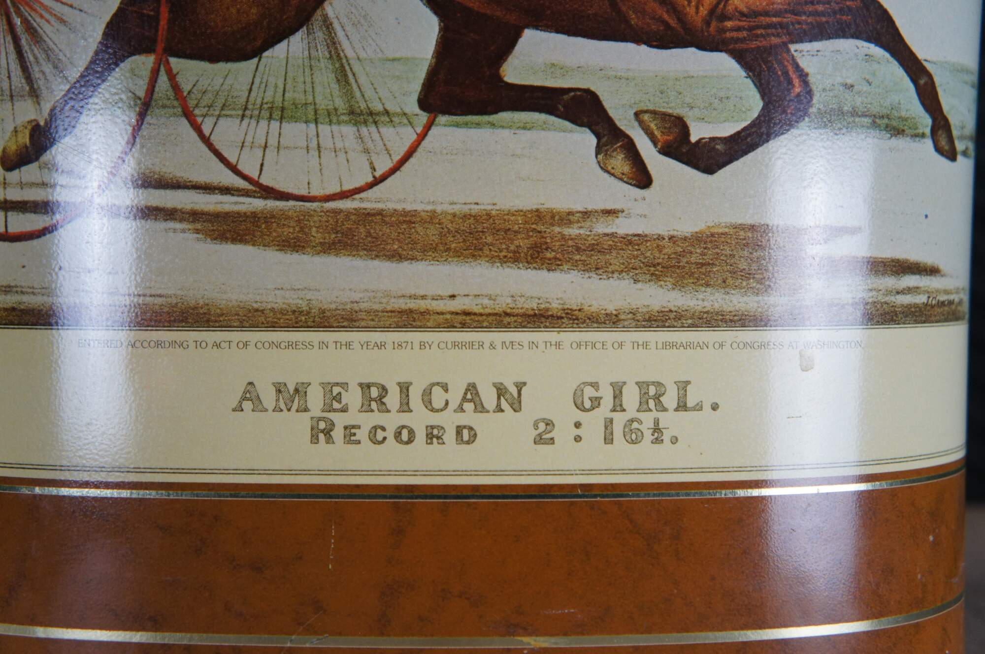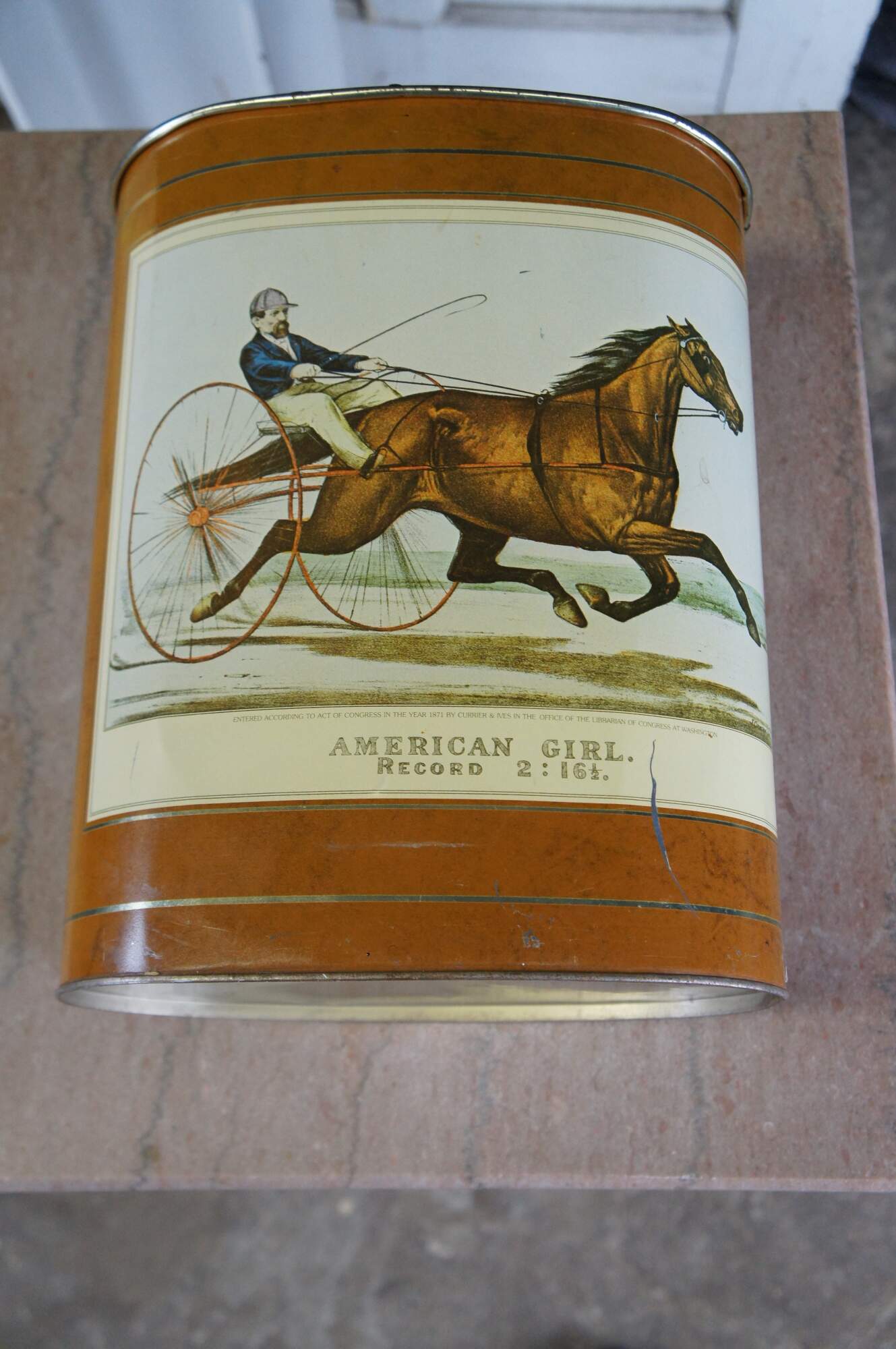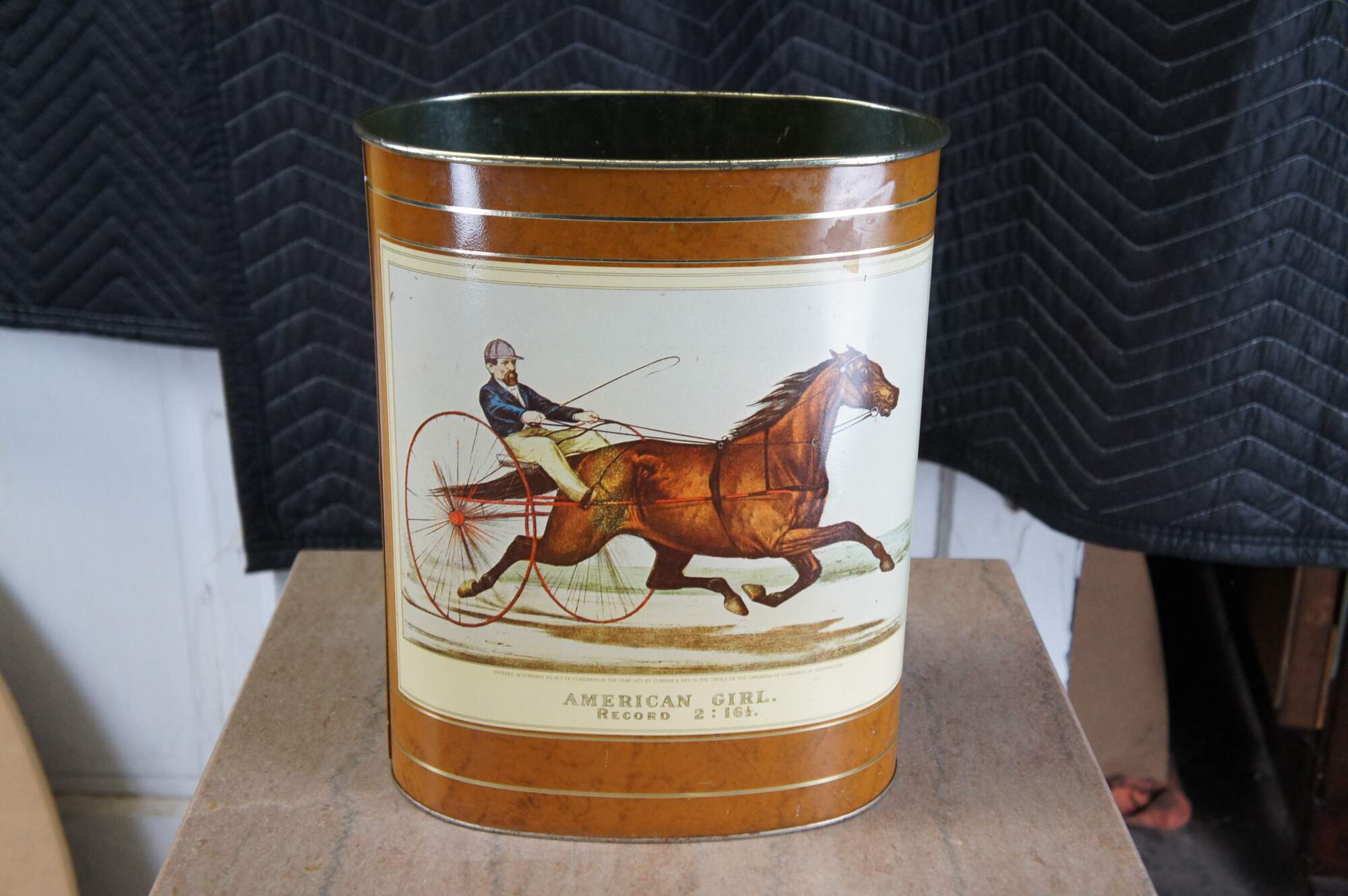 Vintage metal trash can with Currier & Ives American Girl Scene. American girl was a beloved race horse who raced between 1868-75 and won 52 race