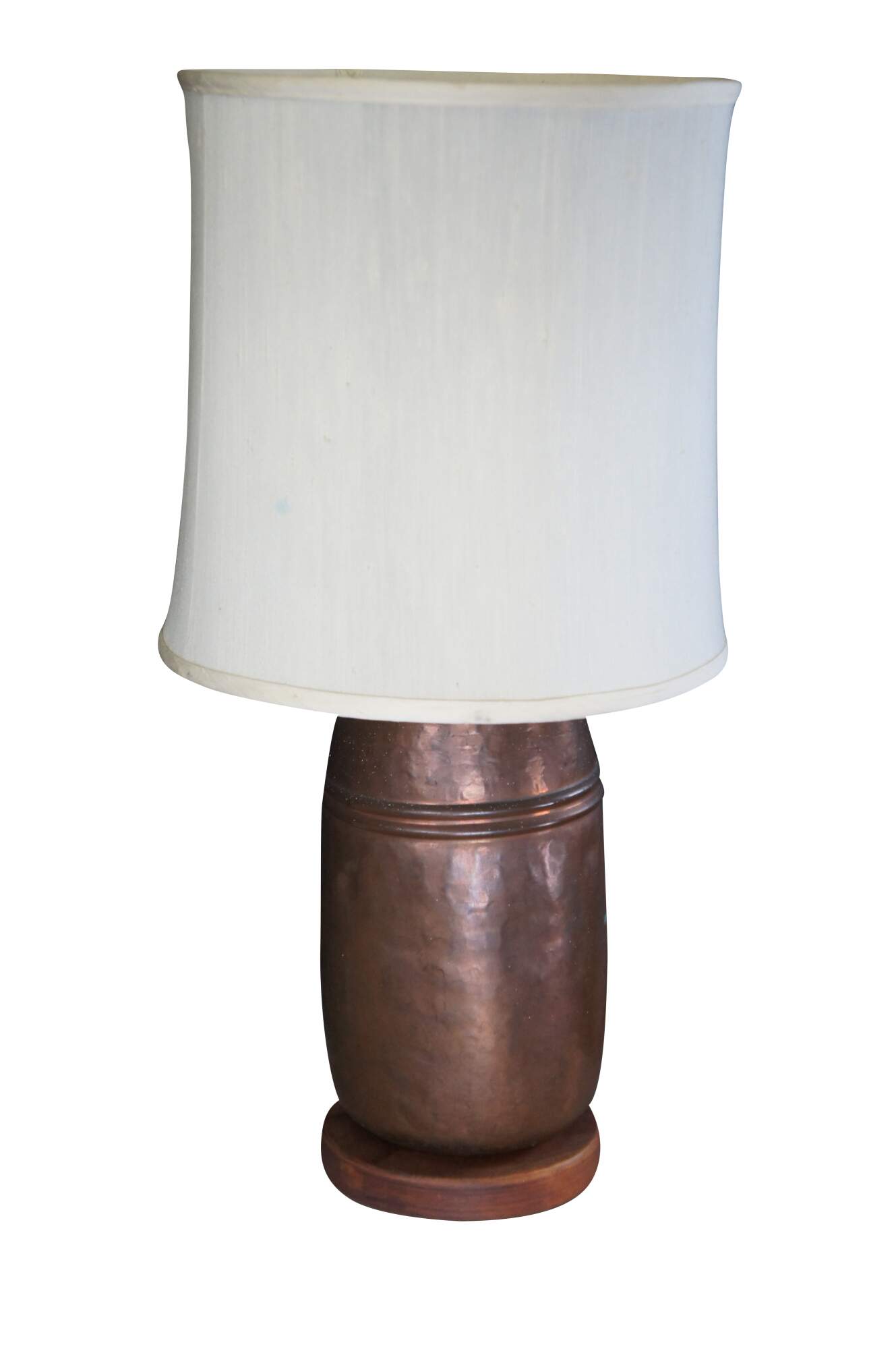 A beautiful antique hammered and dovetailed copper pot or canister table lamp. The rustic 19th century pot has a unique form and charming patina. Sits on a wooden plinth base. The pot was converted to a lamp around 1980.