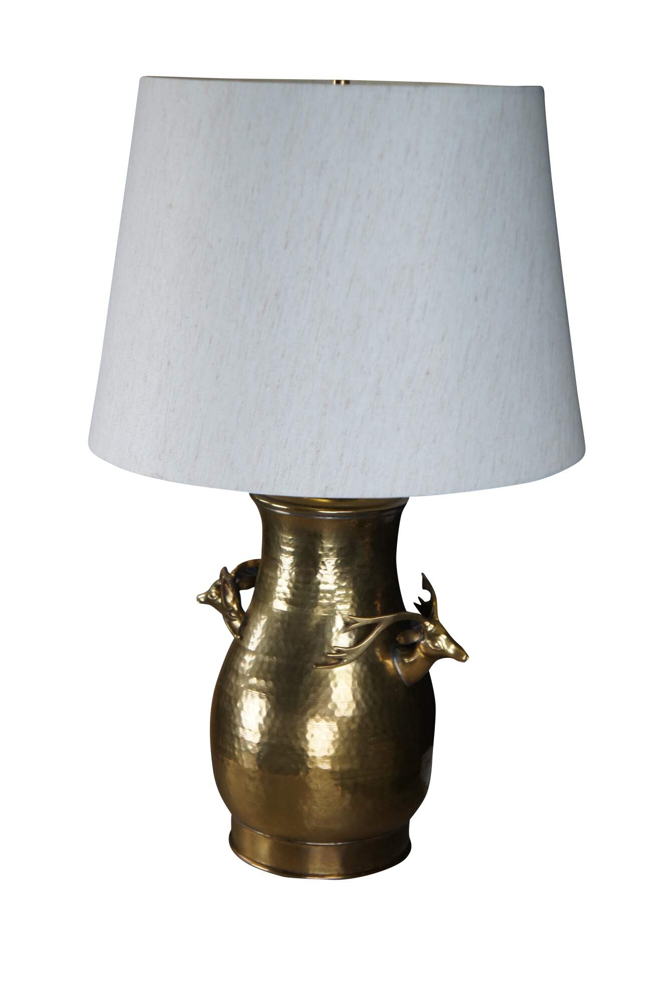 Vintage hammered brass urn or vase with stag head handles. The vase was converted to a lamp around 1980 and includes a shade.