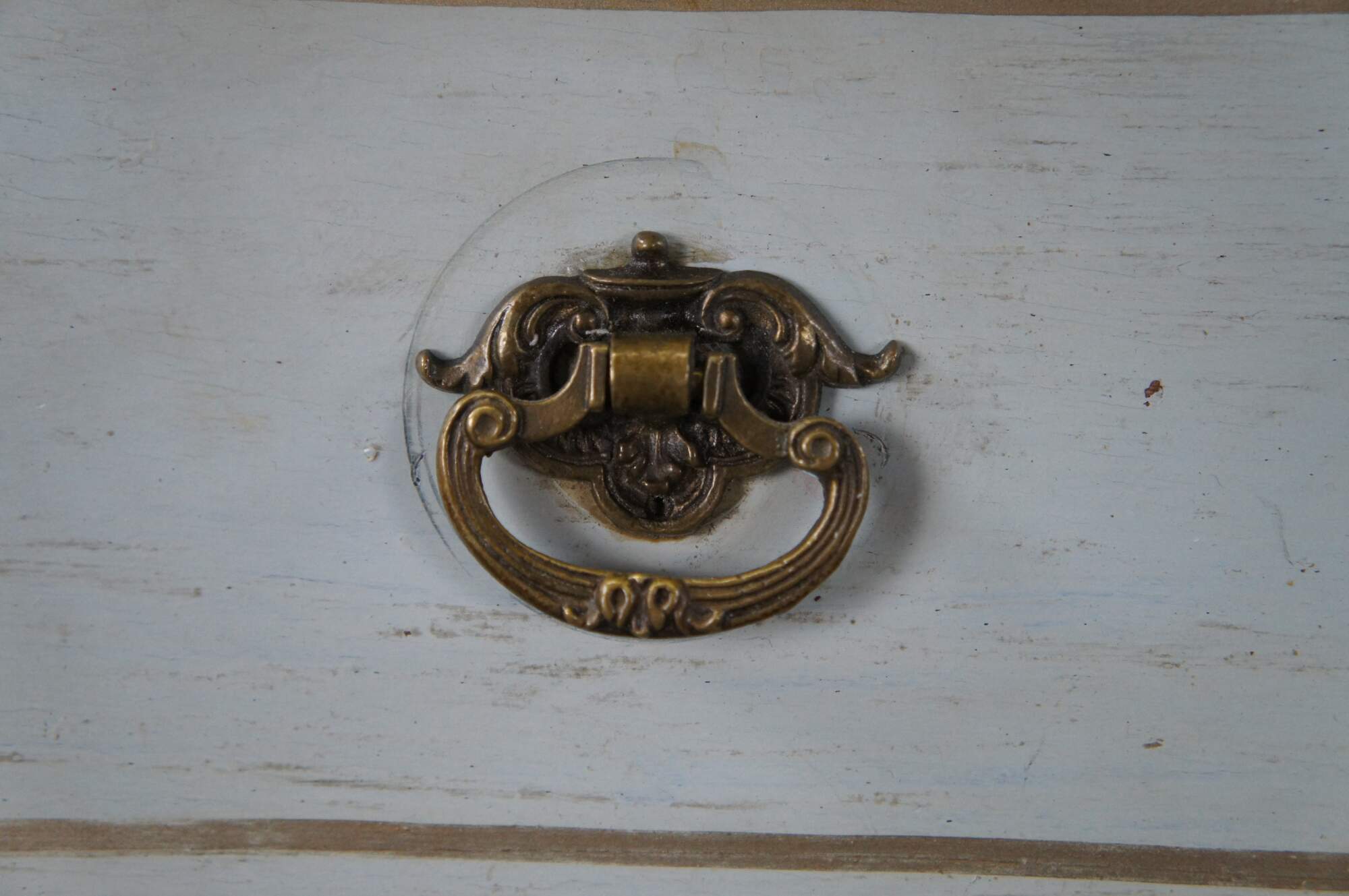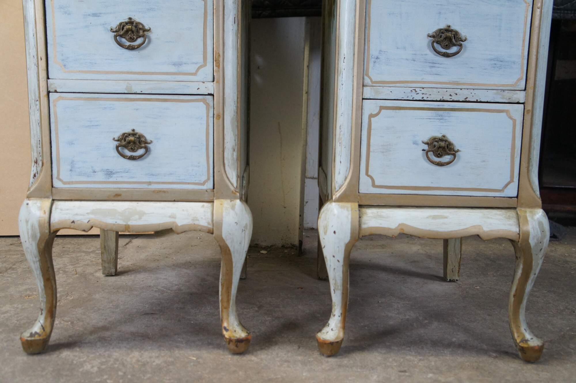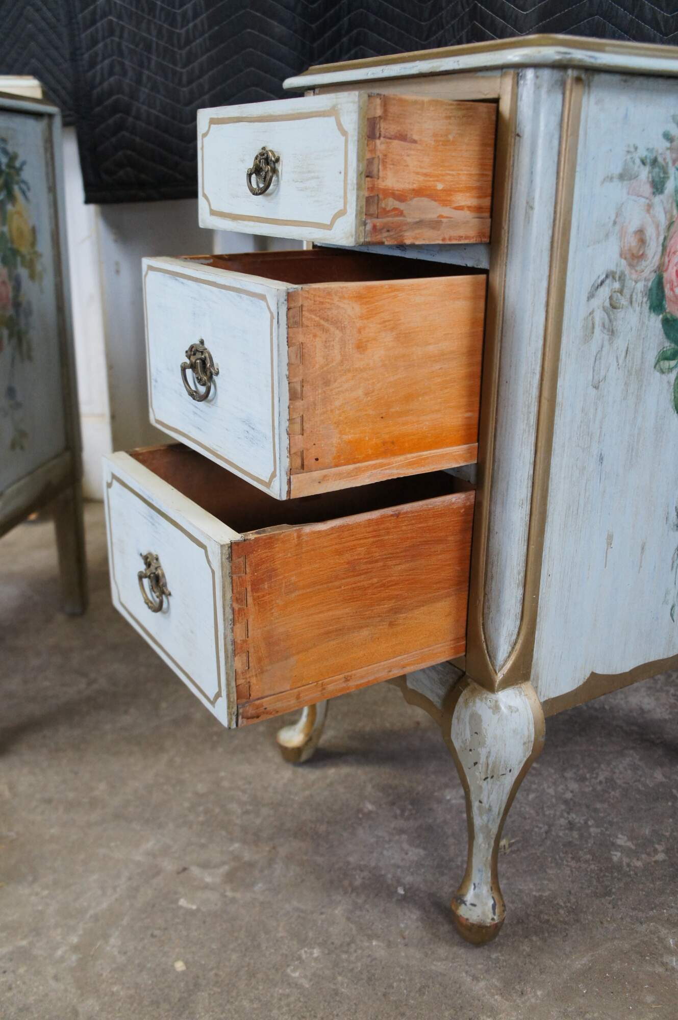 A pair of ealy 20th century end tables. Reclaimed from an old desk. Feature a hand painted blue finish, trimmed in gold with rose motif. Includes three dovetailed drawers with ornate brass hardware