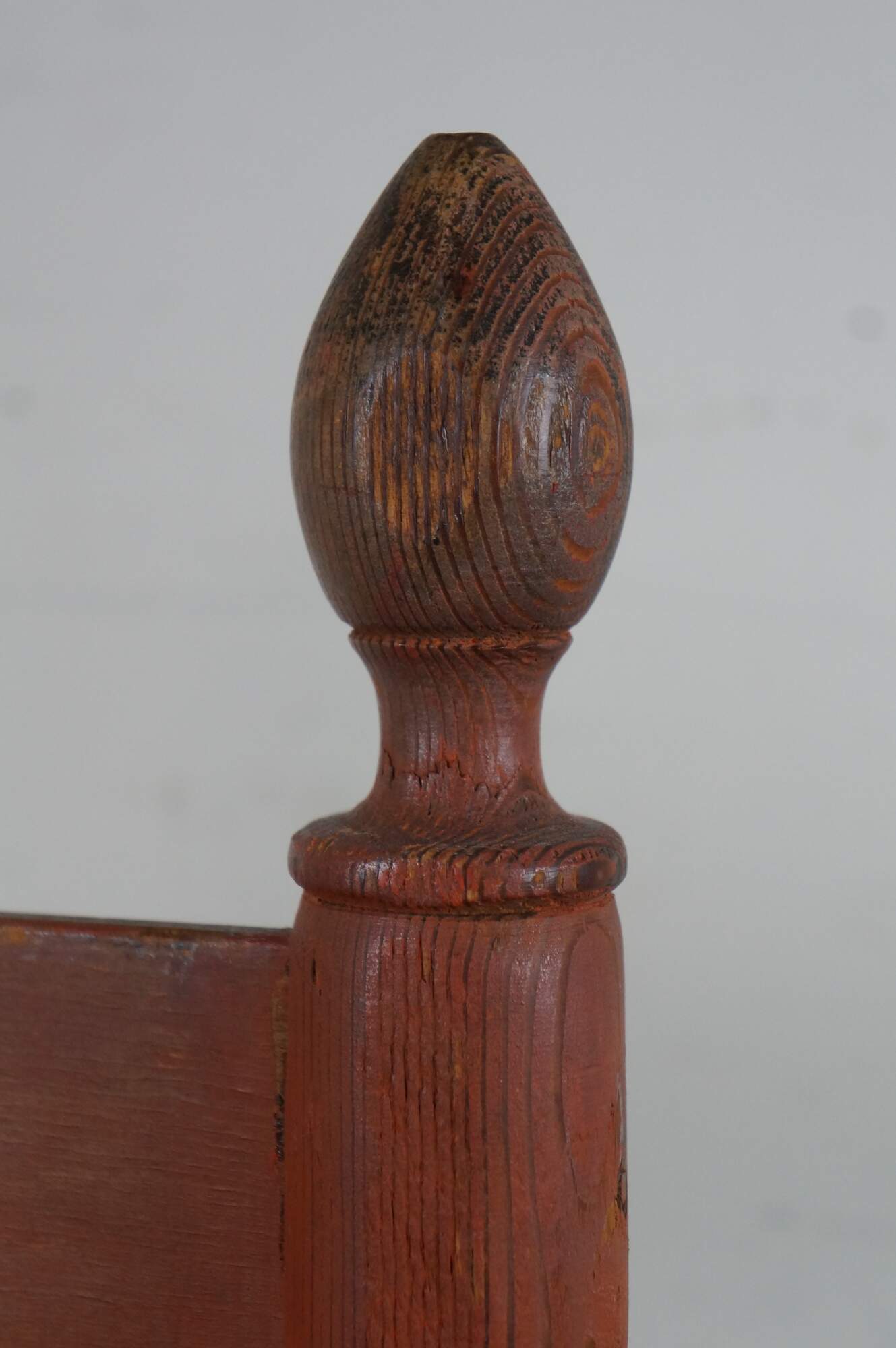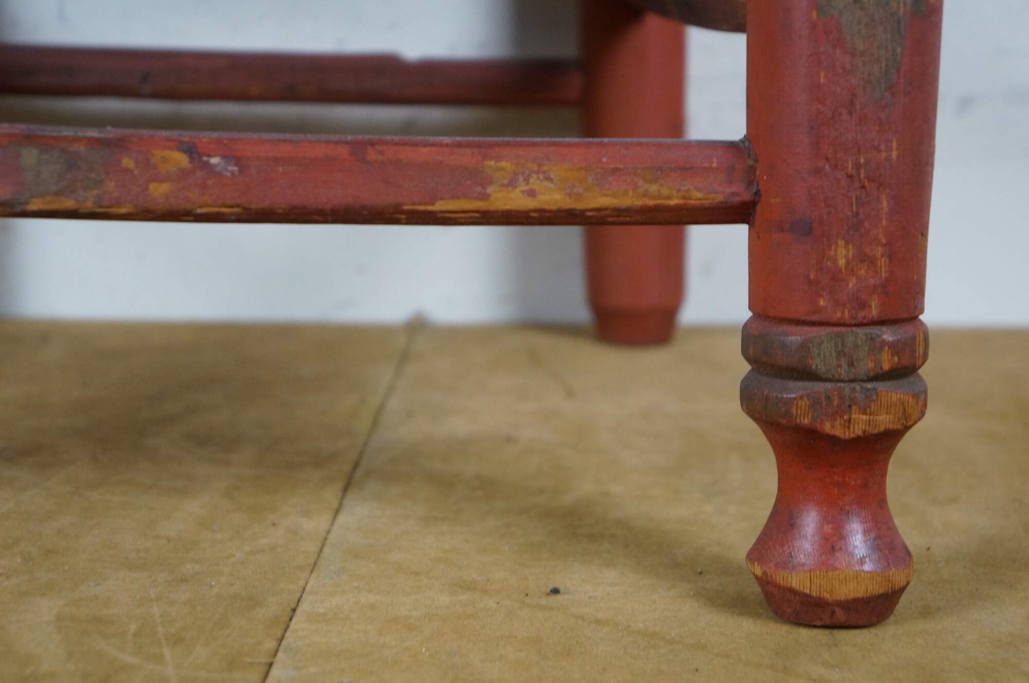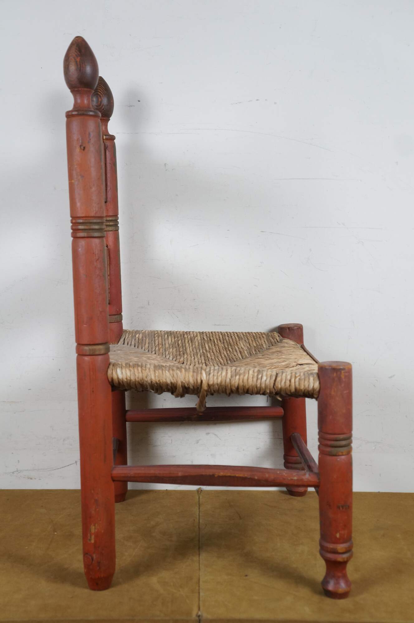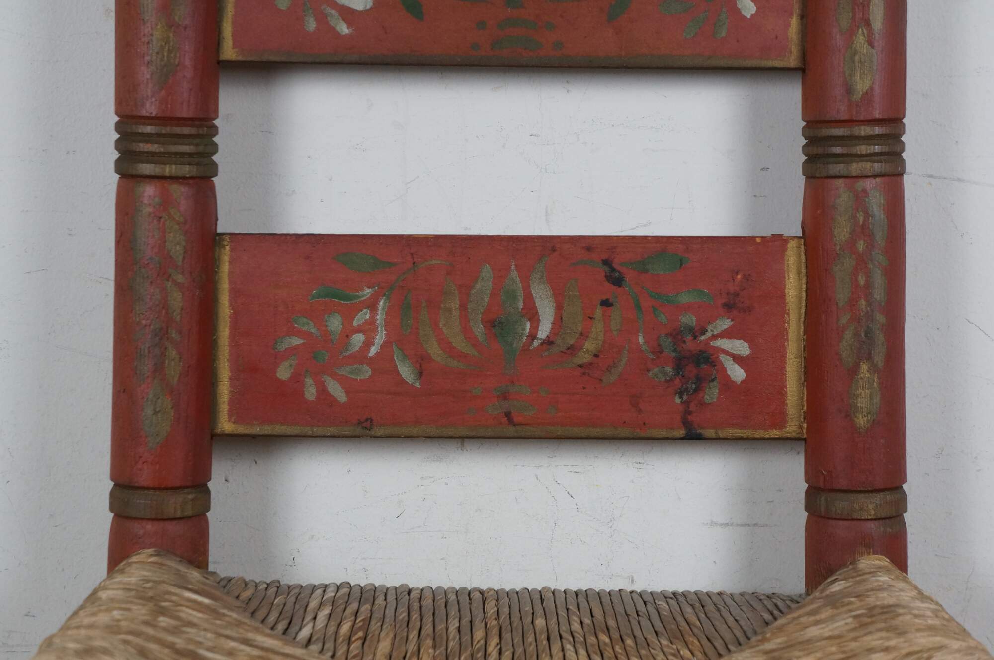 Structurally solid, paint distressing / wear throughout; missing rush/discoloration to seat